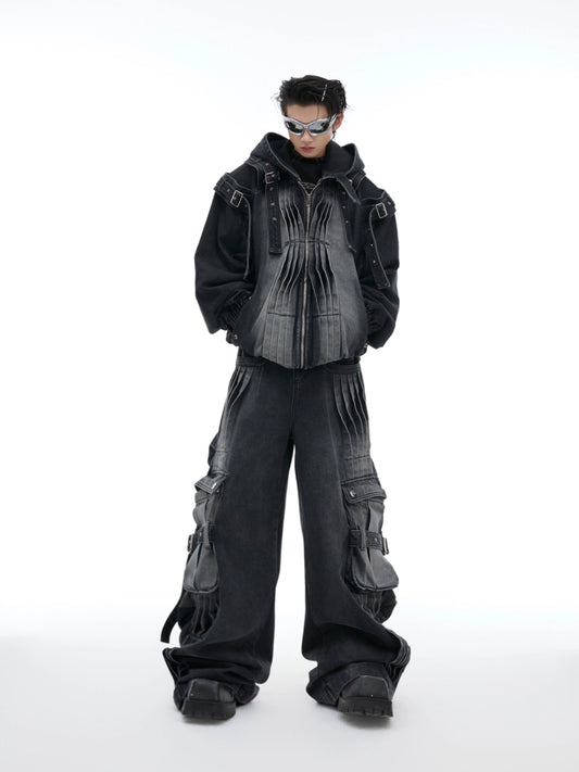 Heavyweight Zipper Denim Hooded Jacket & Wide Leg Denim Jeans Setup WN8685