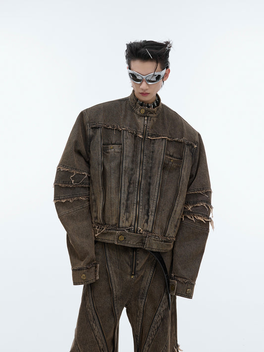 Wrinkles Sleeve Stand Neck Denim Jacket & Micro Flare Denim Jeans Setup WN8069