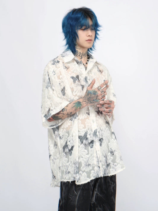 Butterfly Full Print Oversize Sheer Short Sleeve Shirt WN5884