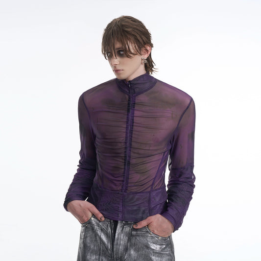 Ruched Mesh Half-High Neck Long Sleeve T-Shirt WN13230