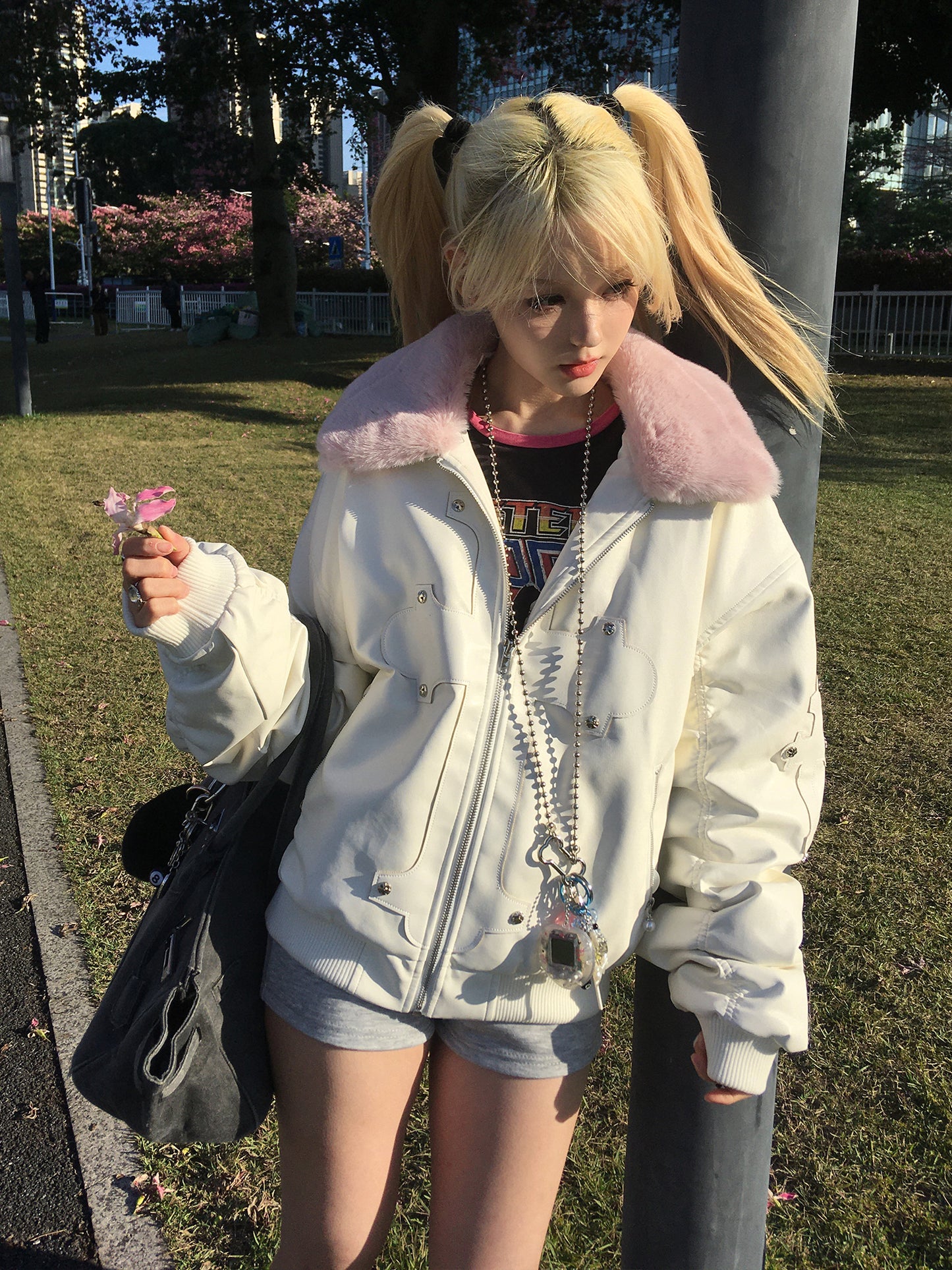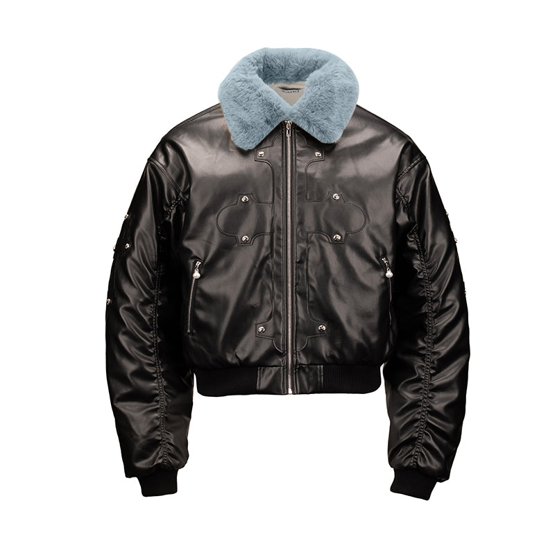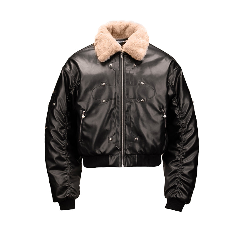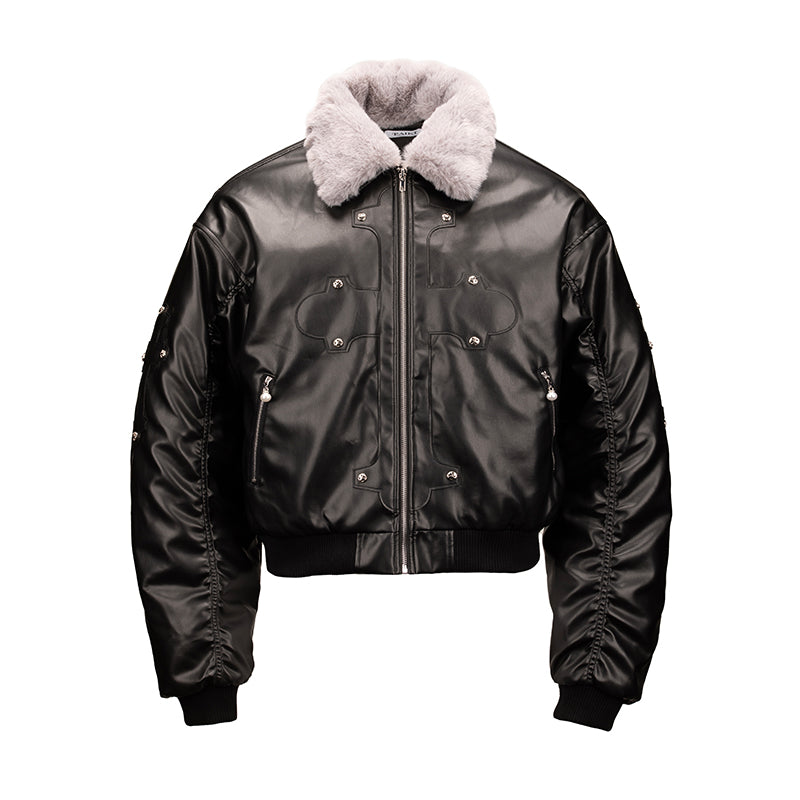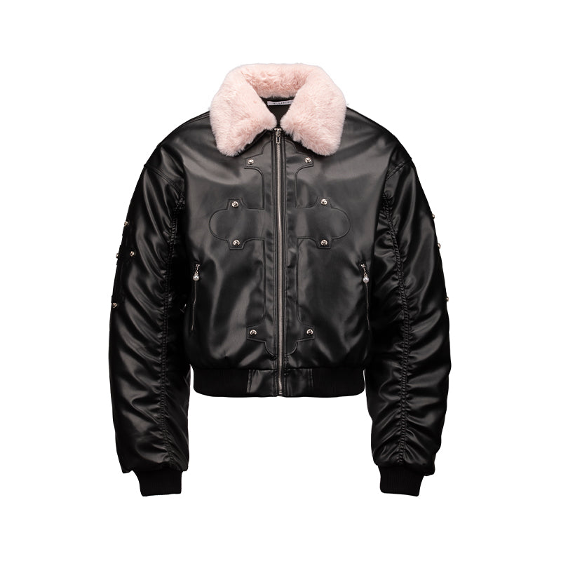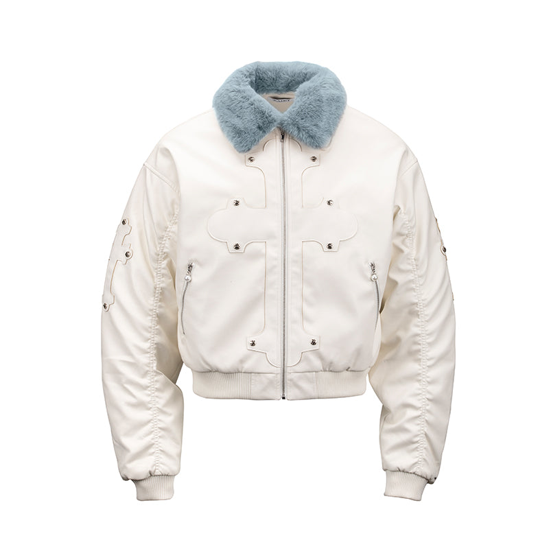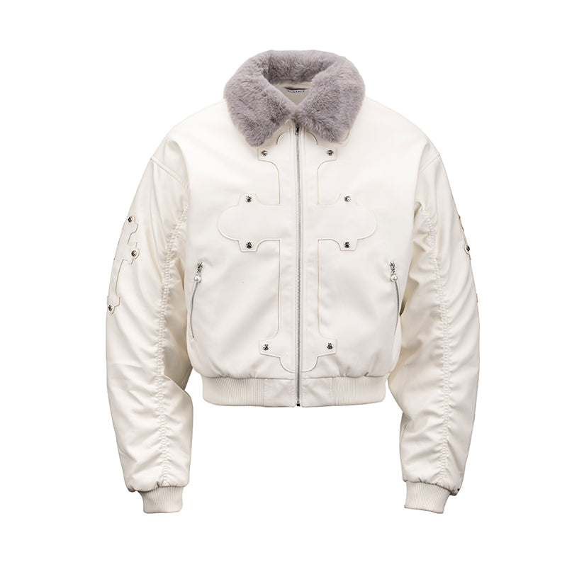 Holy Cross Fake Fur Collar Patchwork PU Leather Bomber Jacket WN15860