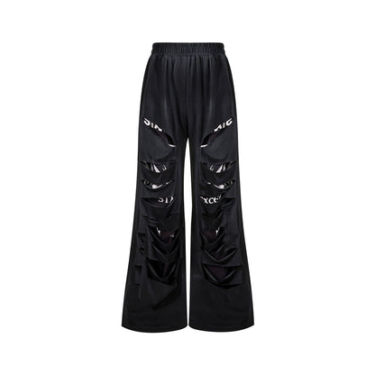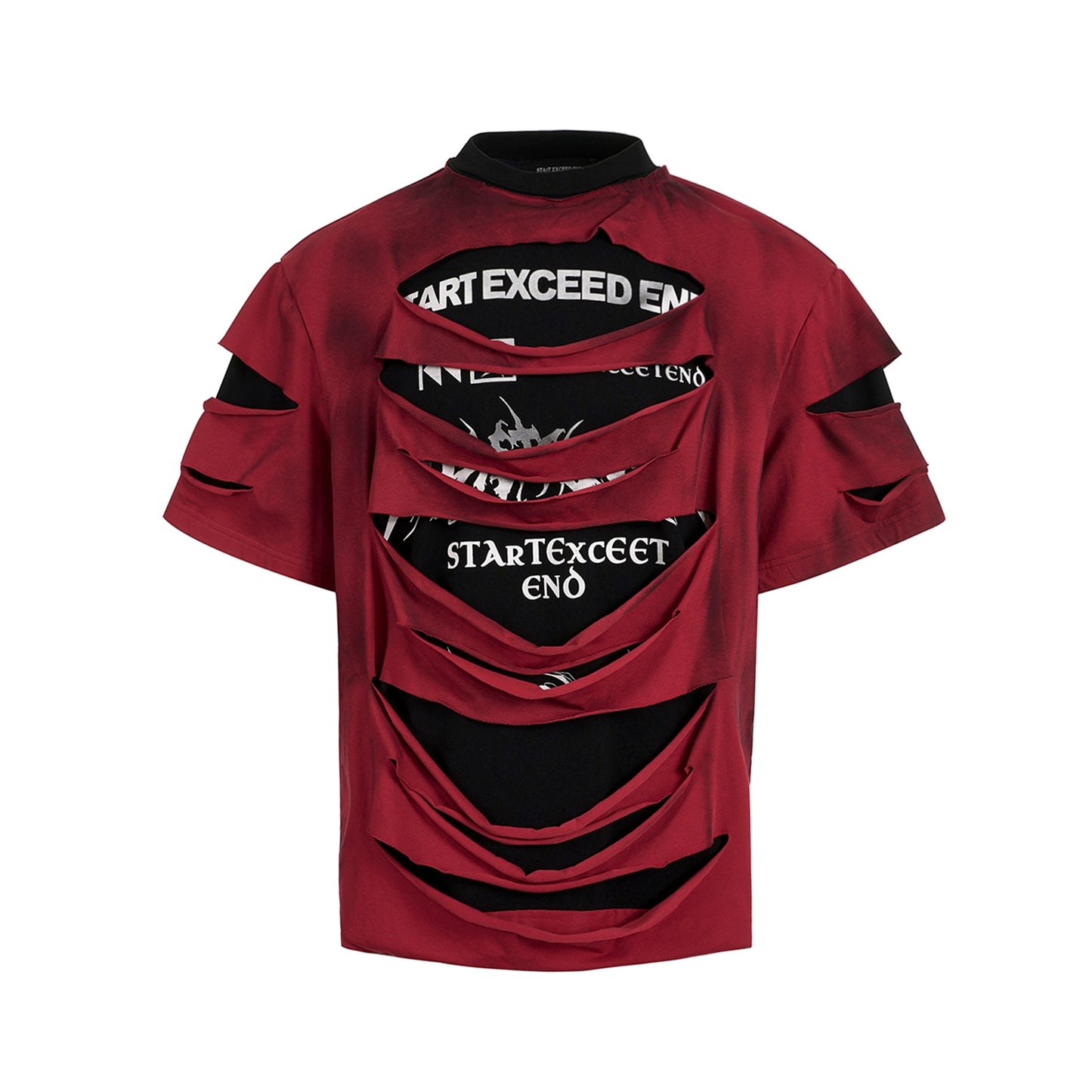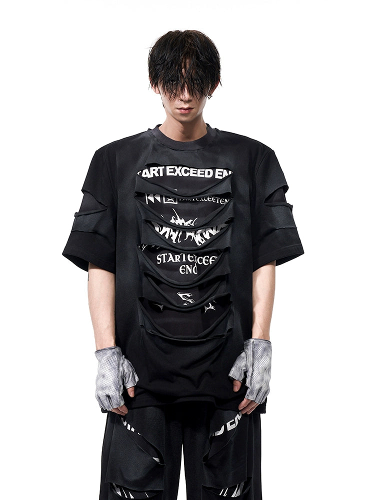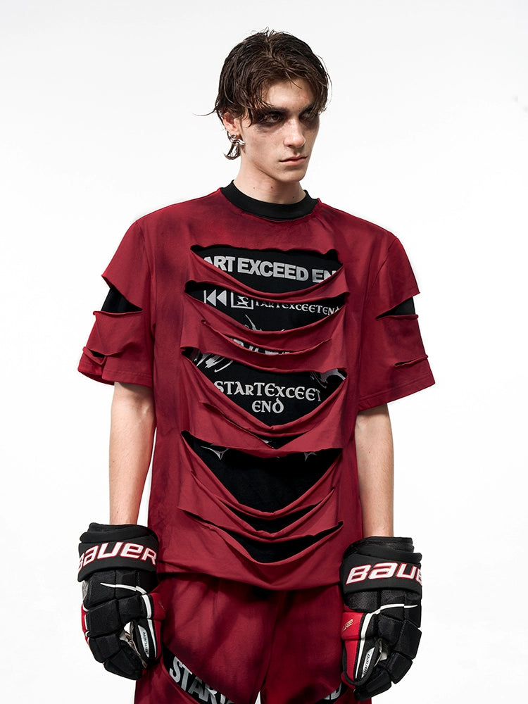 Fake Layered Ripped Spray Print Short Sleeve T-Shirt & Micro Flare Pants Setup WN16576