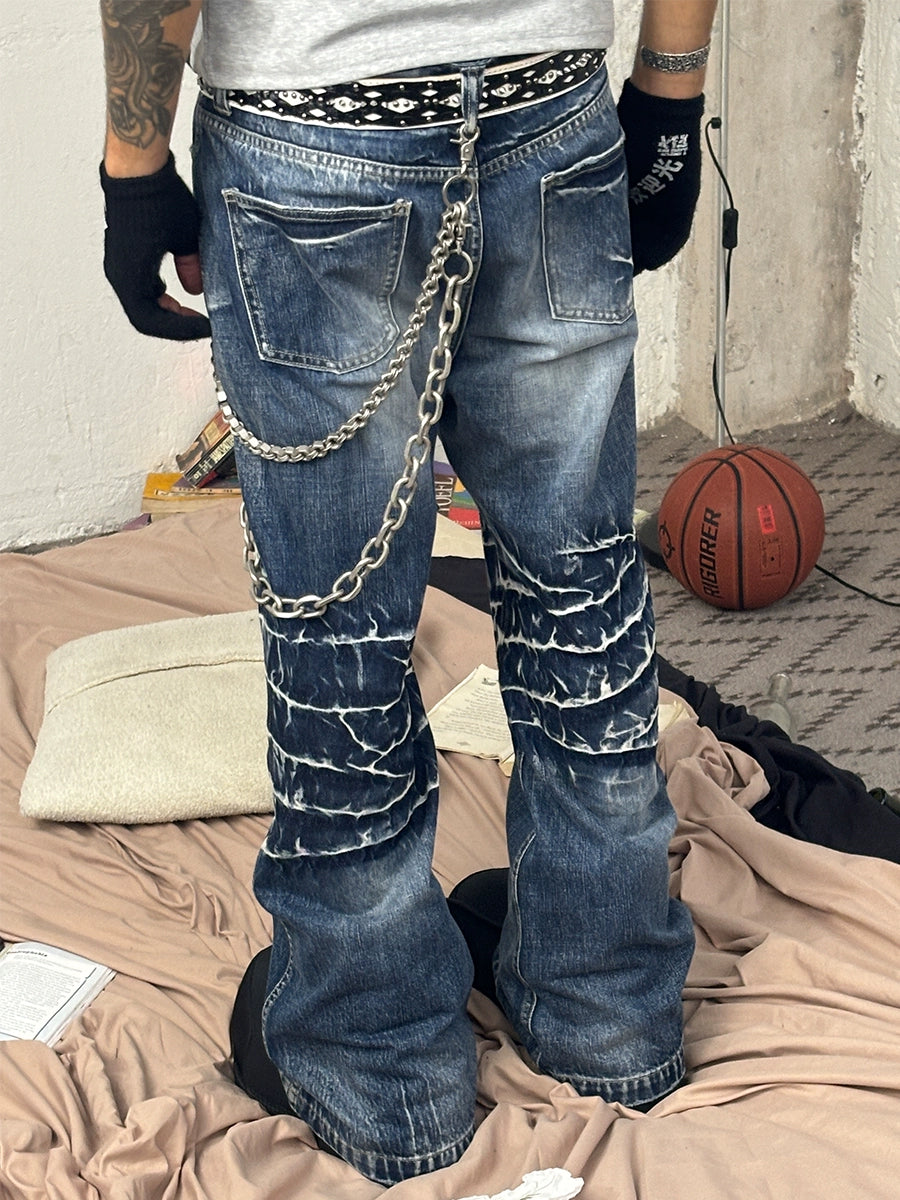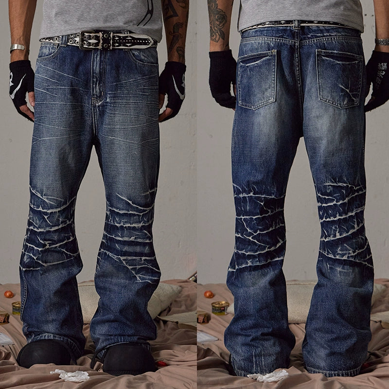 Lightning Wave Pattern Washed Straight Flare Denim Jeans WN17034