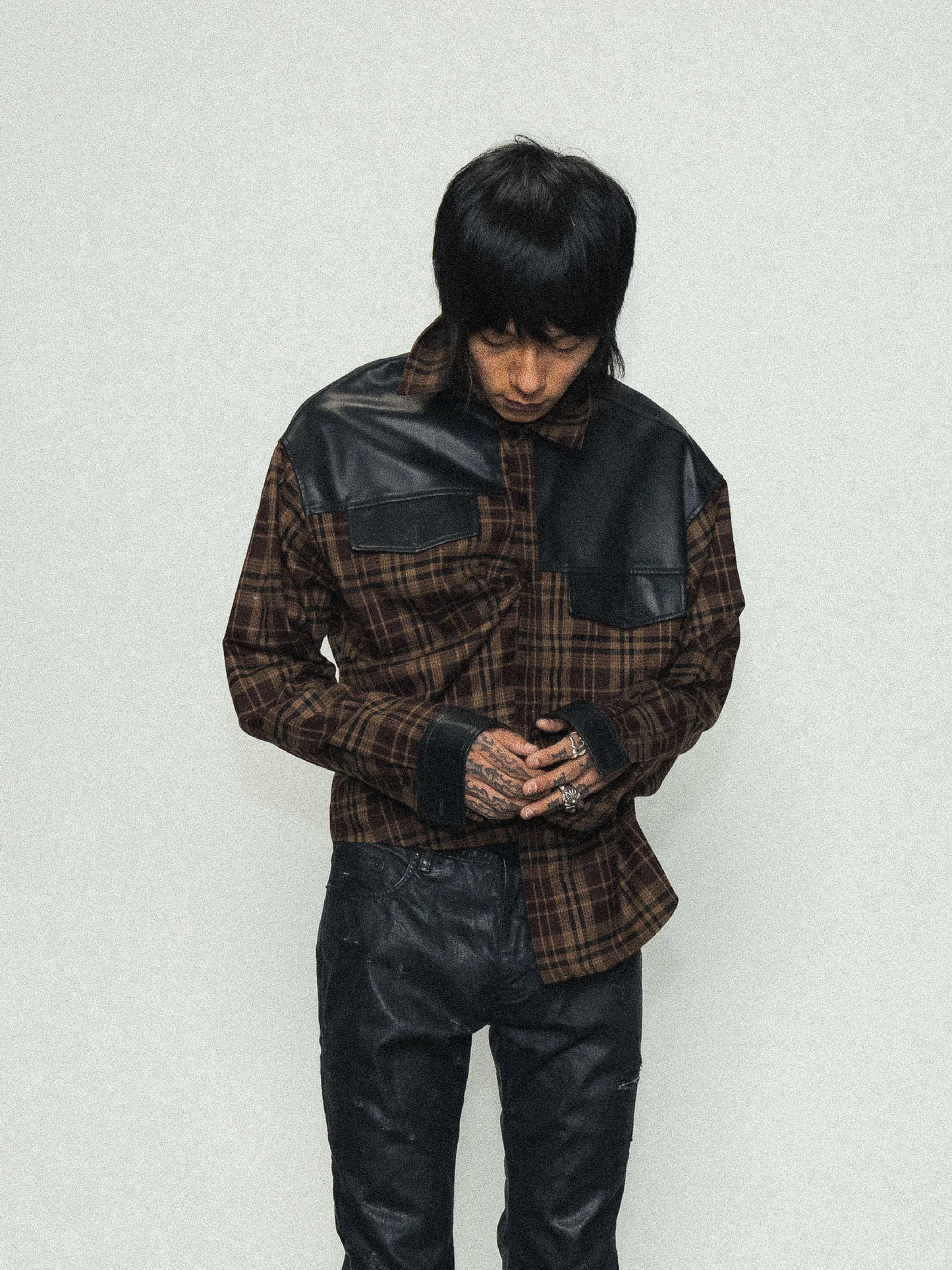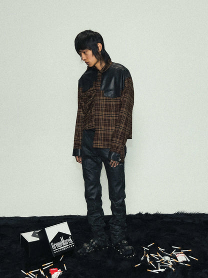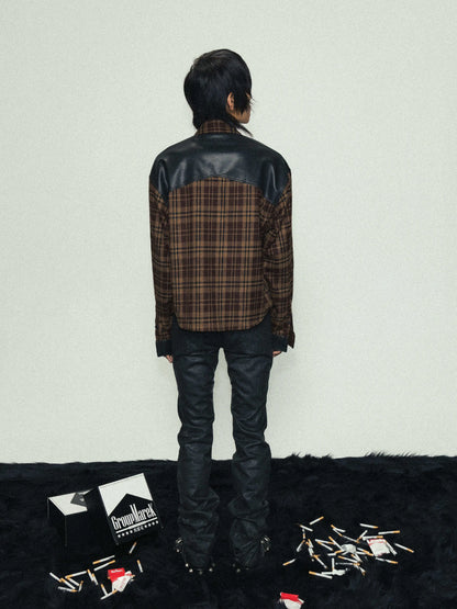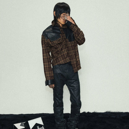 Brown Plaid Fake Leather Mix Graphic Long Sleeve Shirt WN17227