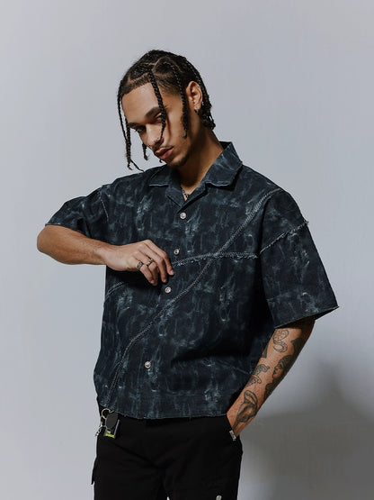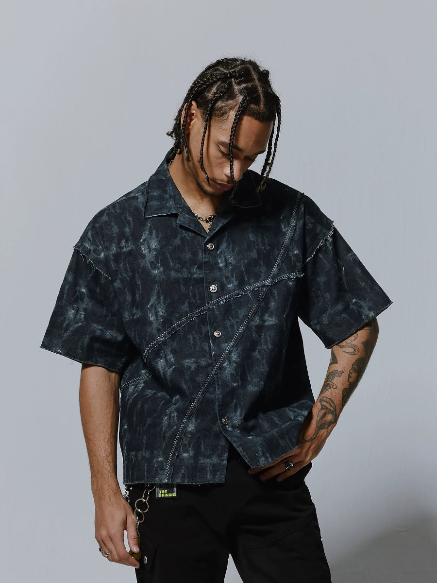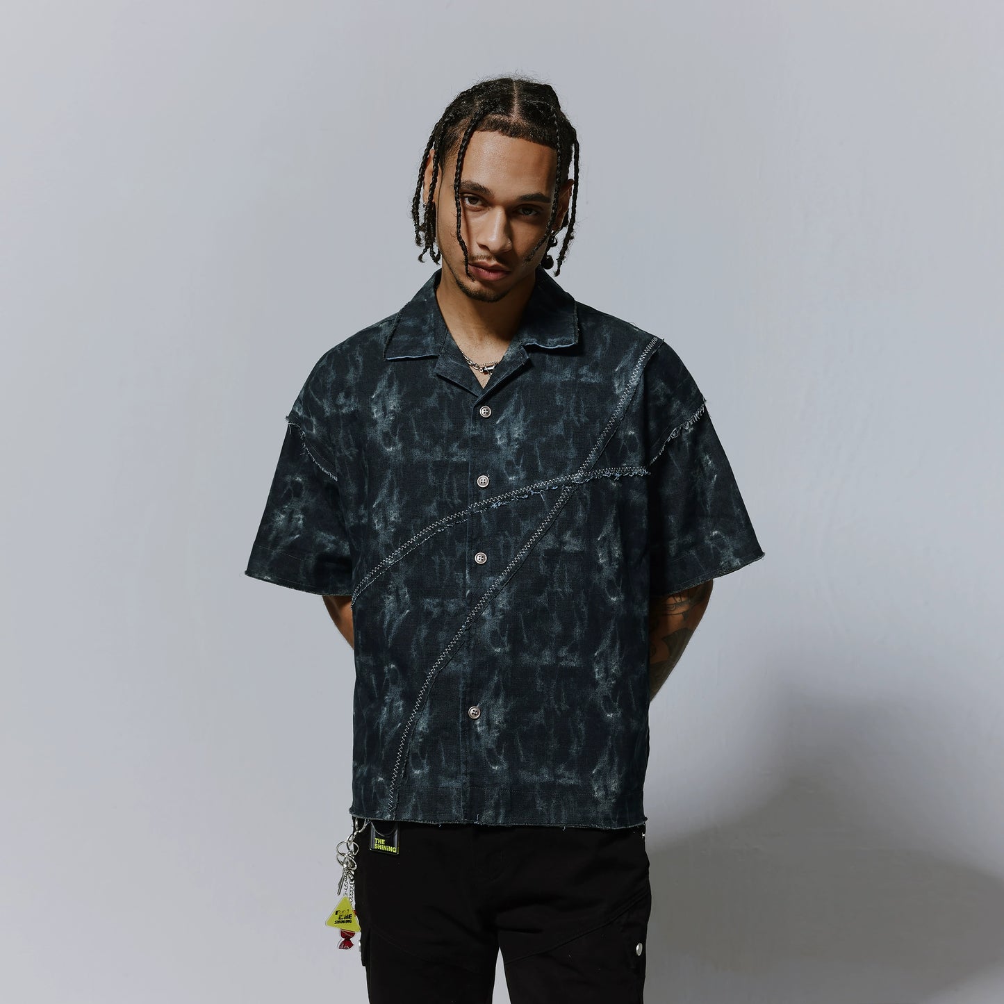 Ink Print Patchwork Spread-Collar Short Sleeve Shirt WN17520
