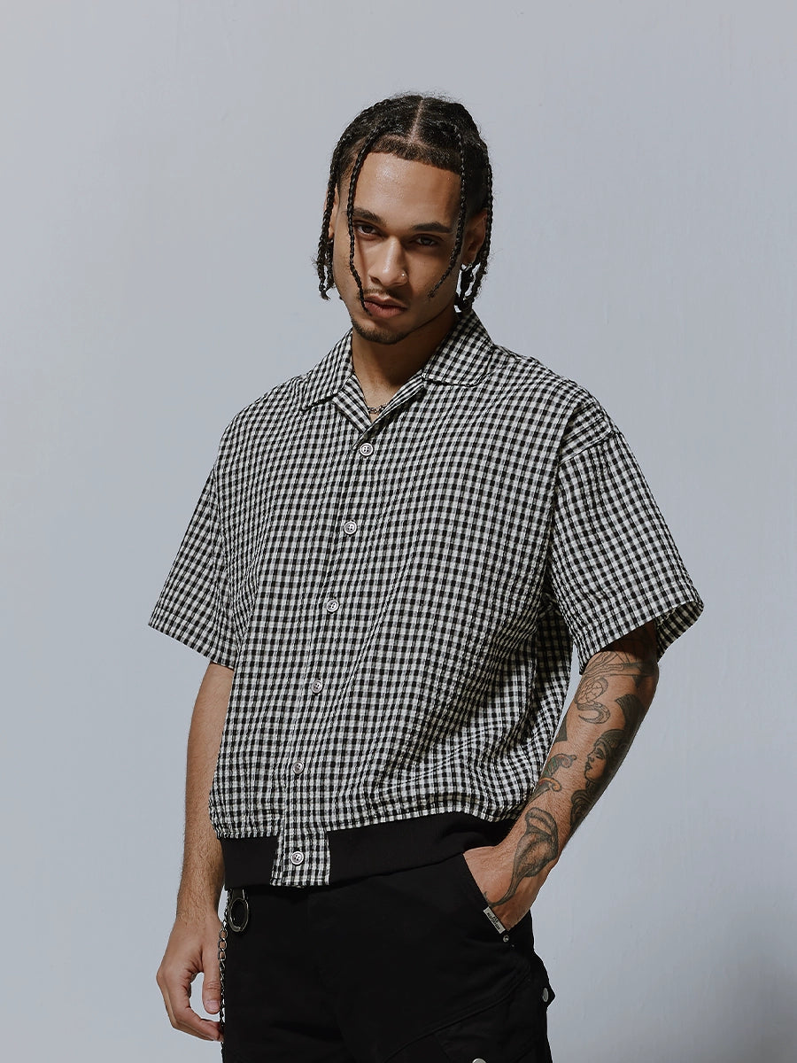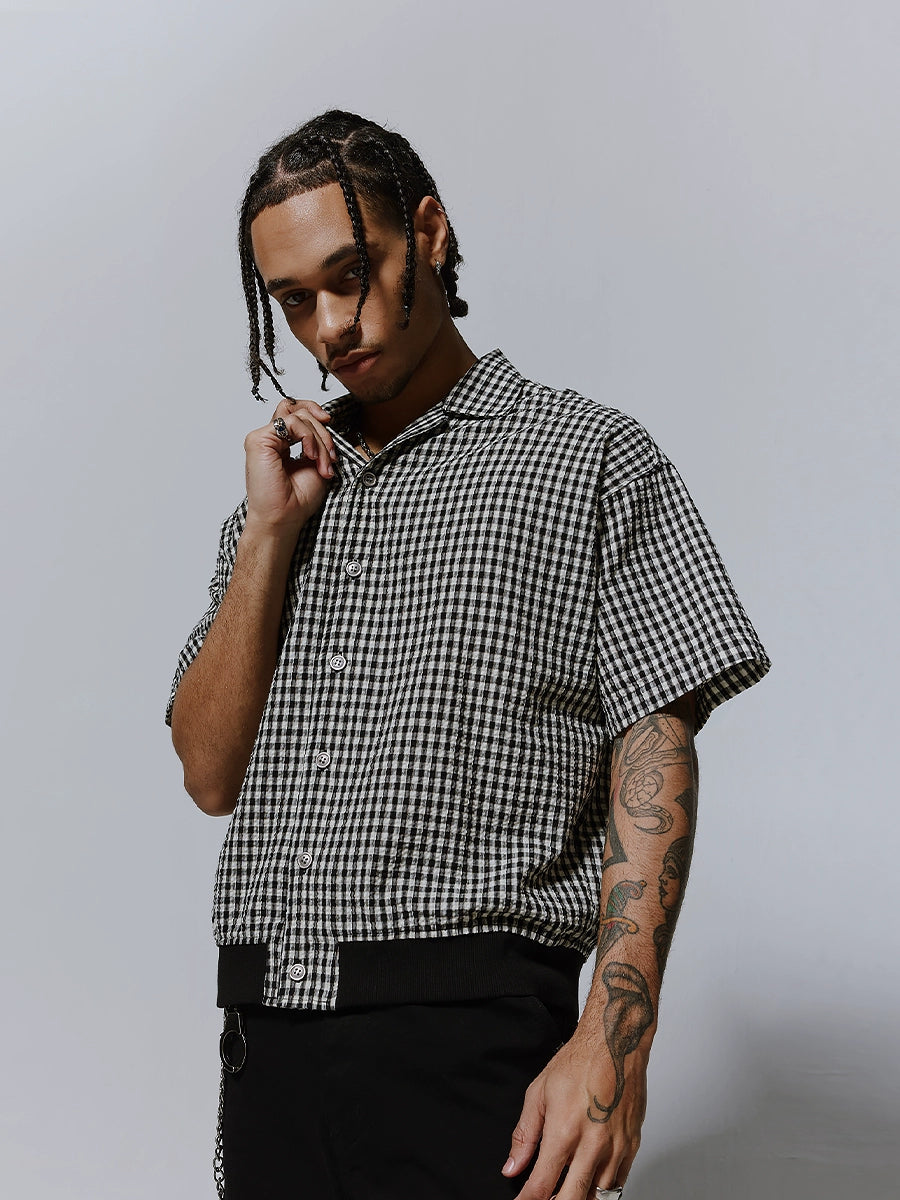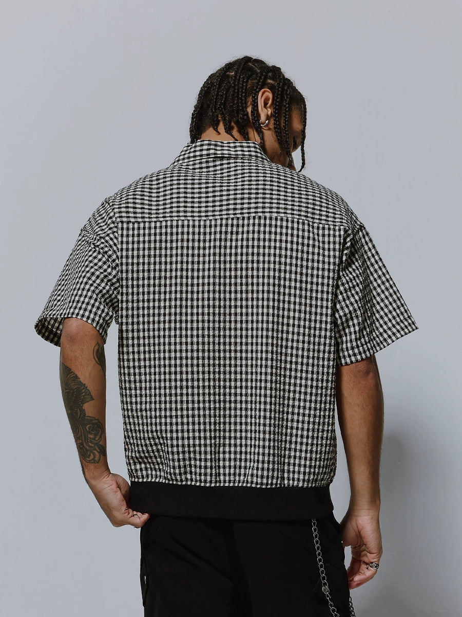 Plaid Oversize Ribbed Hem Turn-Down Collar Short Sleeve Shirt WN17588