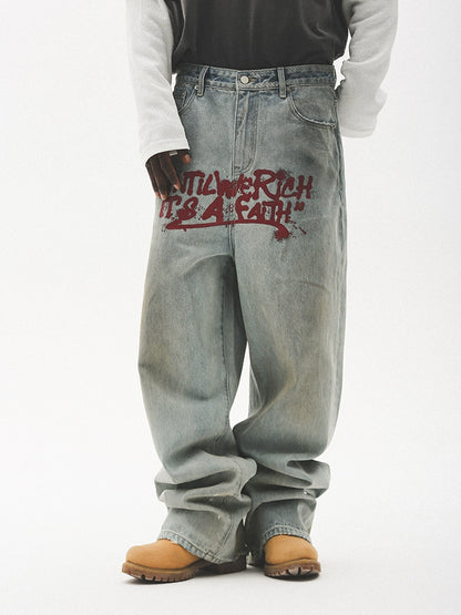 Washed Graffiti Paint Design Wide Leg Denim Jeans WN17792