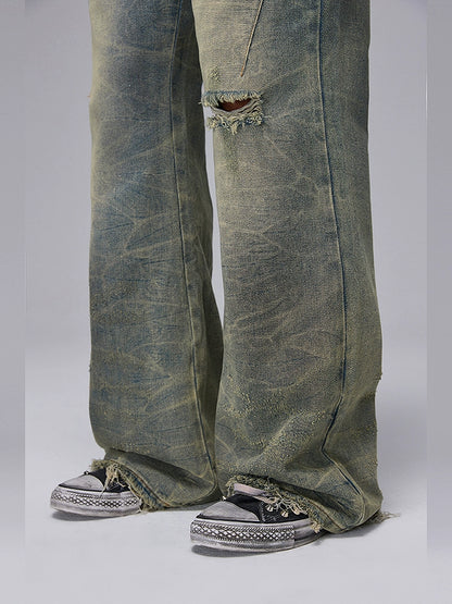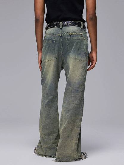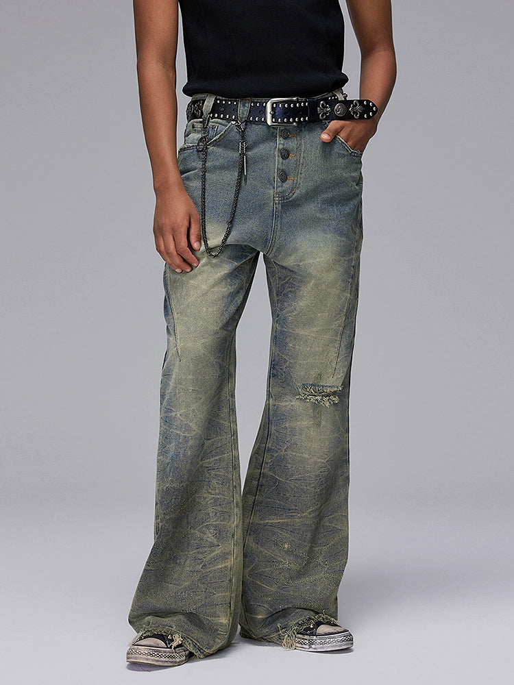 Washed Damage Design Flare Raw Hem Denim Jeans WN17880