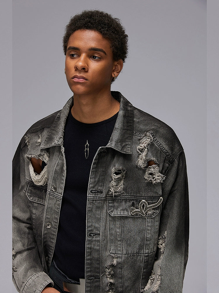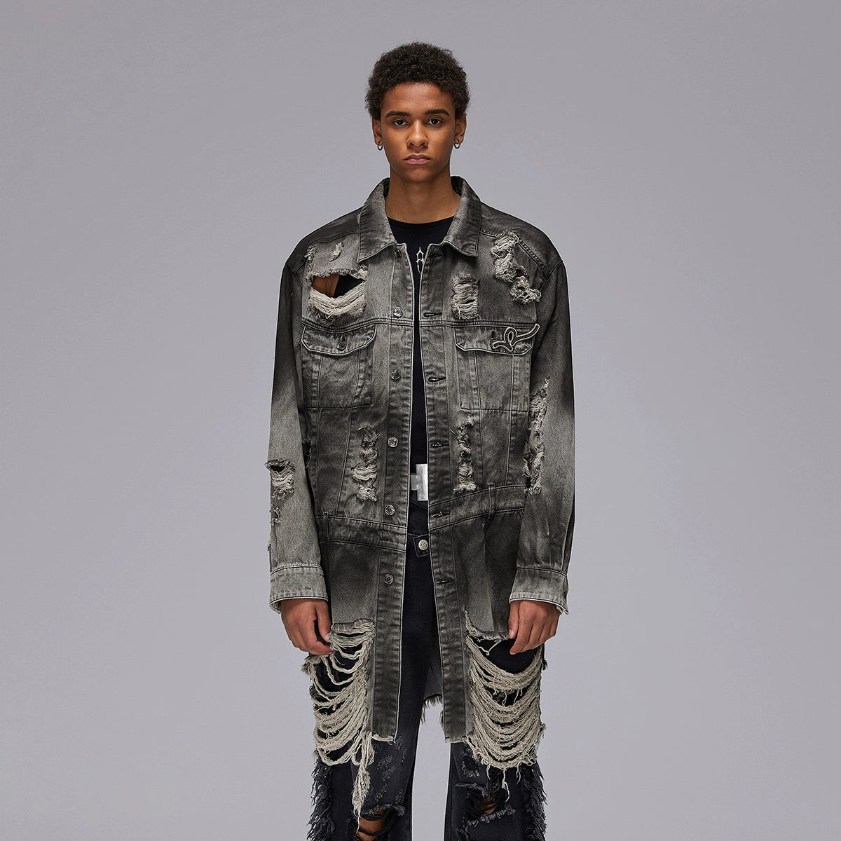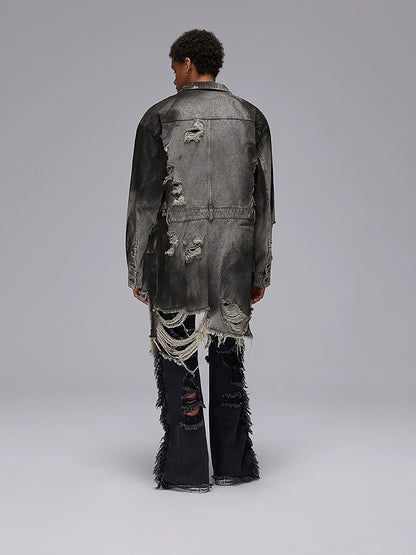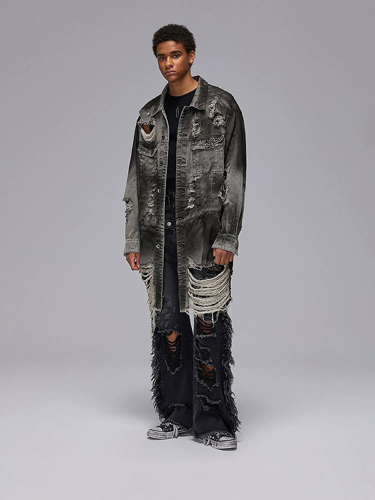 Damage Fringe Oversize Wash Long Sleeve Denim Shirt WN17984