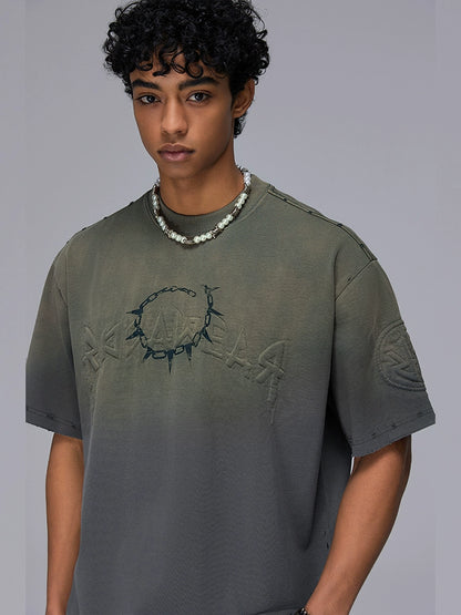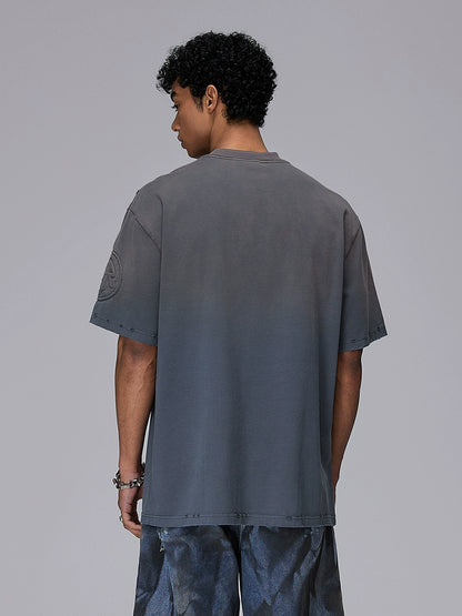 Padded Patch Embroidery Wash Damage Oversize Short Sleeve T-Shirt WN18009
