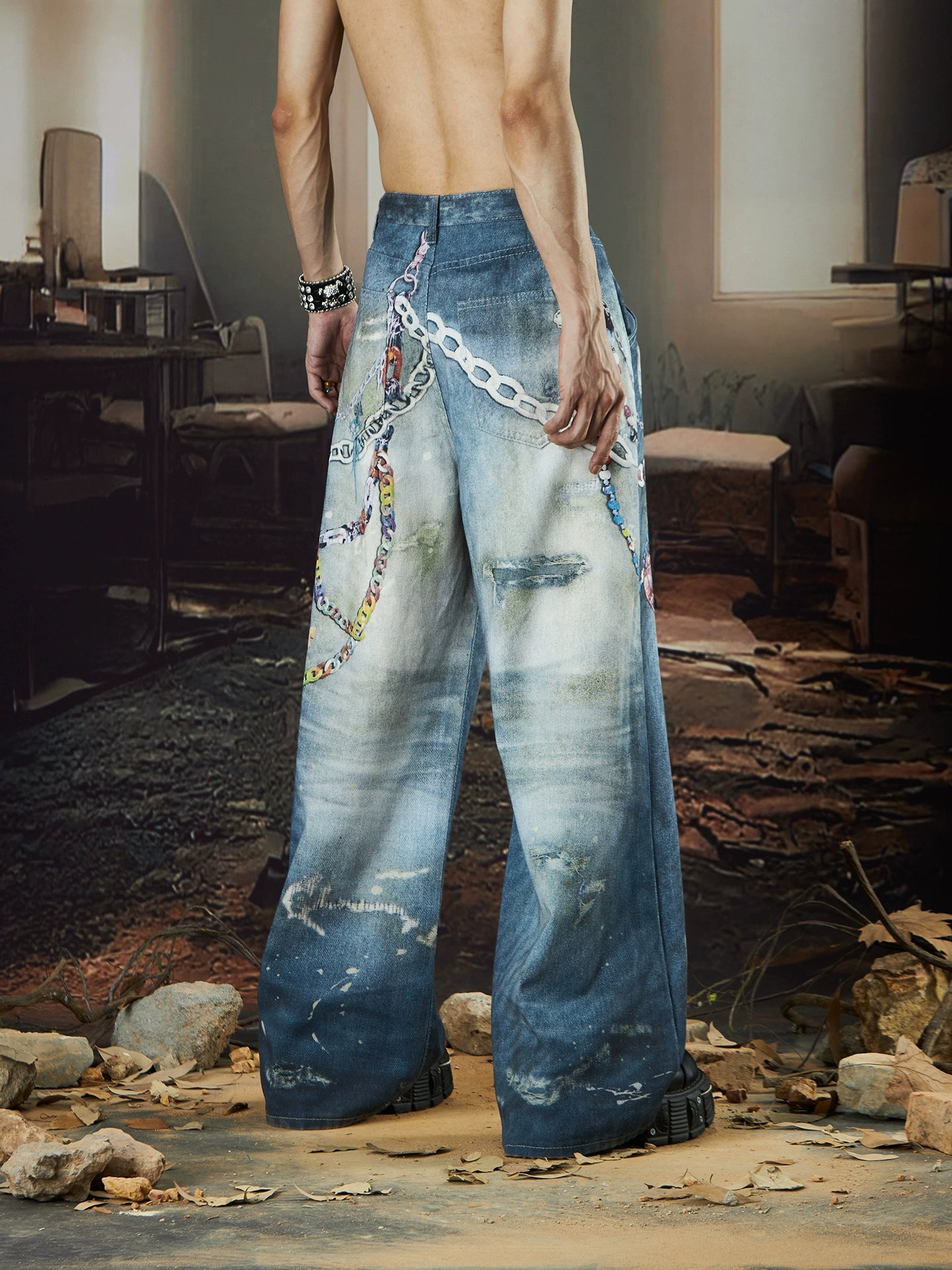 Colorful Chain Print Washed Wide Leg Denim Jeans WN18423