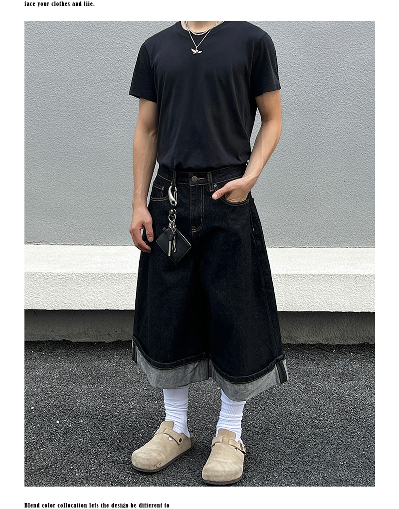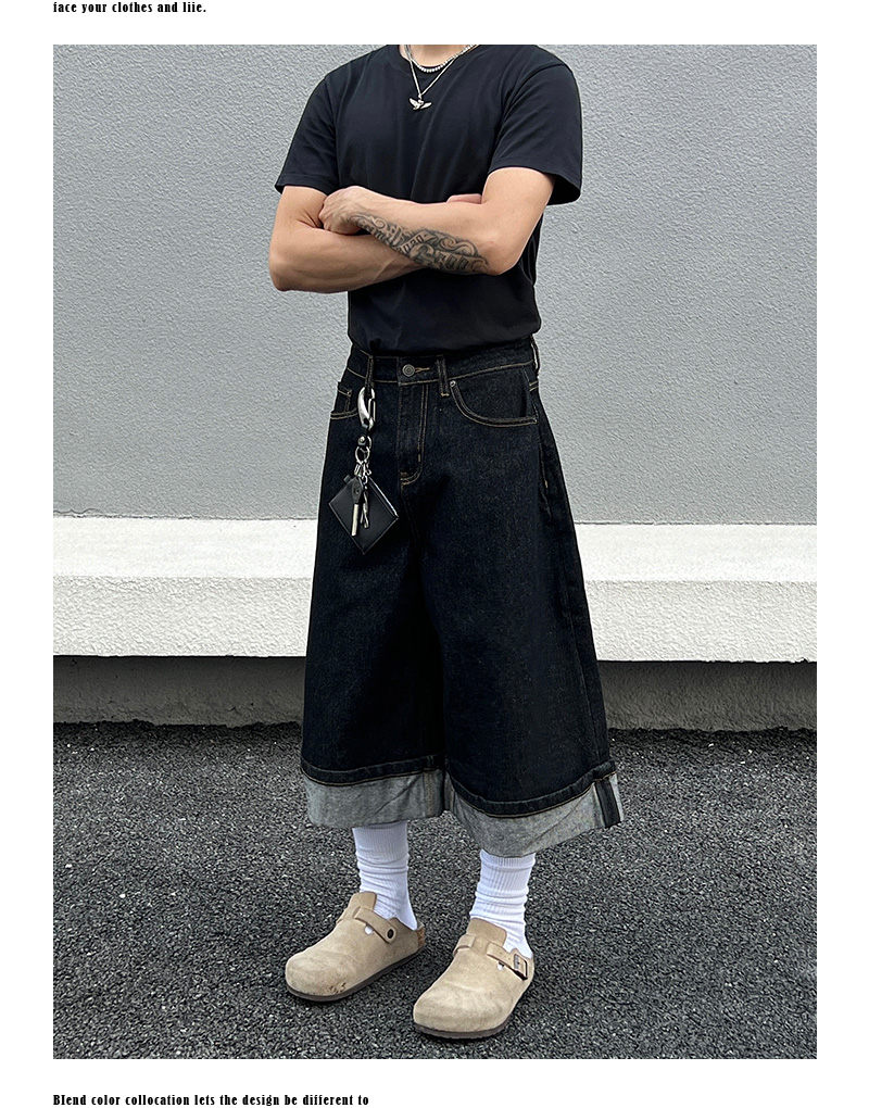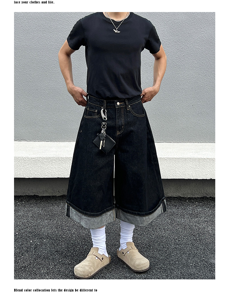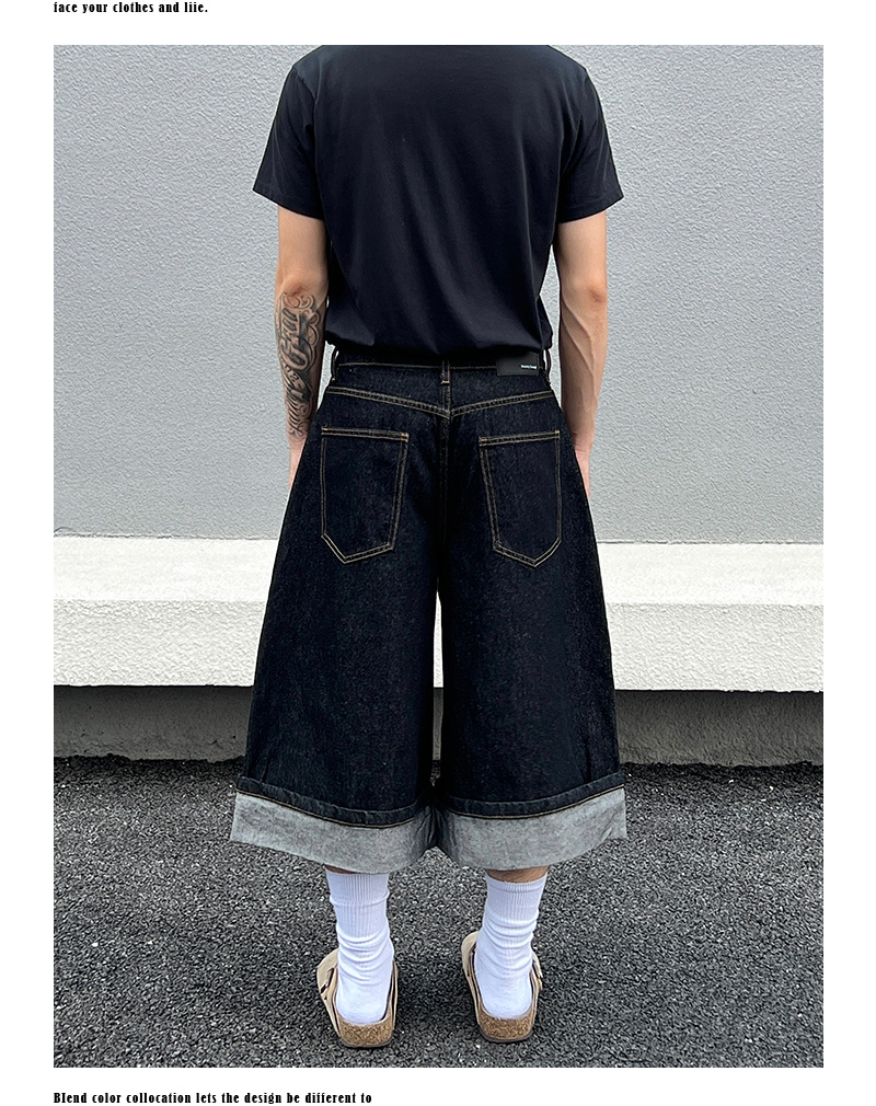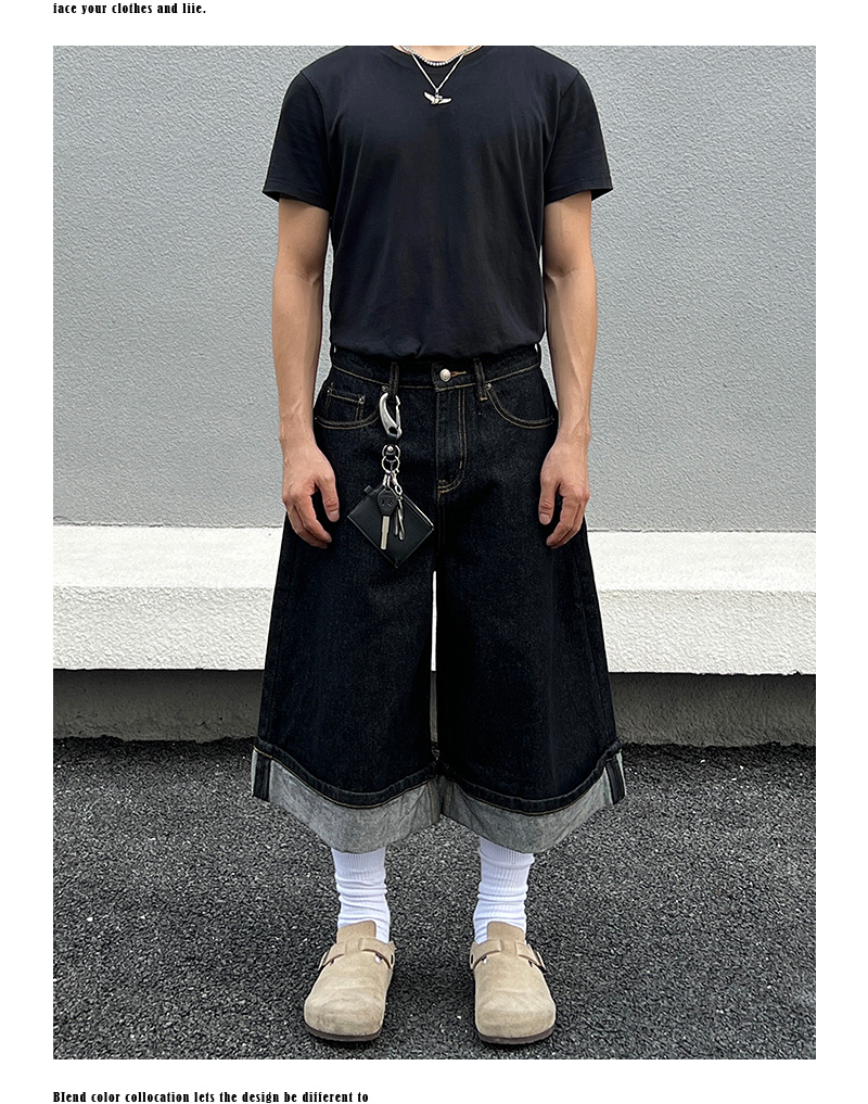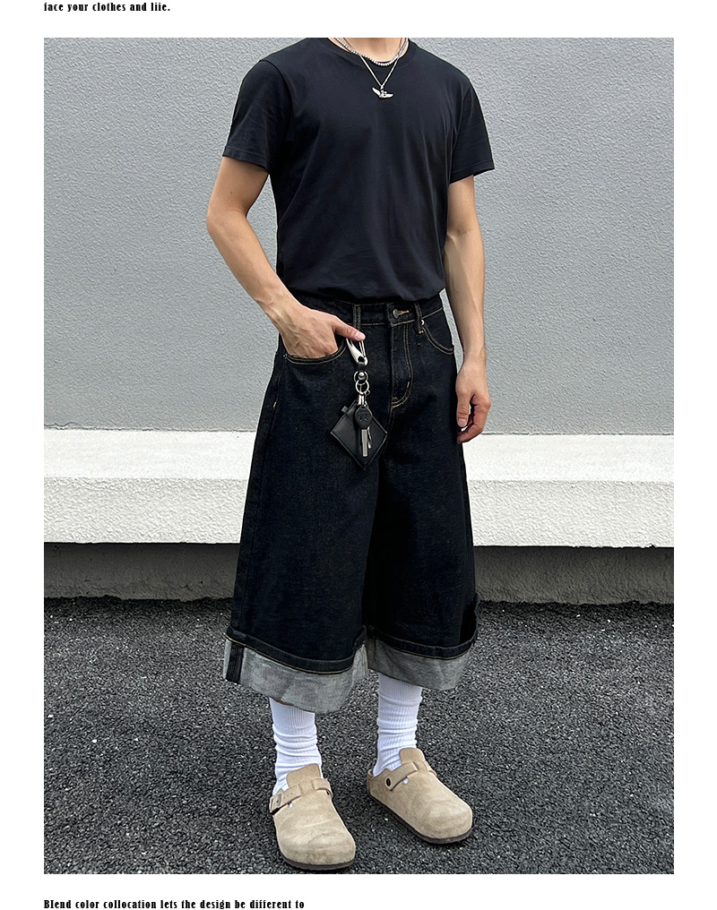 Cuffed Washed Wide Leg Denim Half Jeans WN19458