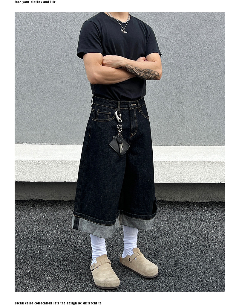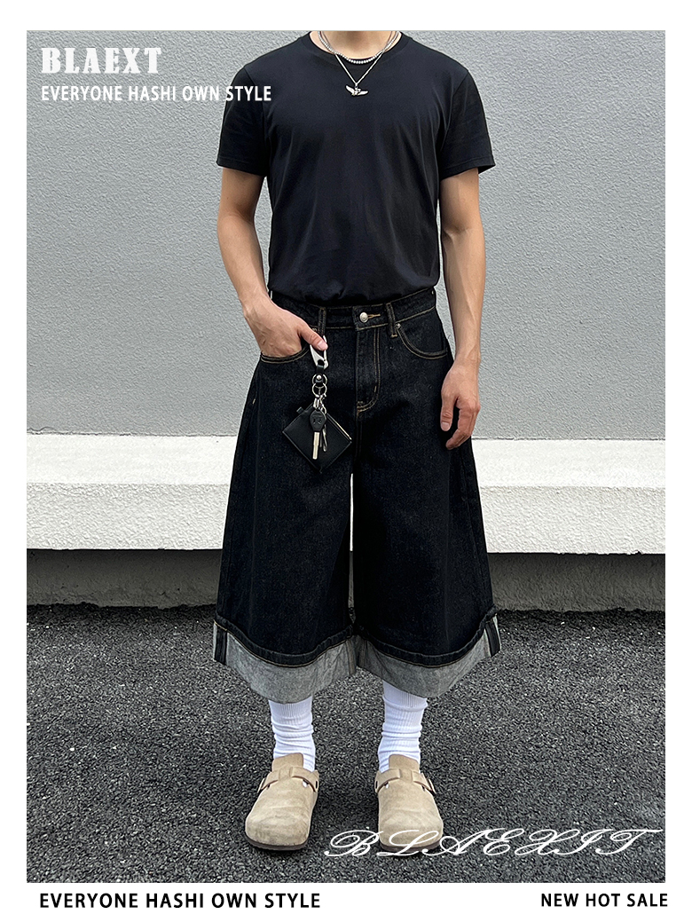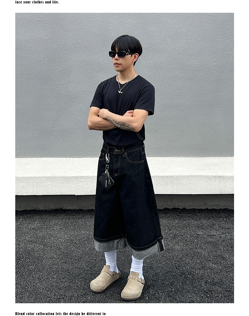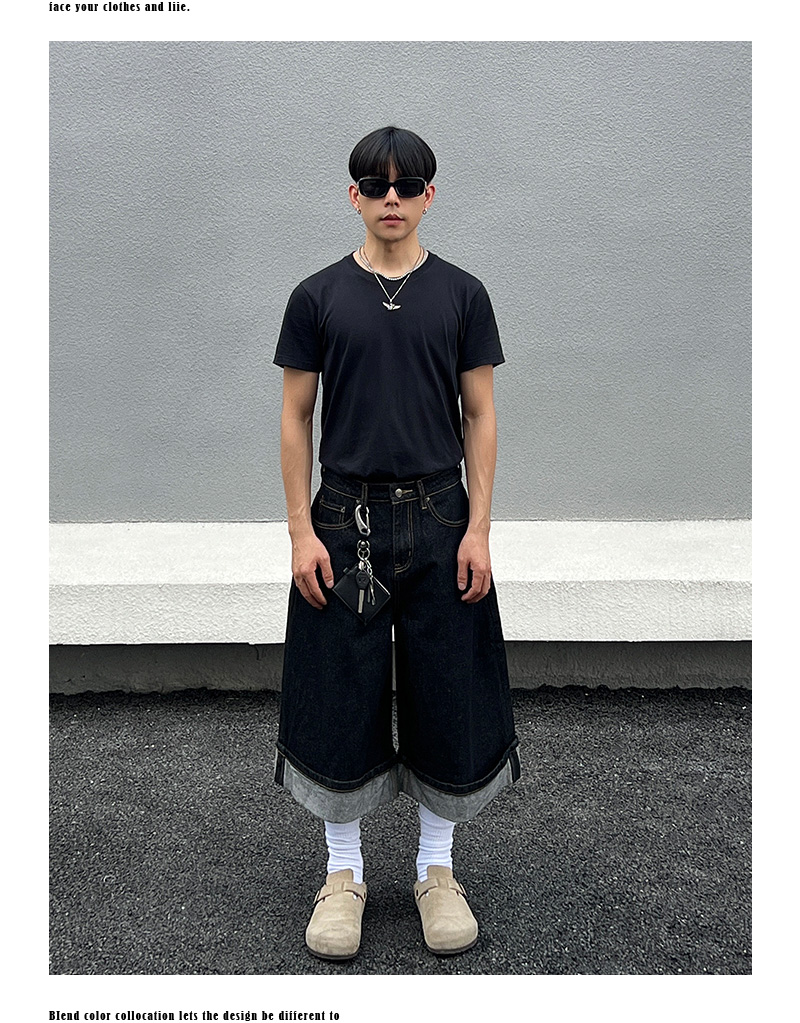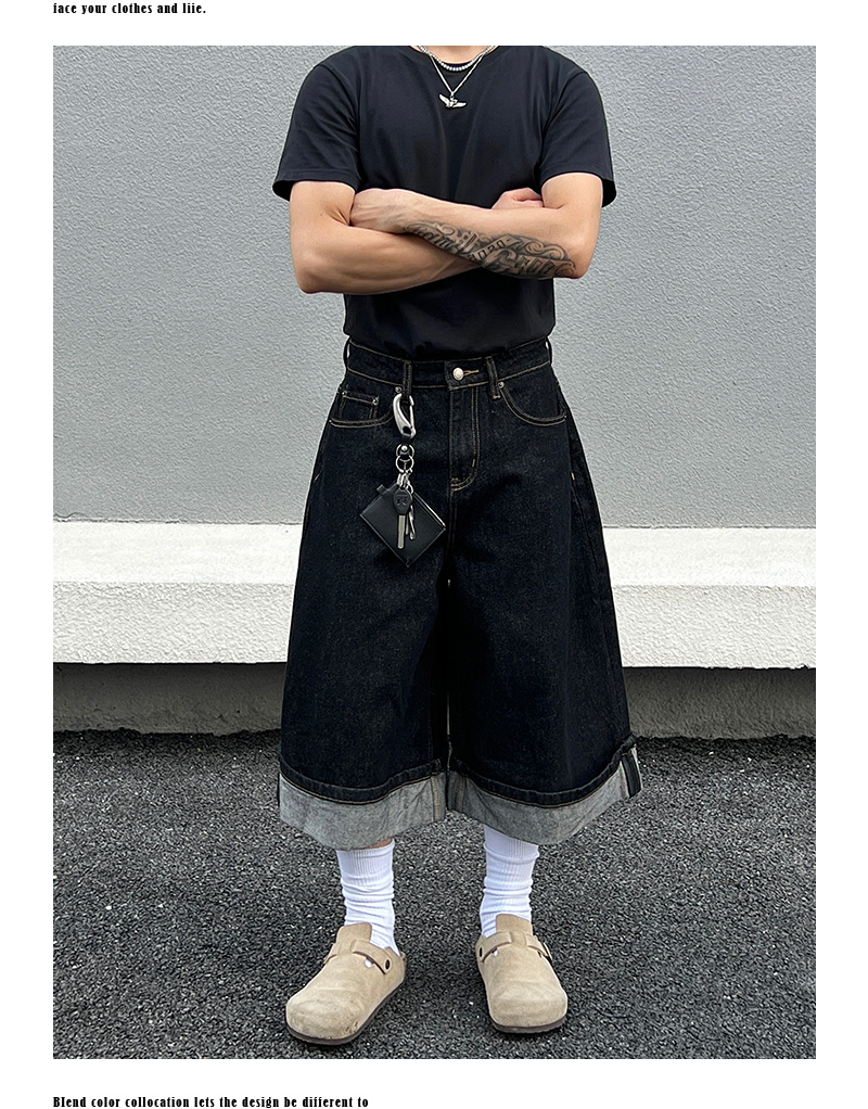 Cuffed Washed Wide Leg Denim Half Jeans WN19458