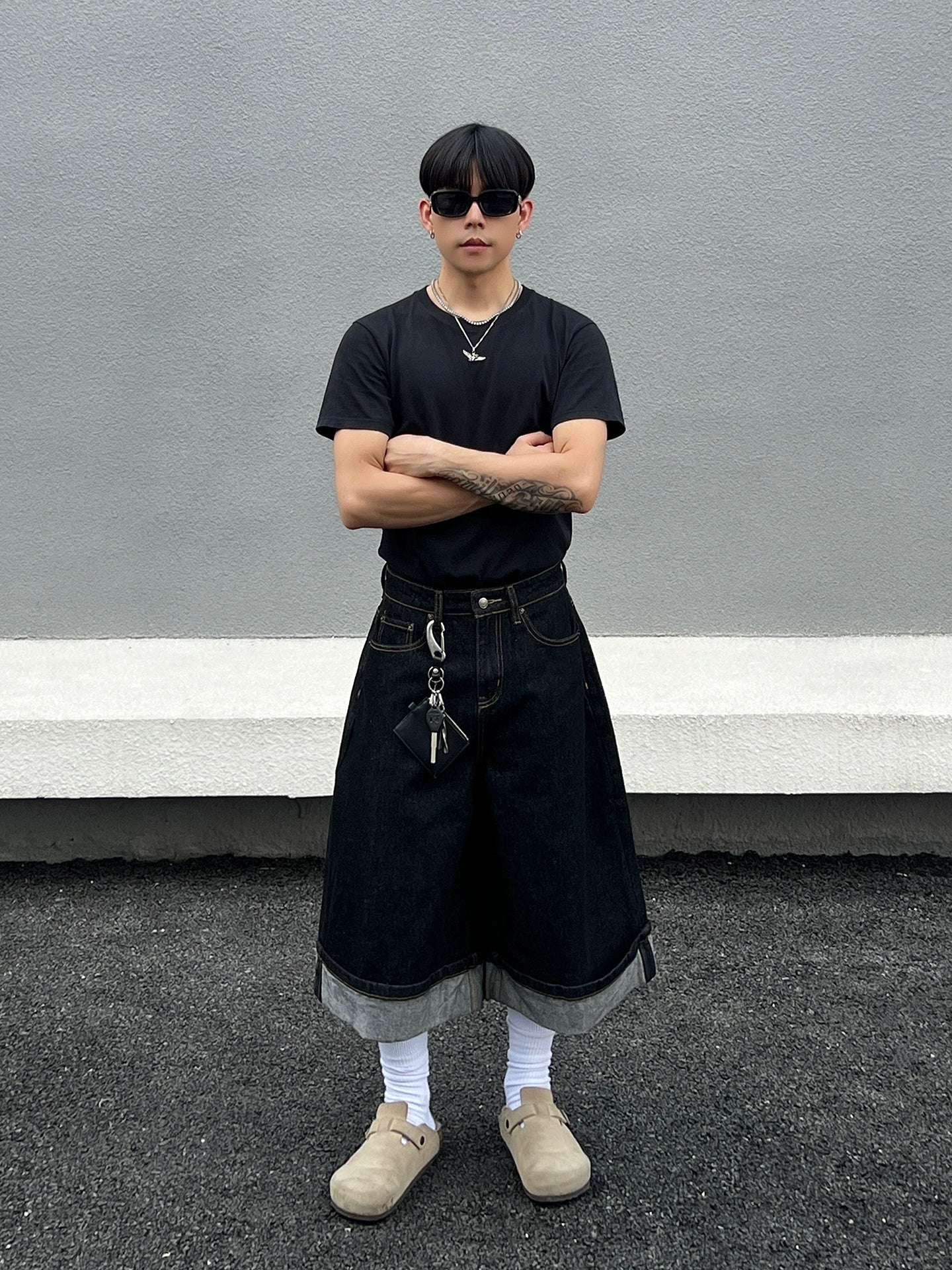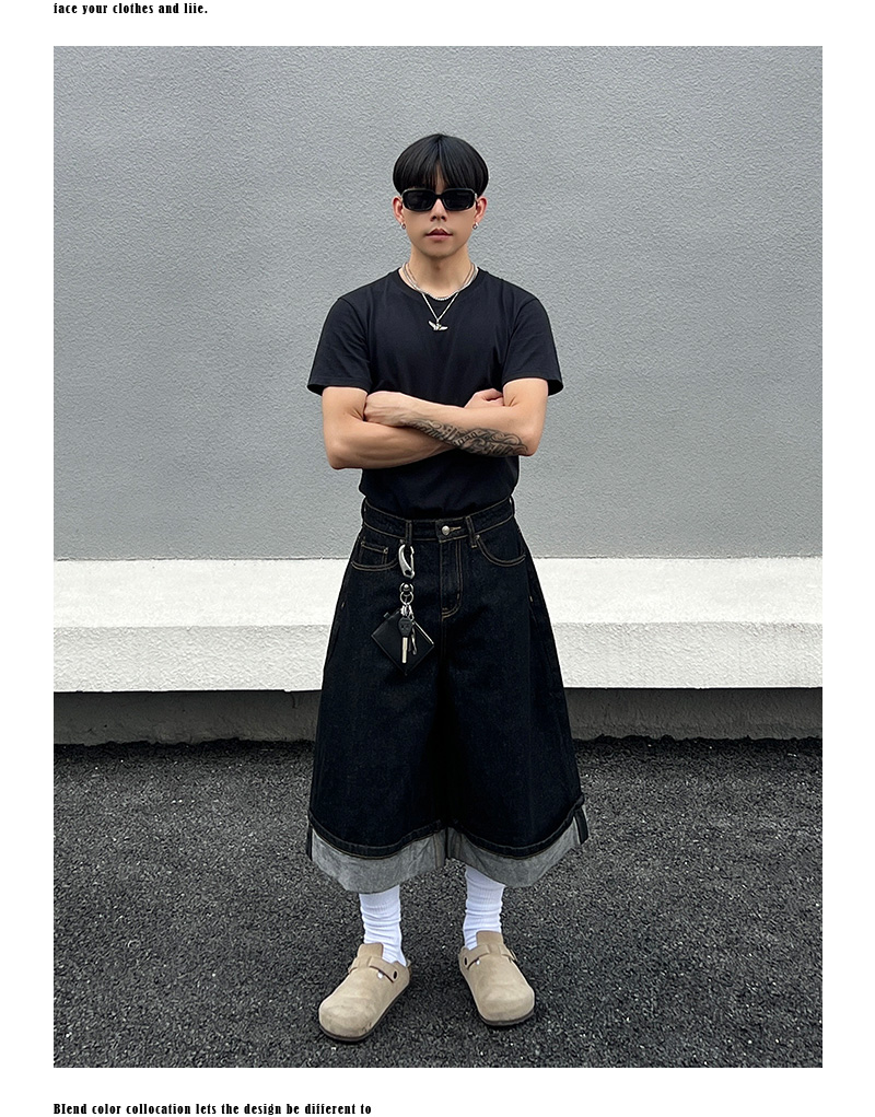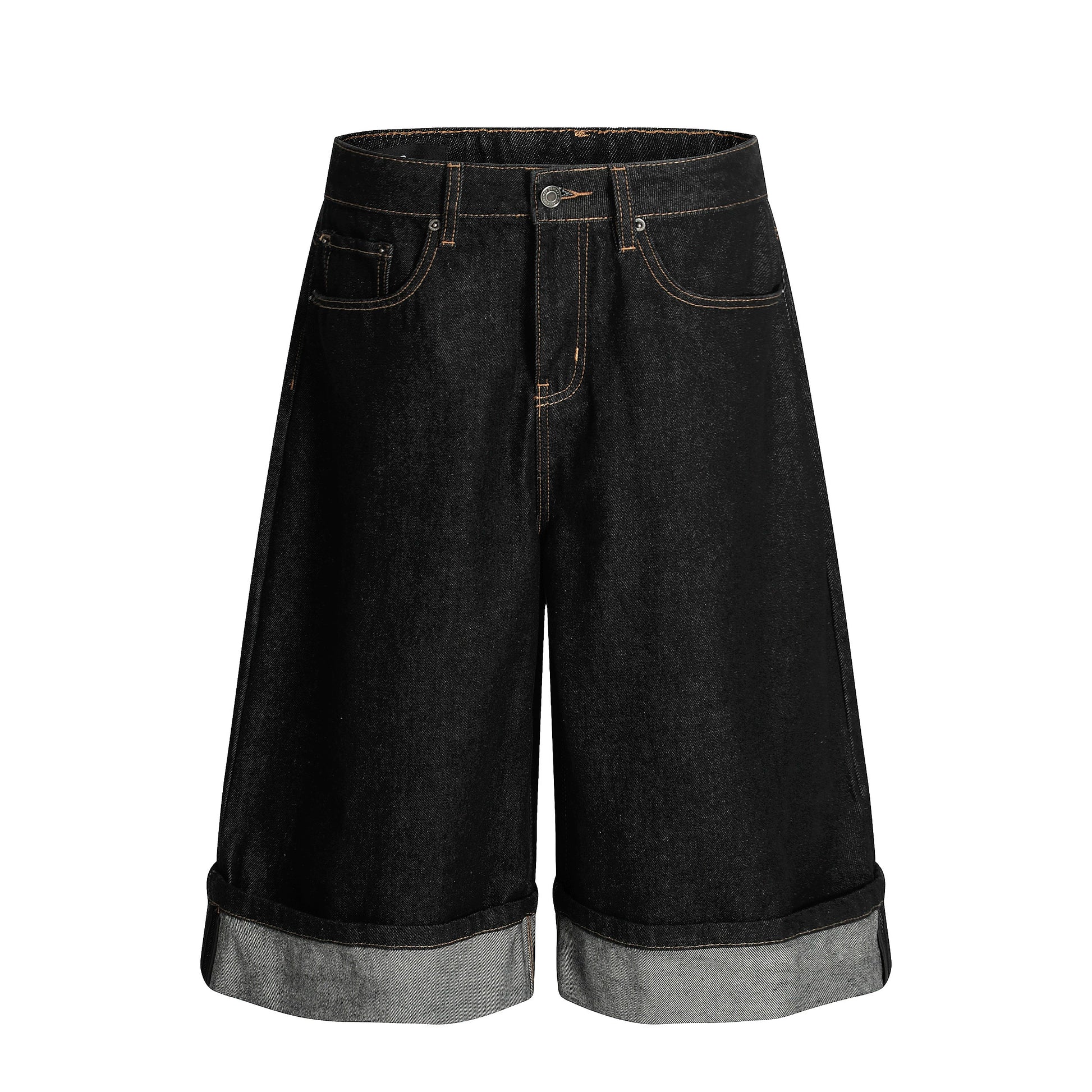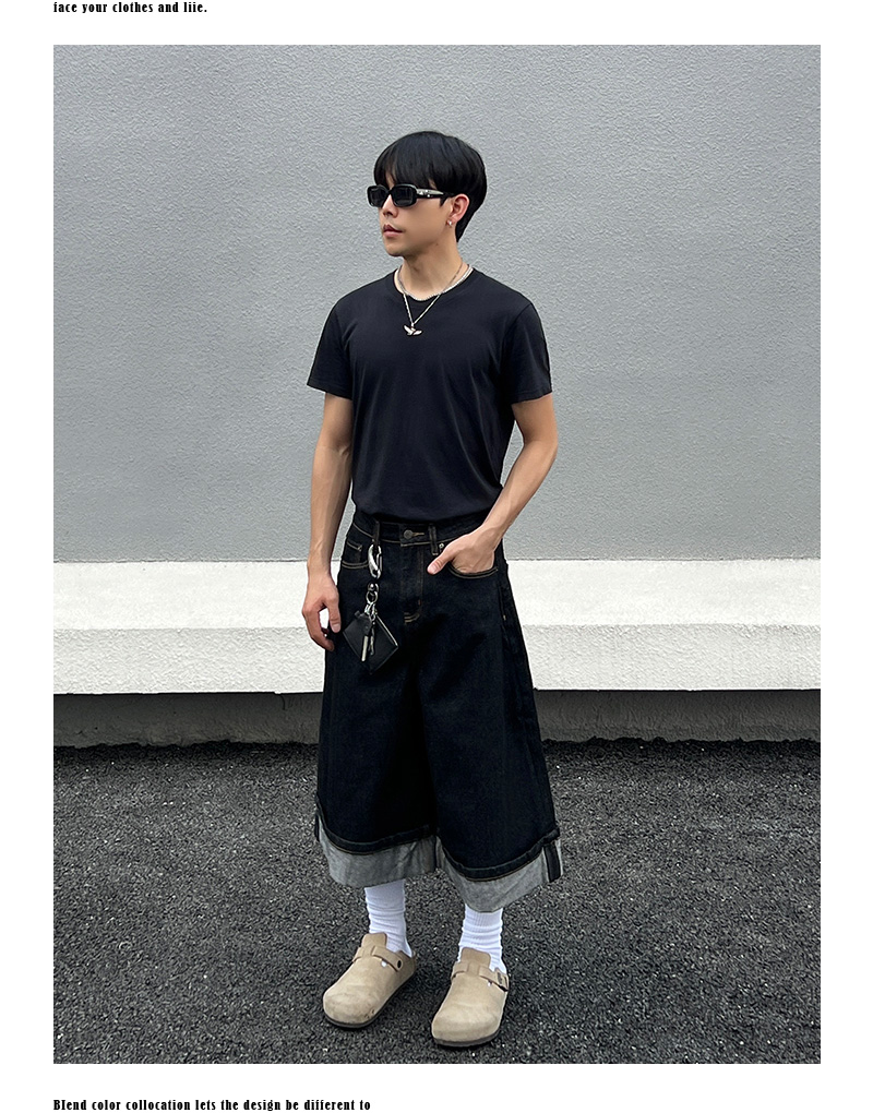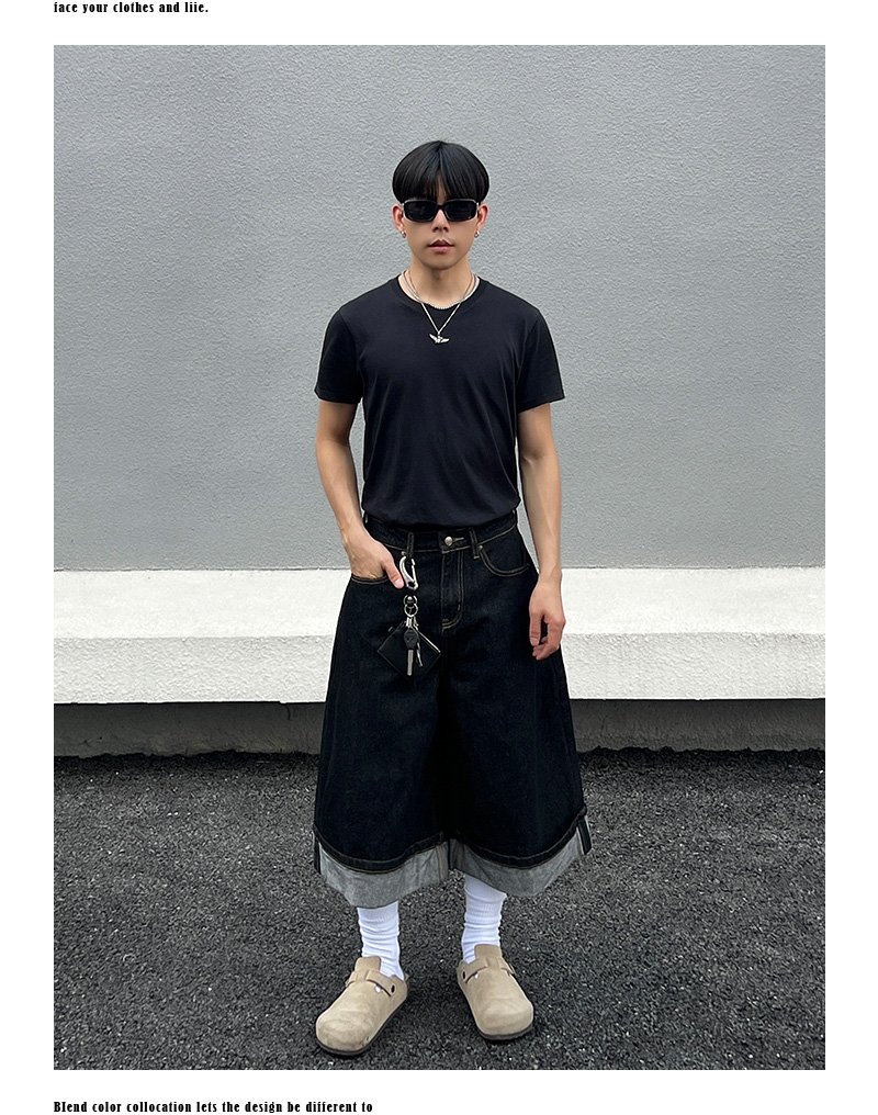 Cuffed Washed Wide Leg Denim Half Jeans WN19458