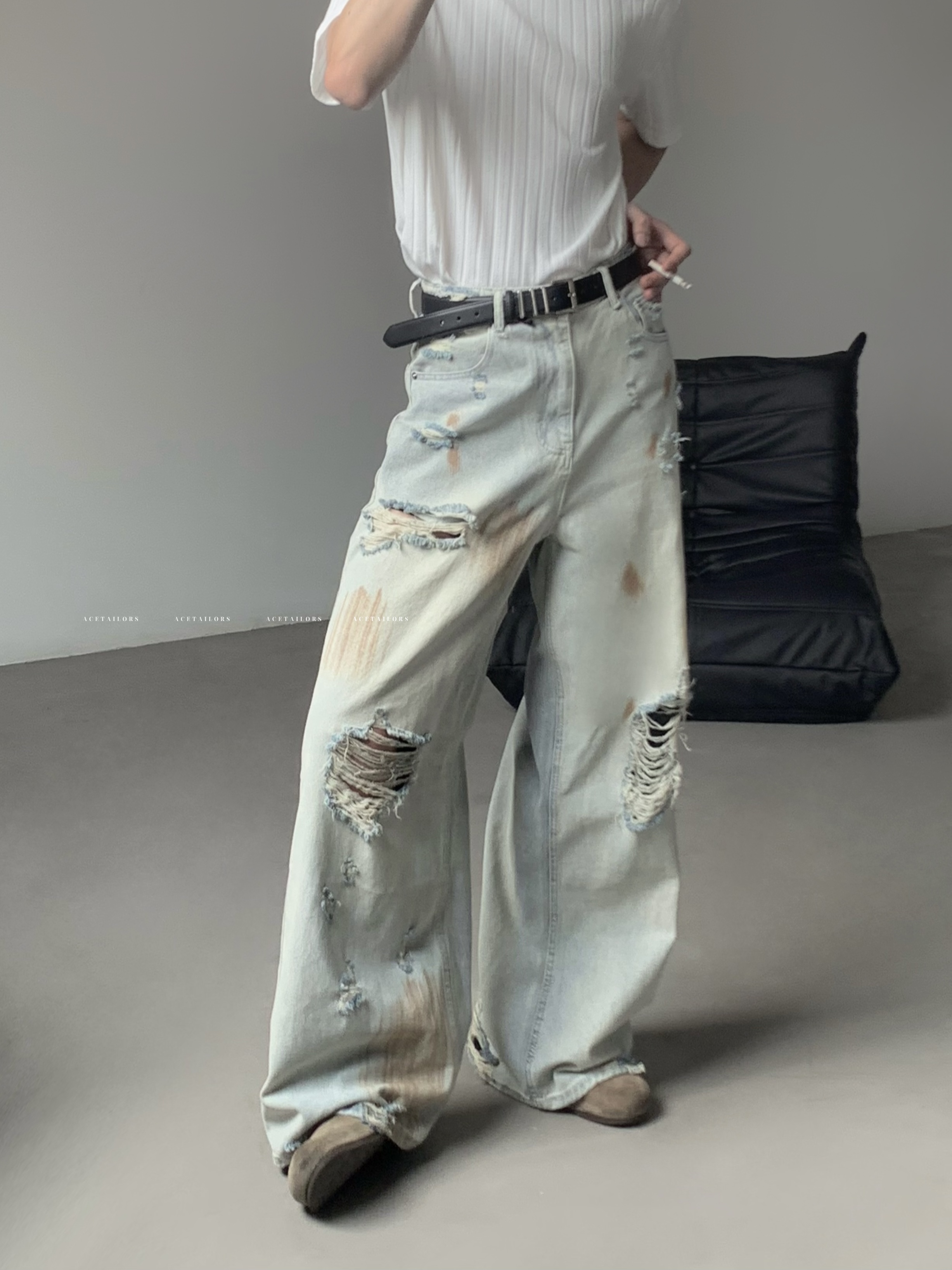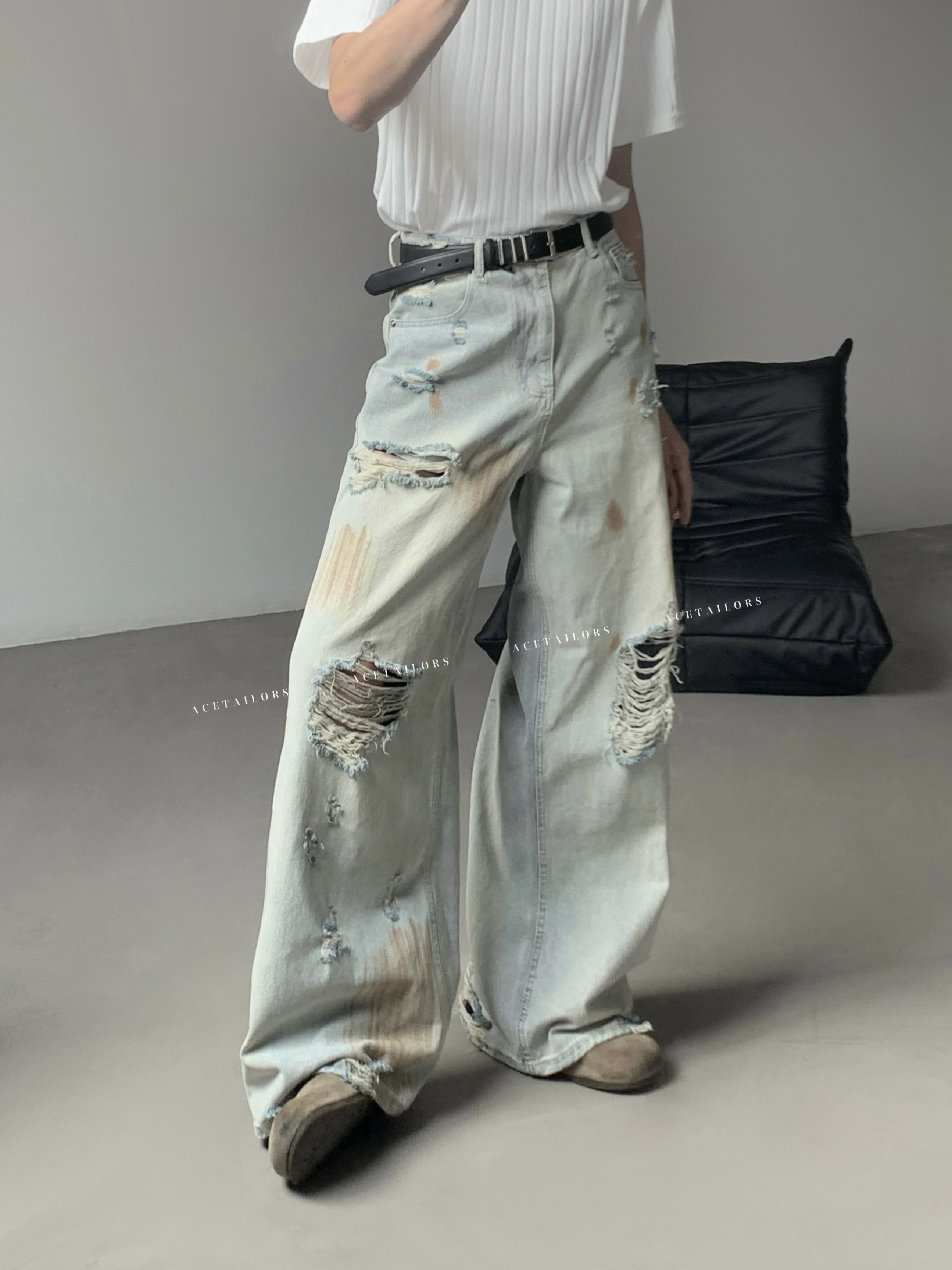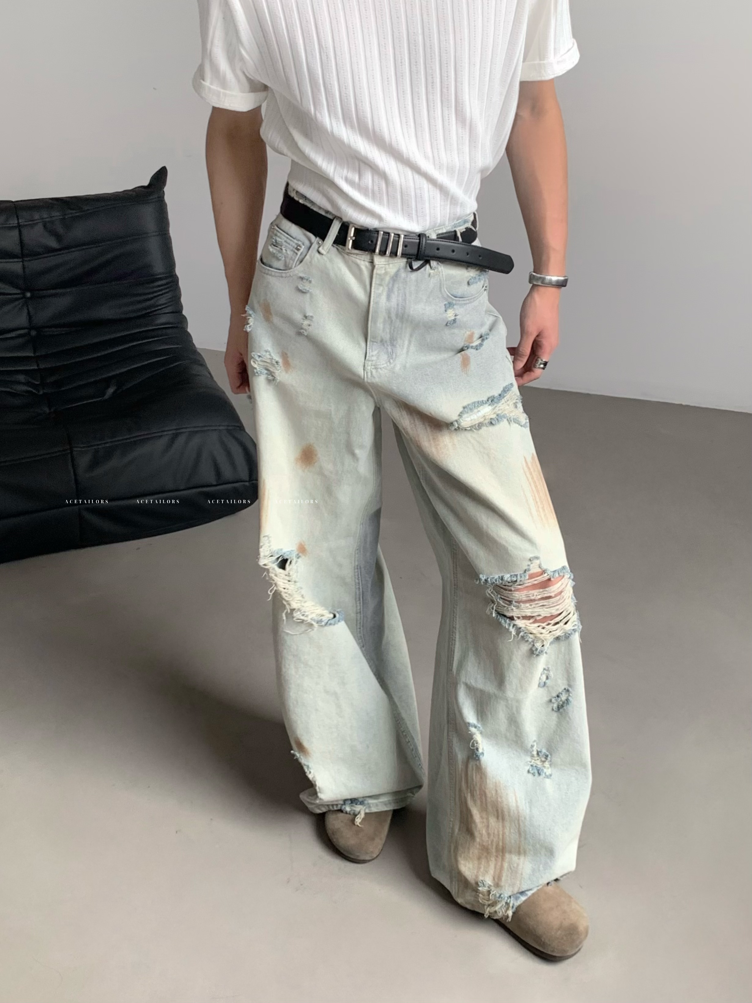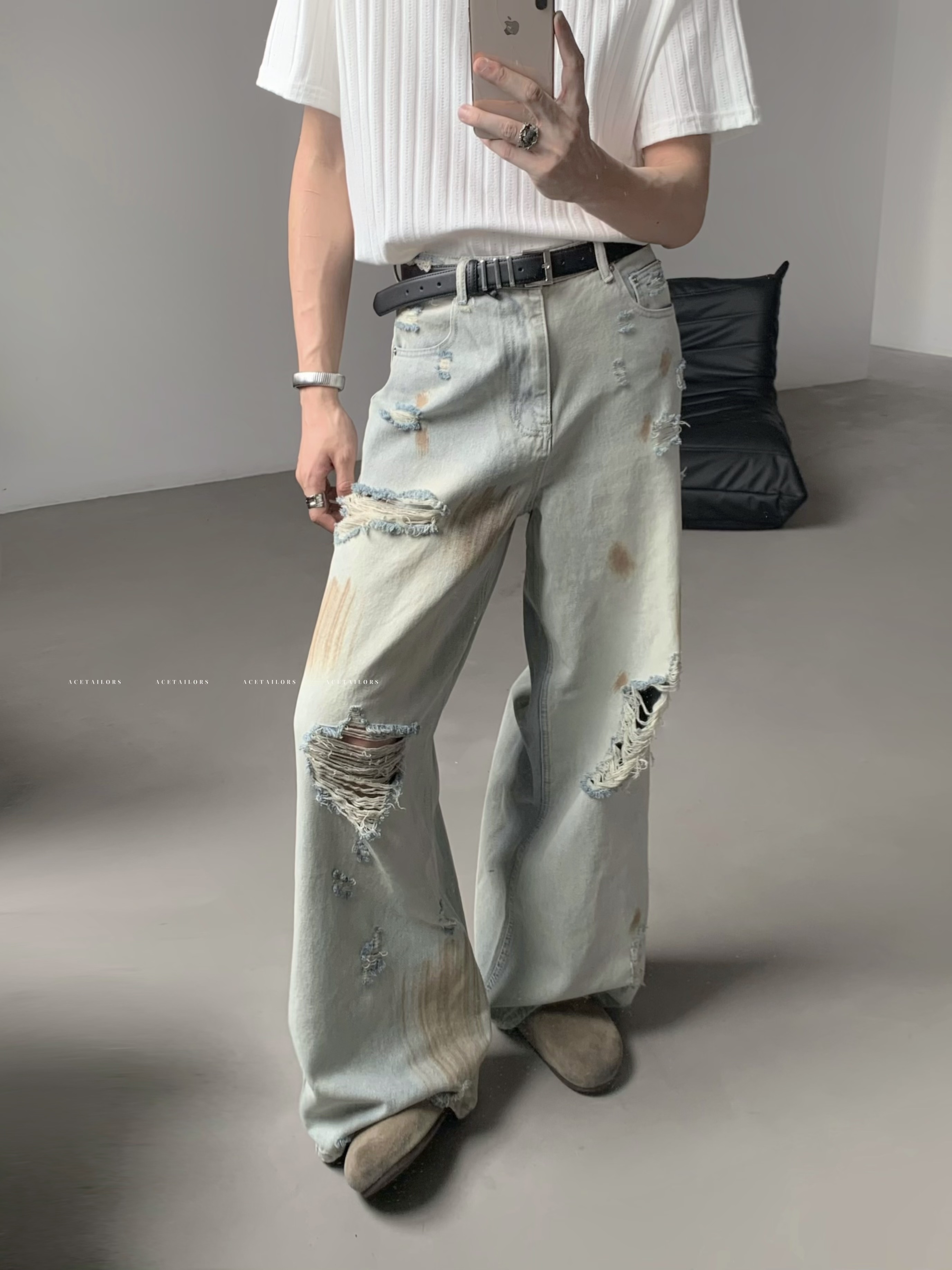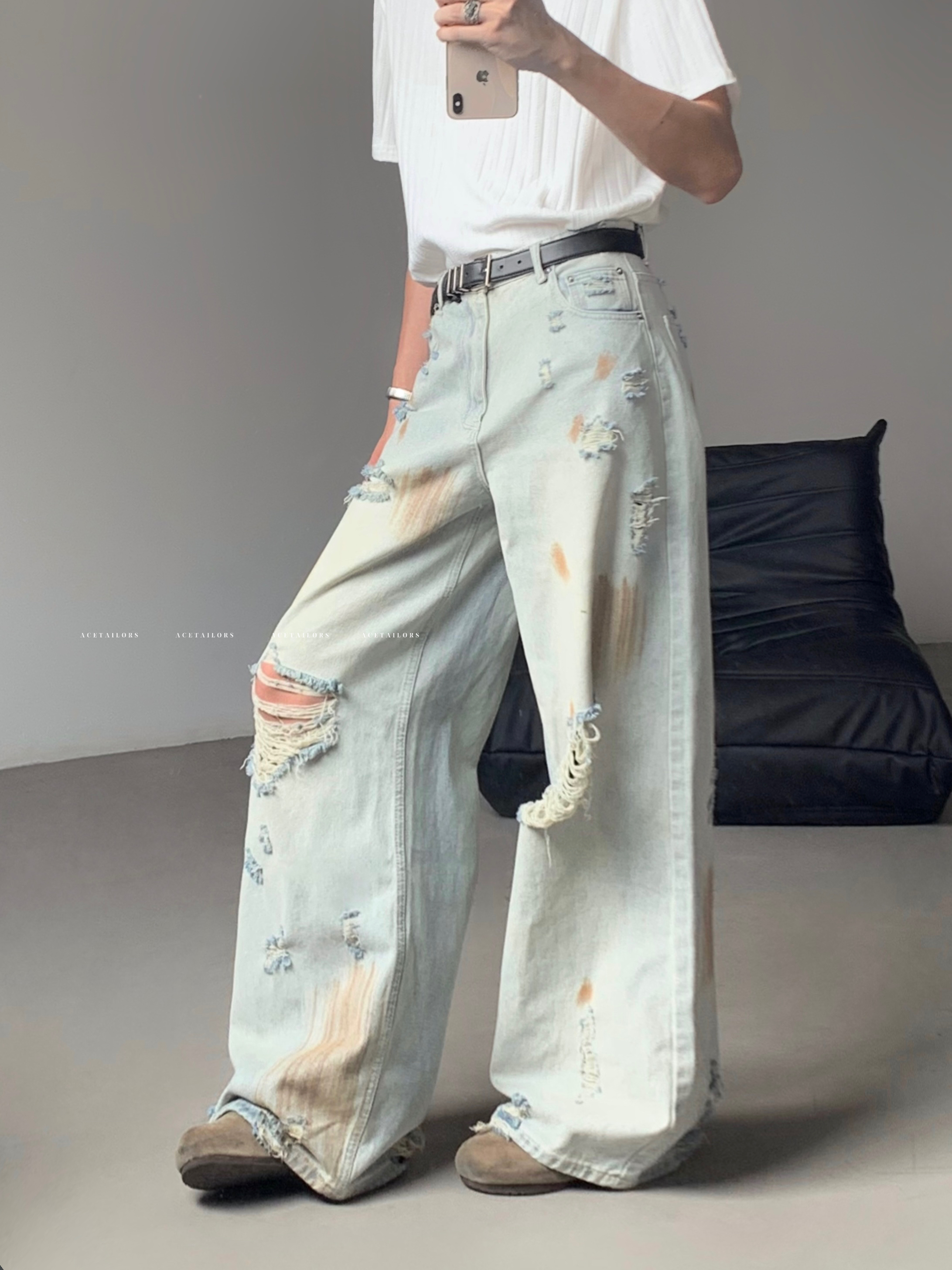 Washed Paint Damage High Waist Wide Leg Denim Jeans WN20088