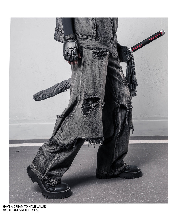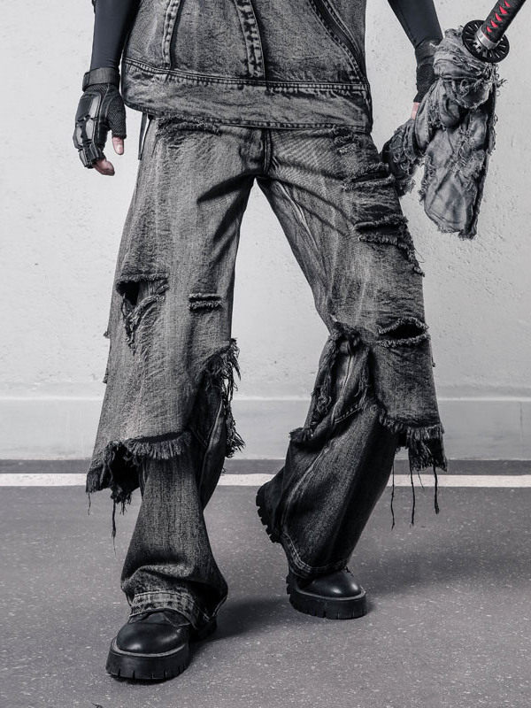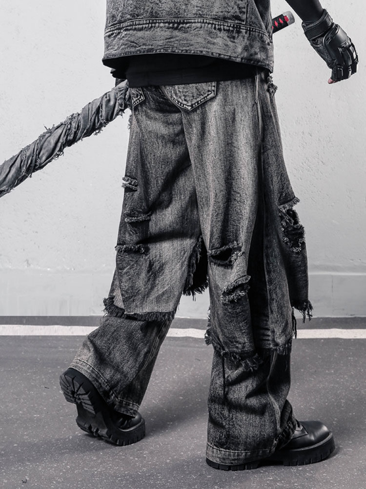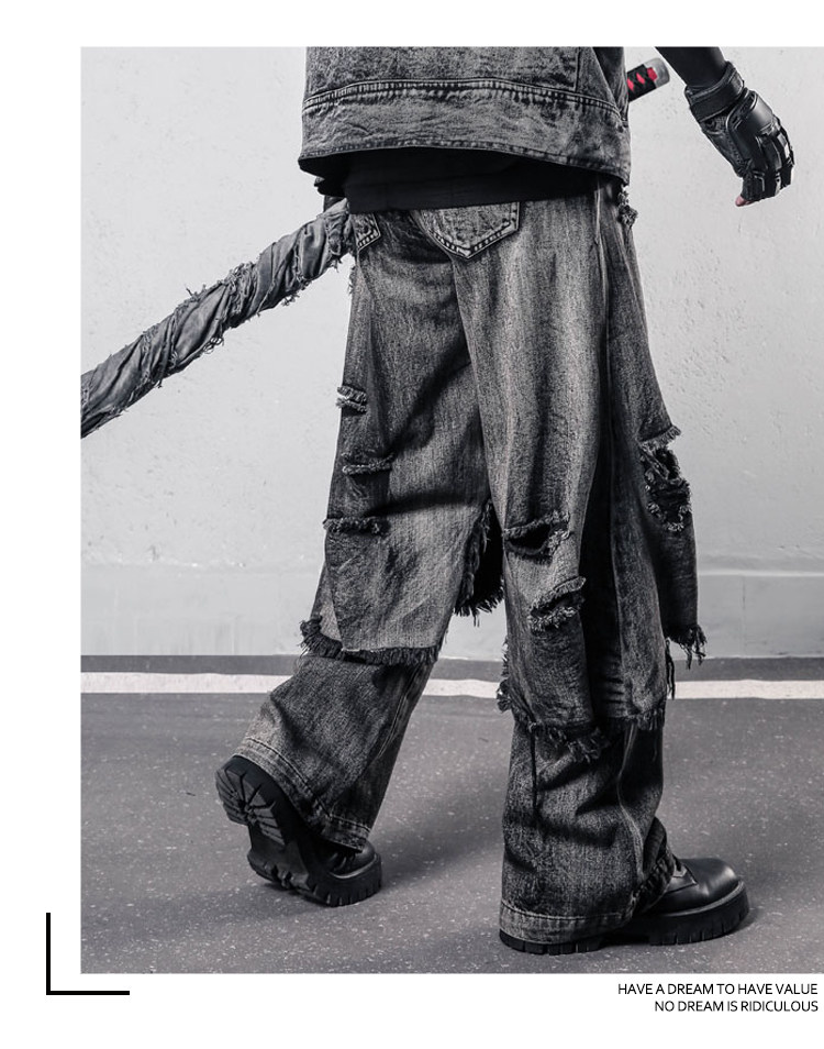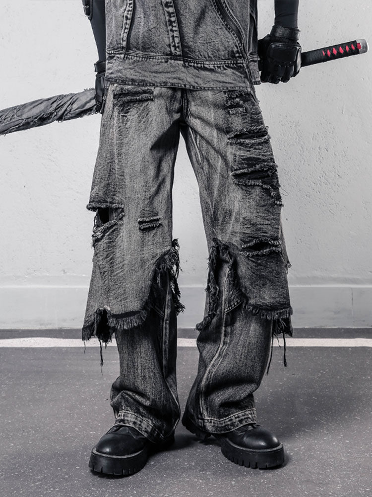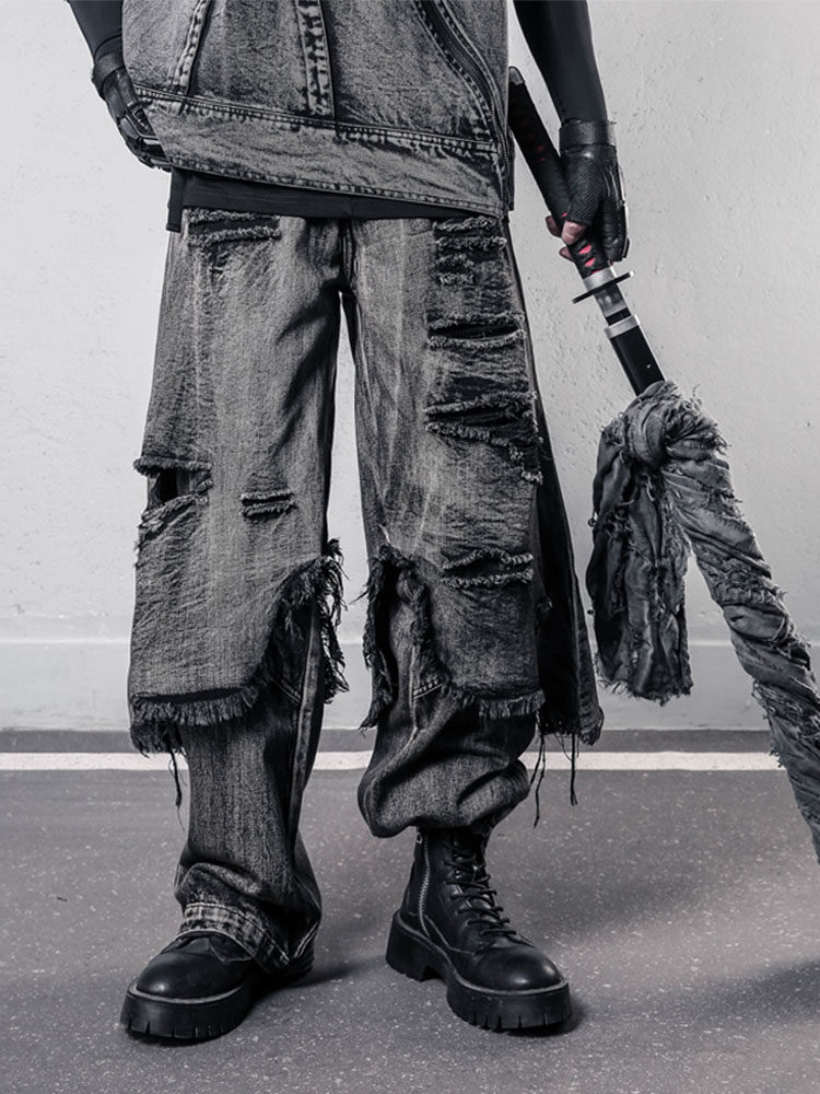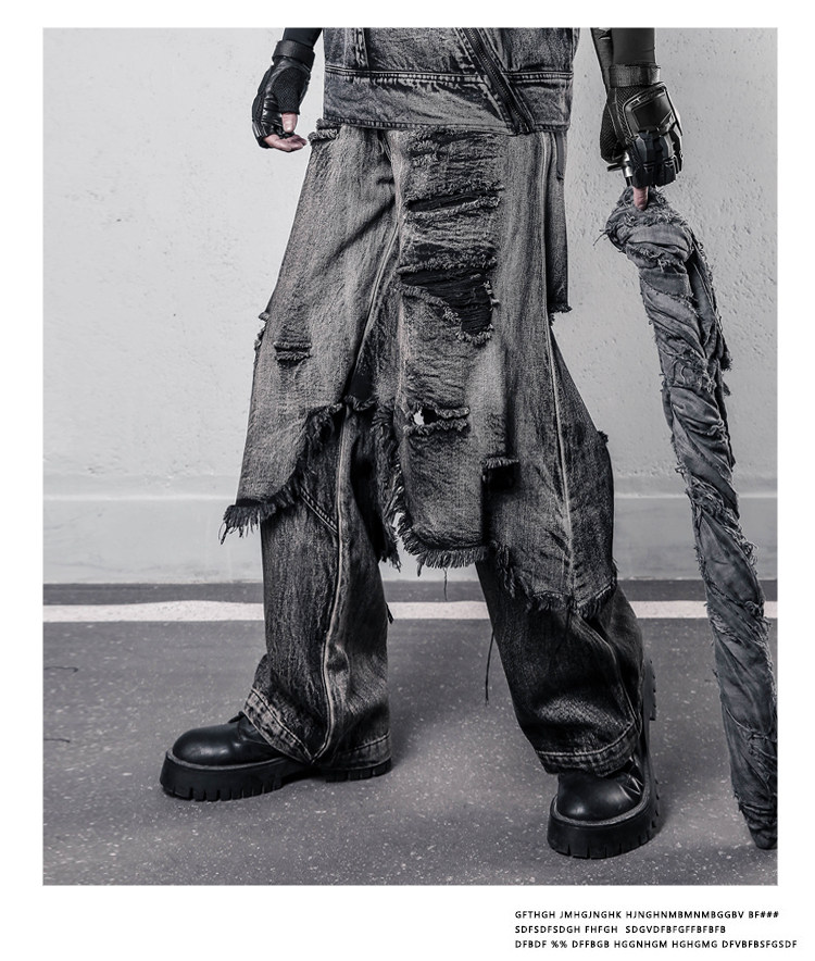 Tactical Fake Layered Damage Fringe Denim Jeans WN22418