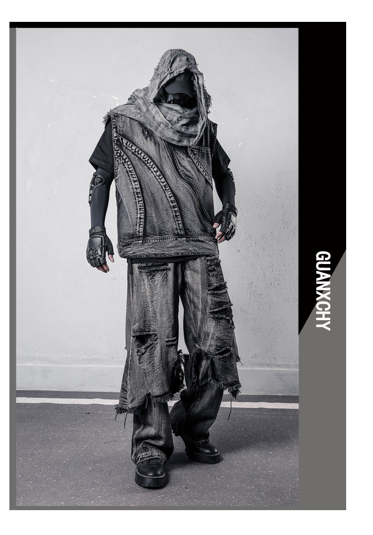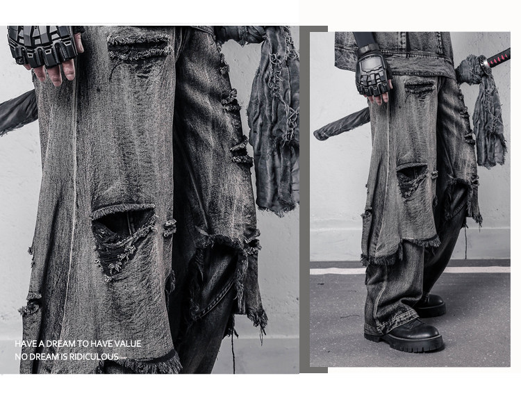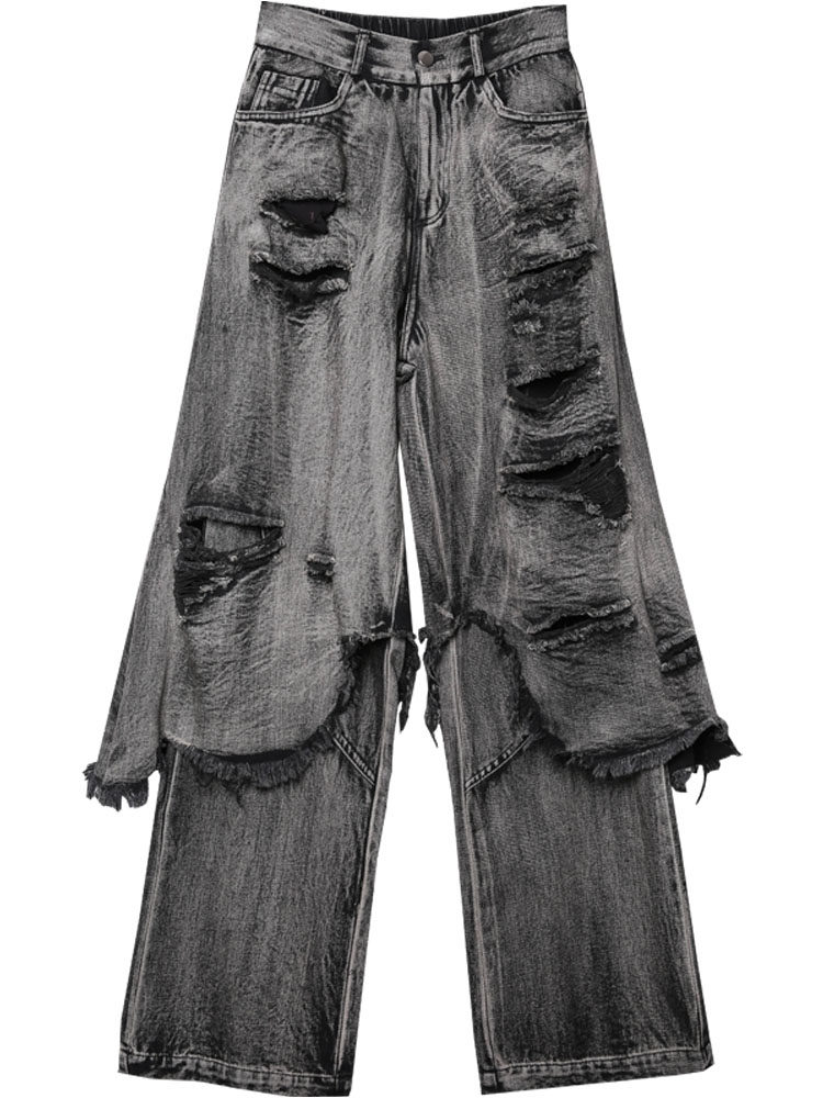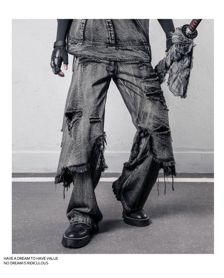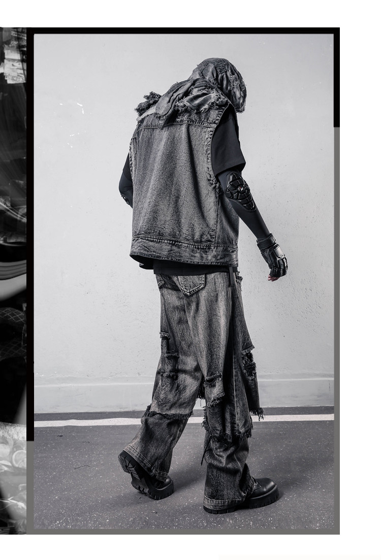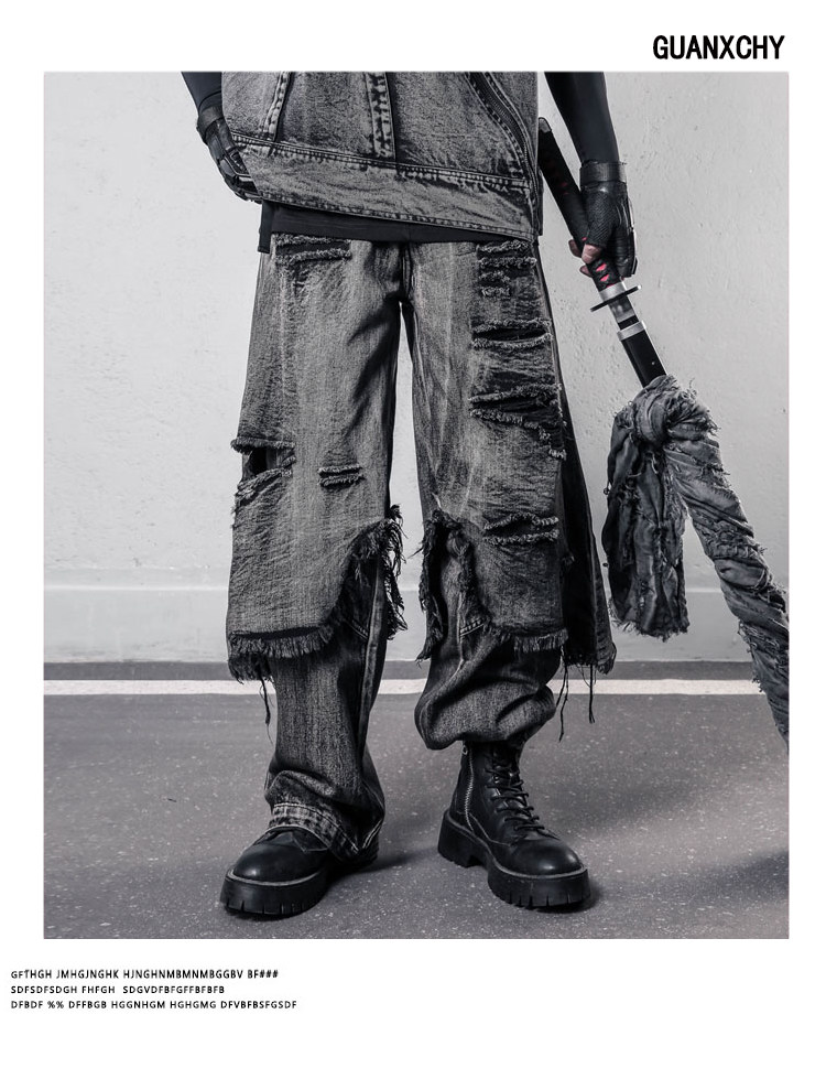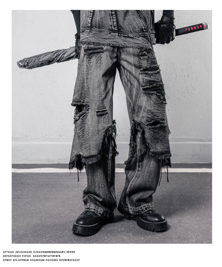 Tactical Fake Layered Damage Fringe Denim Jeans WN22418