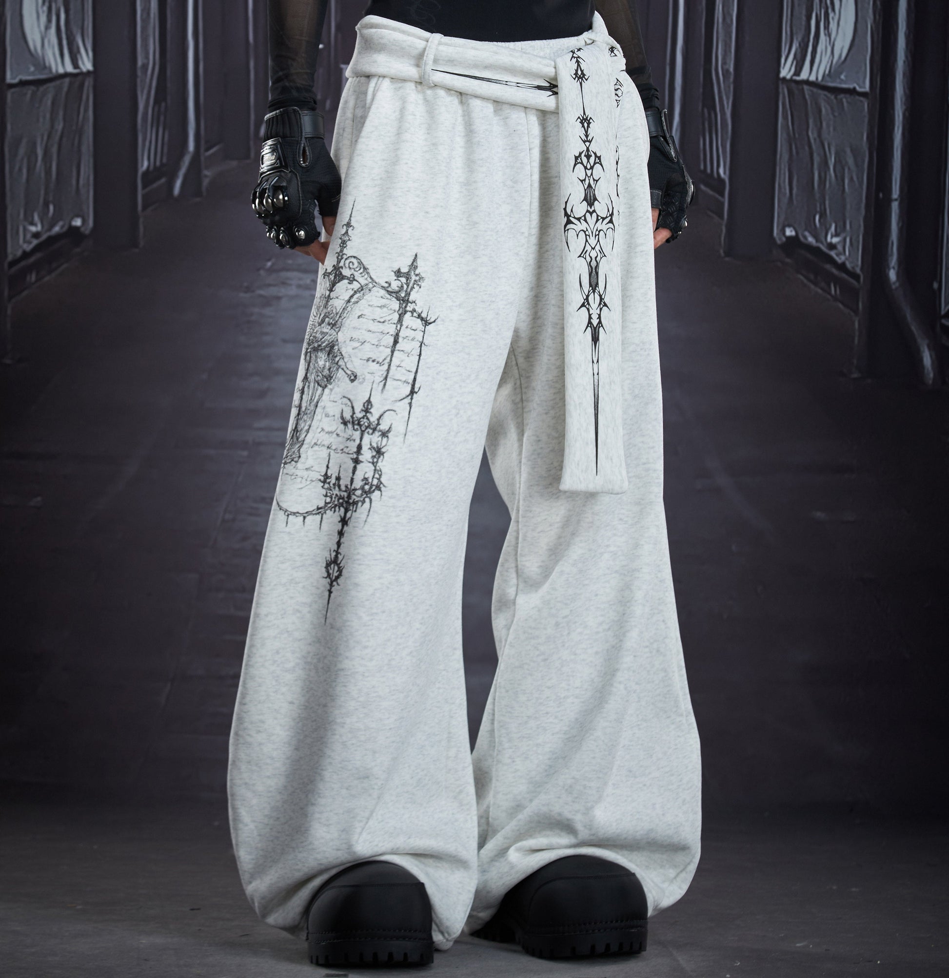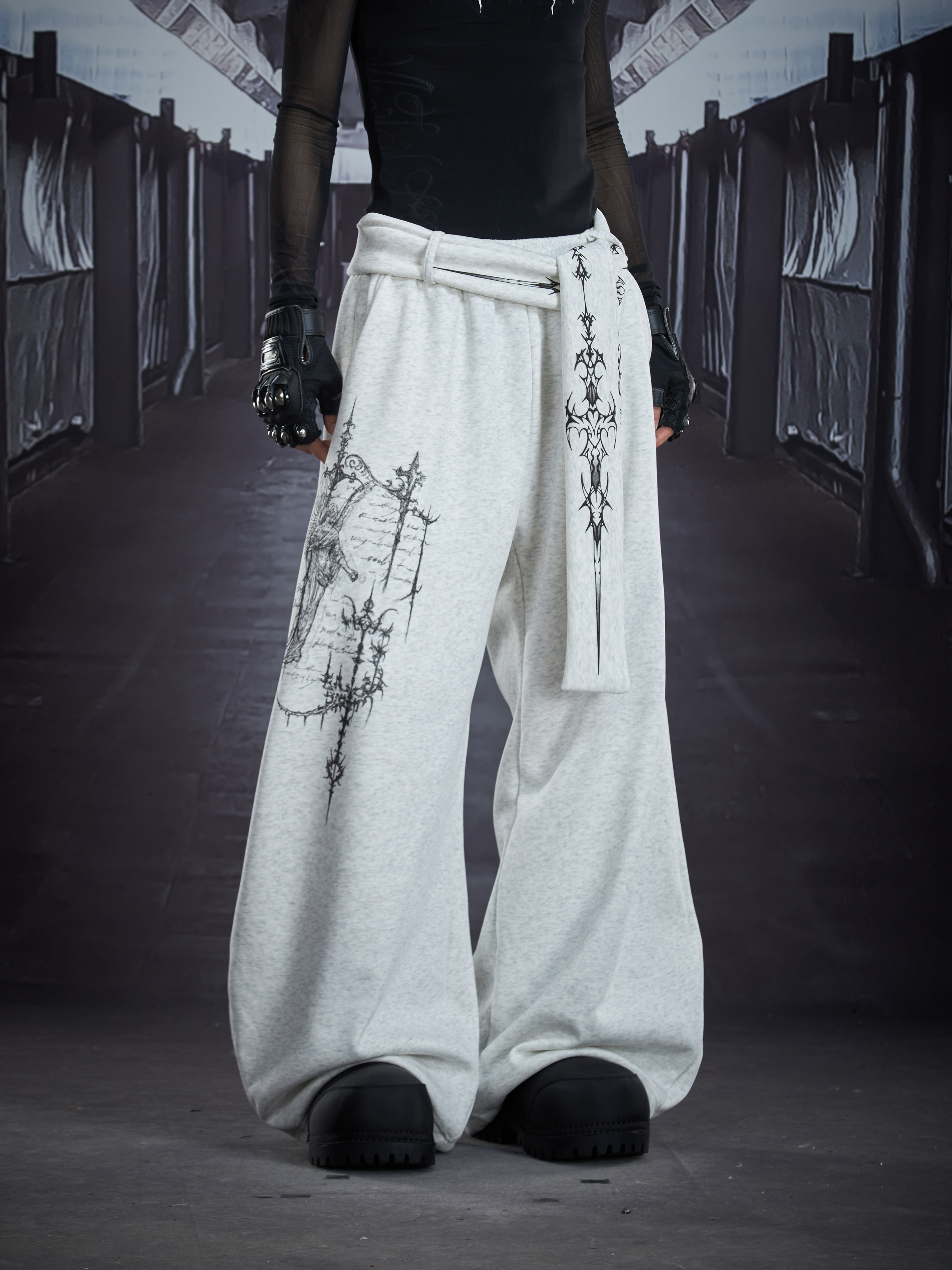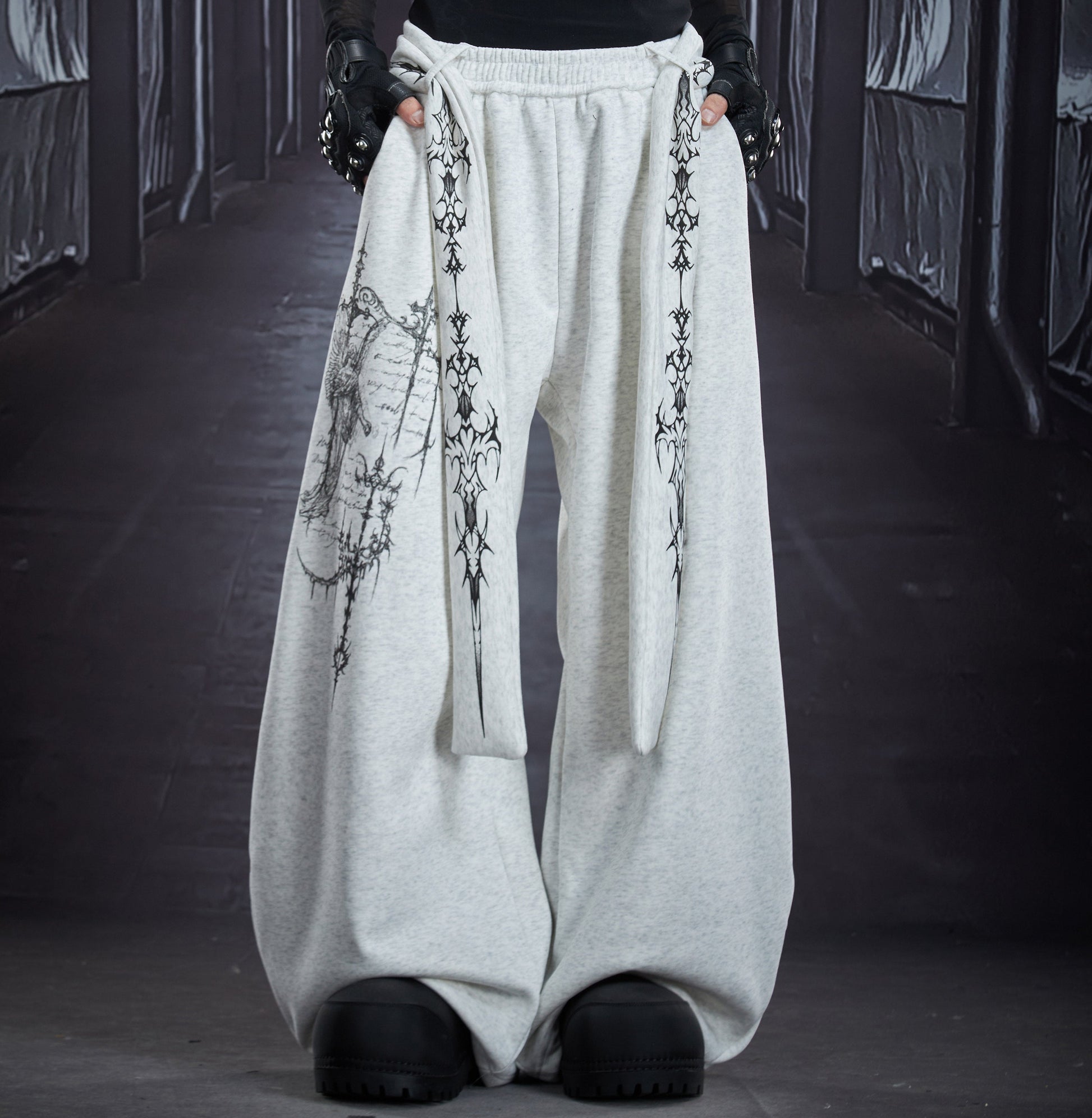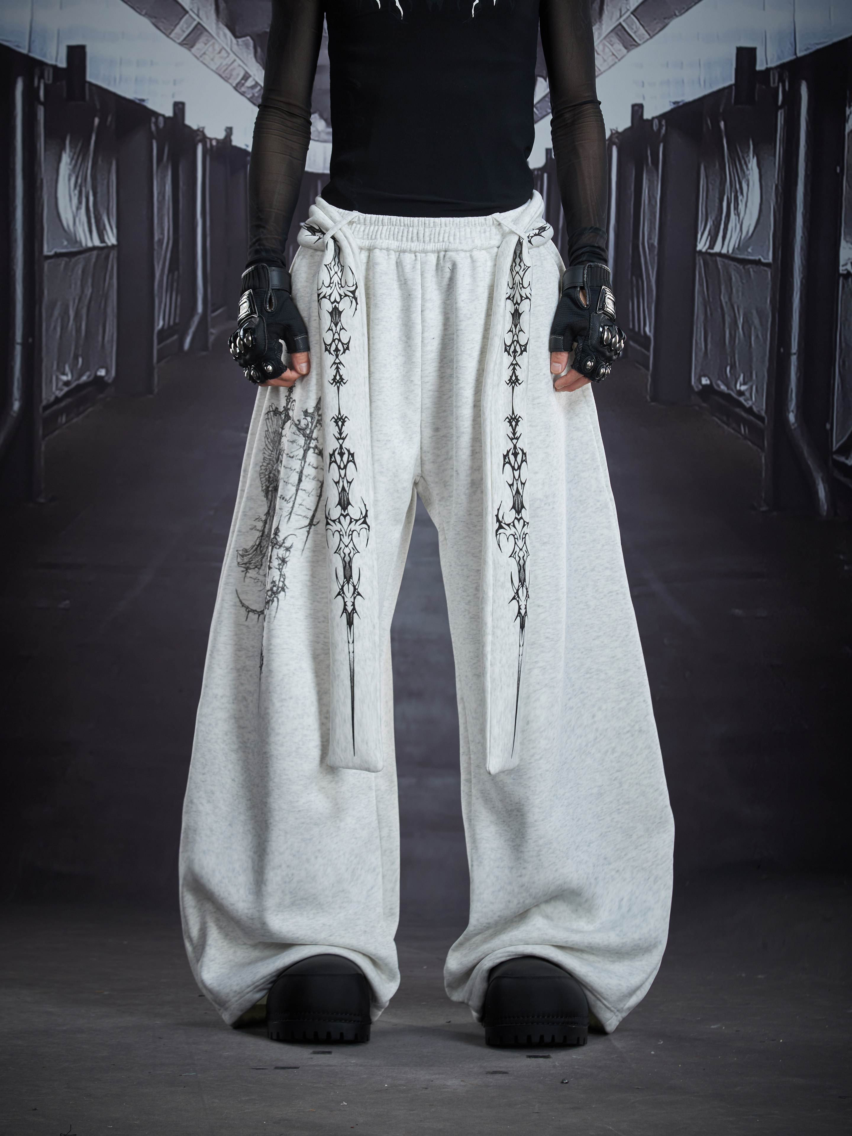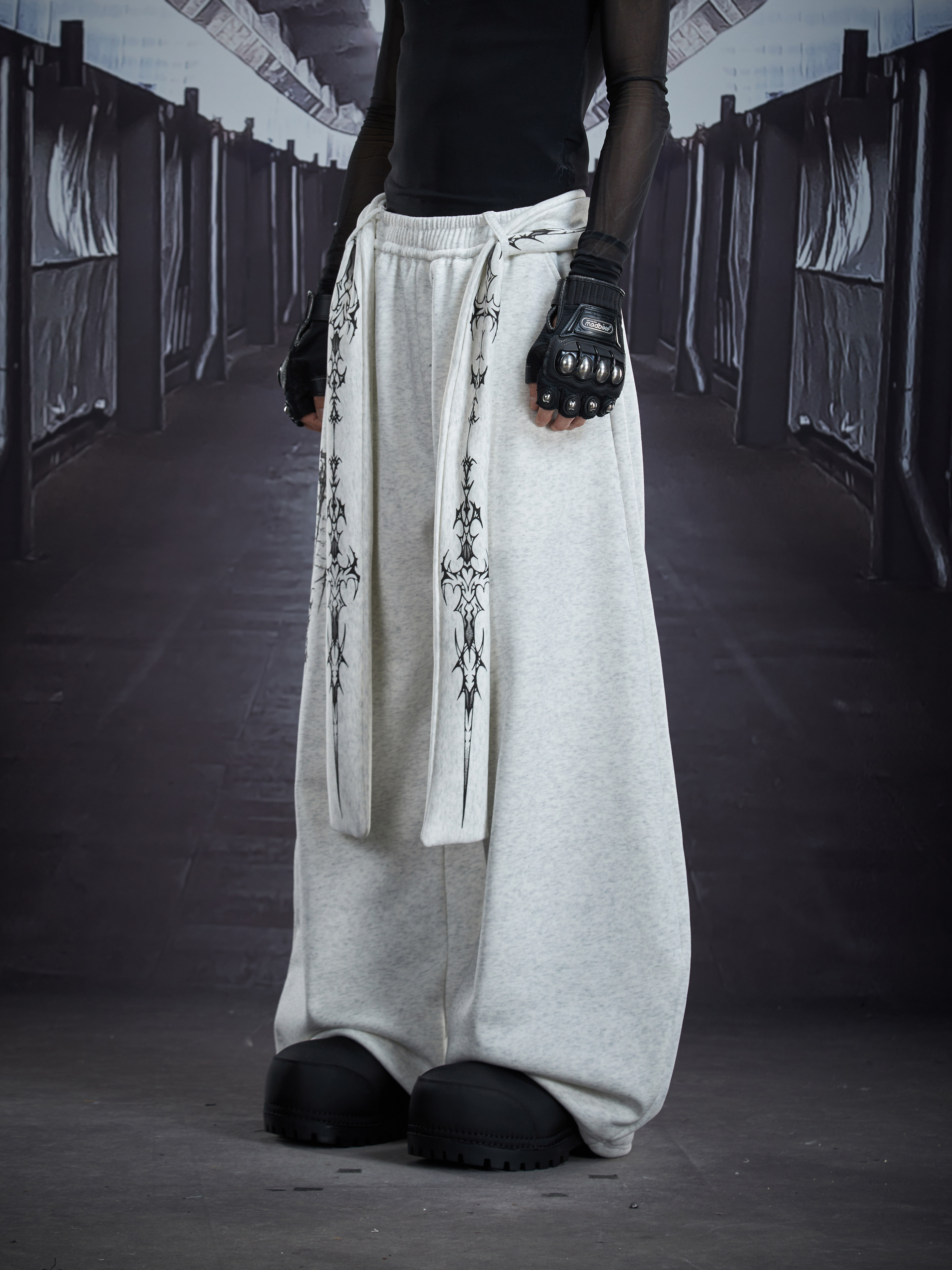 Totem Print Detachable Ribbon Wide Leg Barrel Sweatpants WN22918