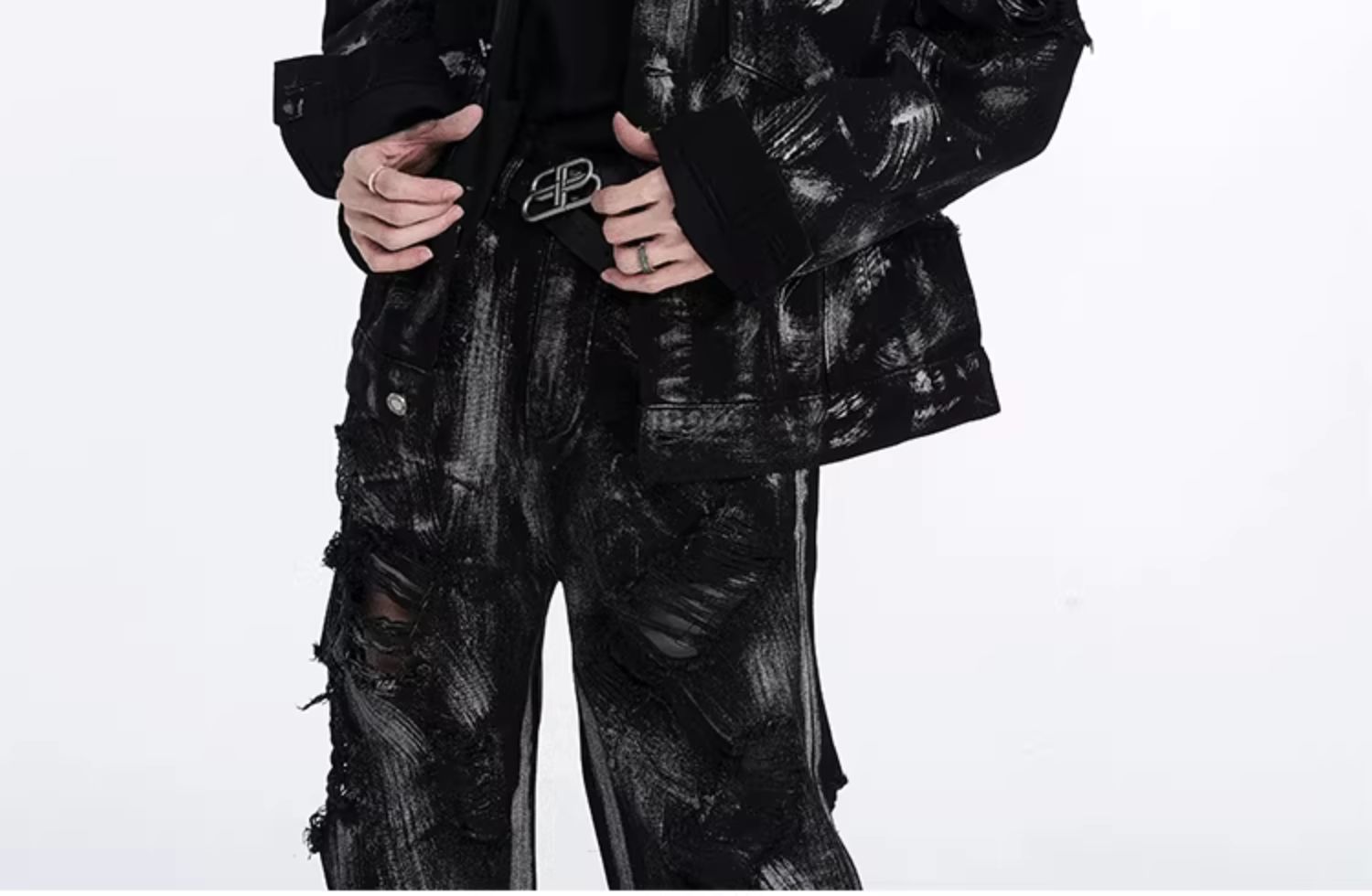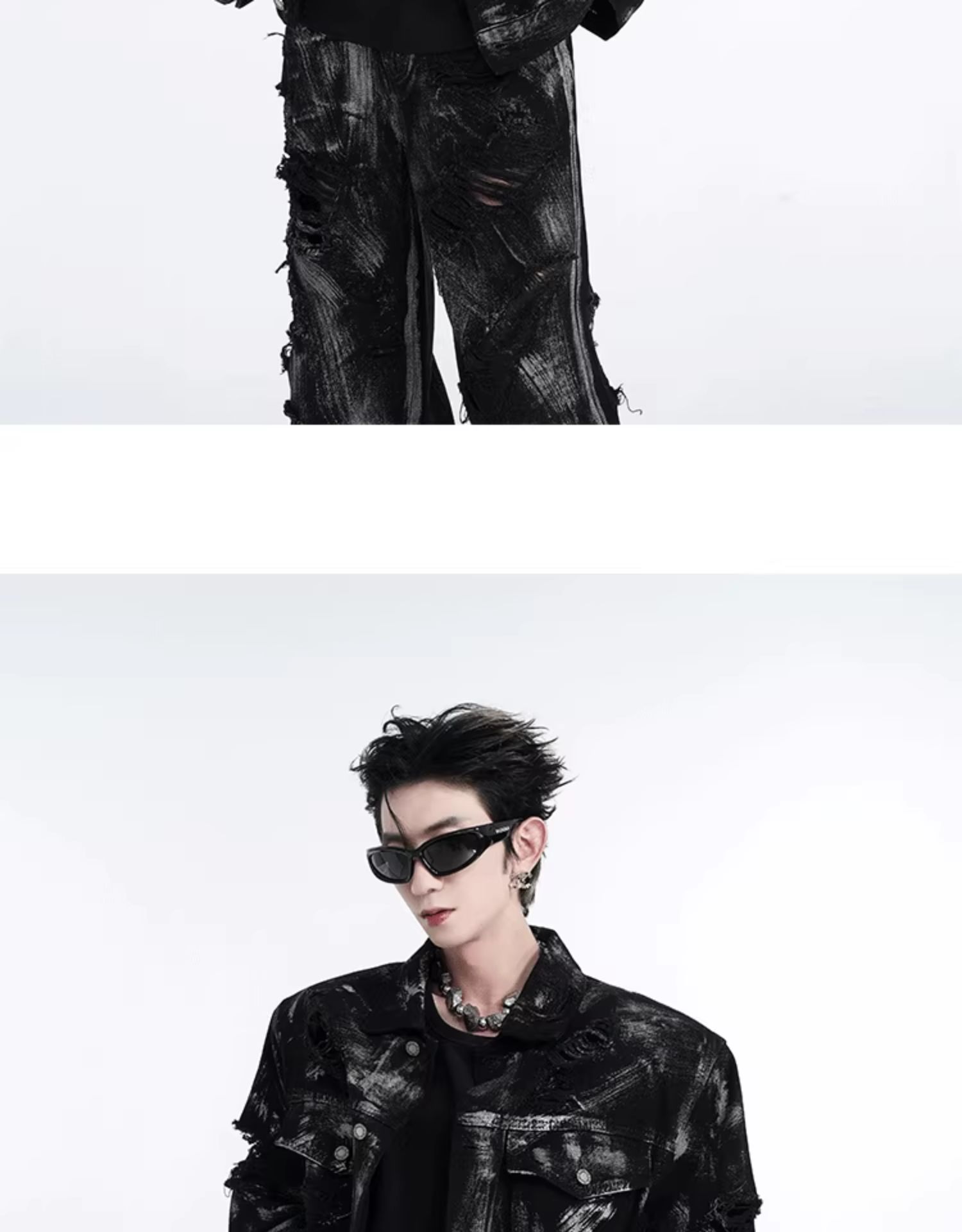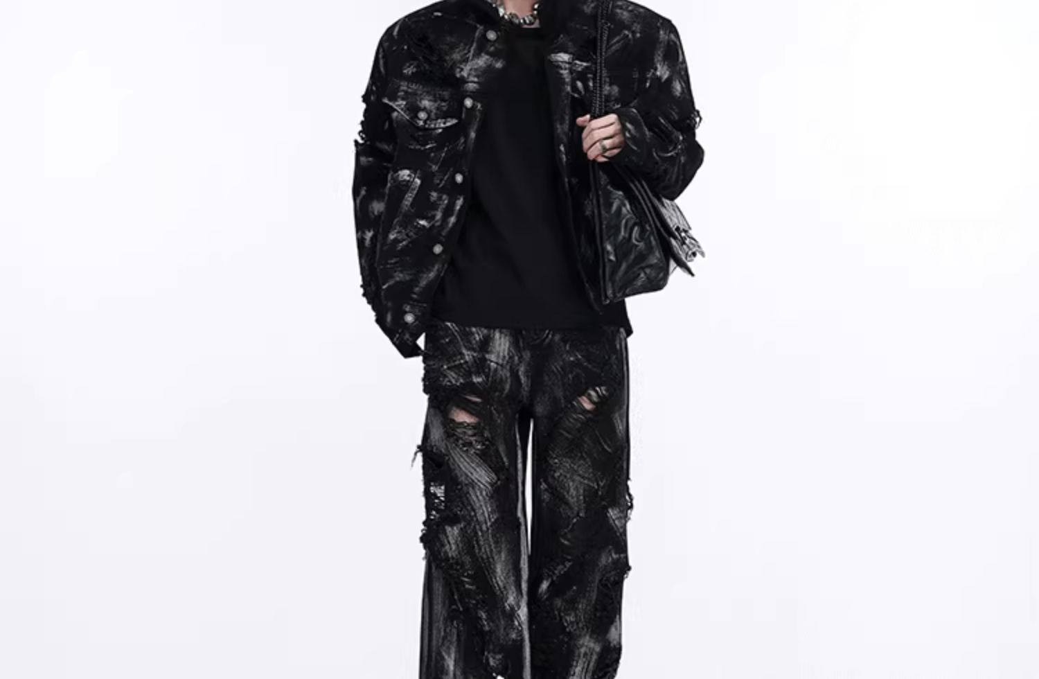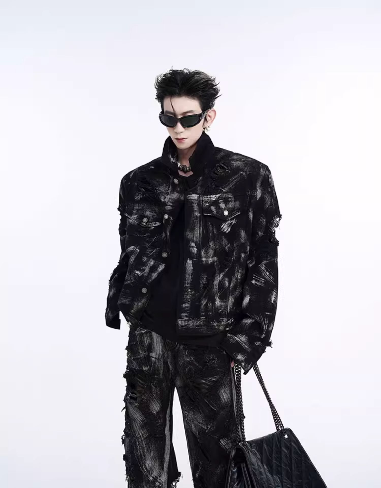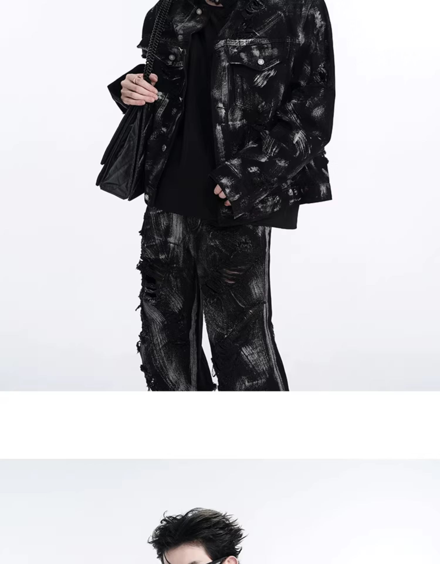Washed Damage Denim Jacket & Washed Graffiti Wide-Leg Denim Jeans Setup WN6941