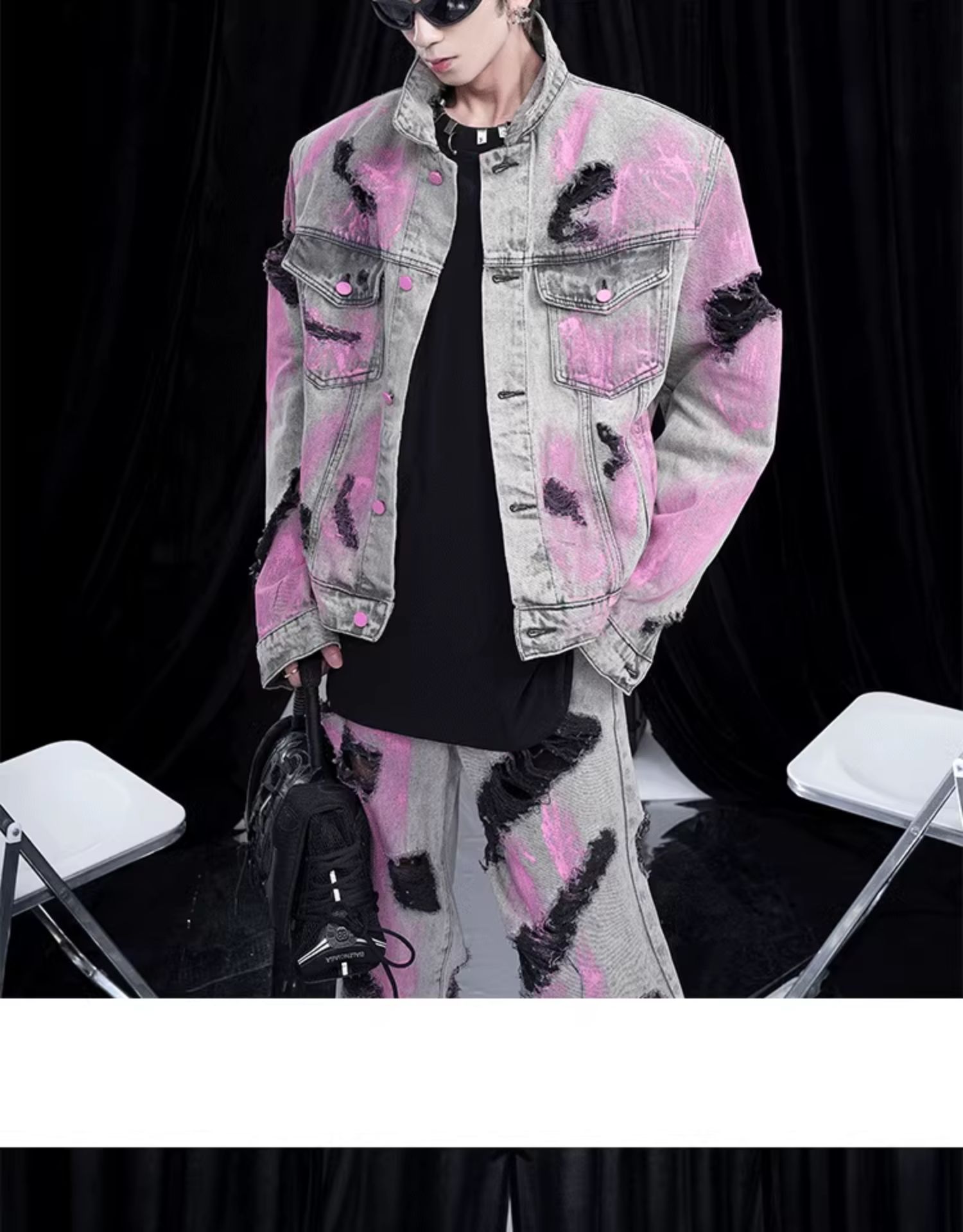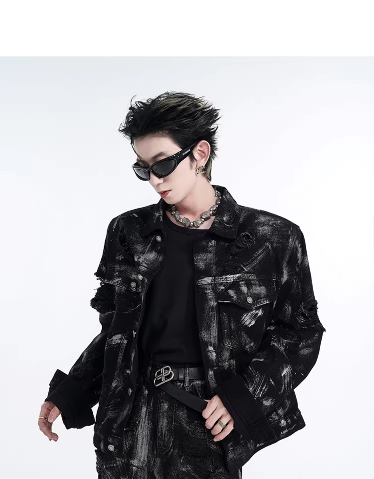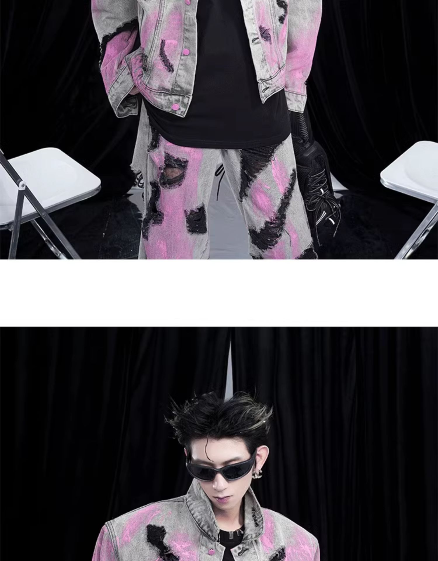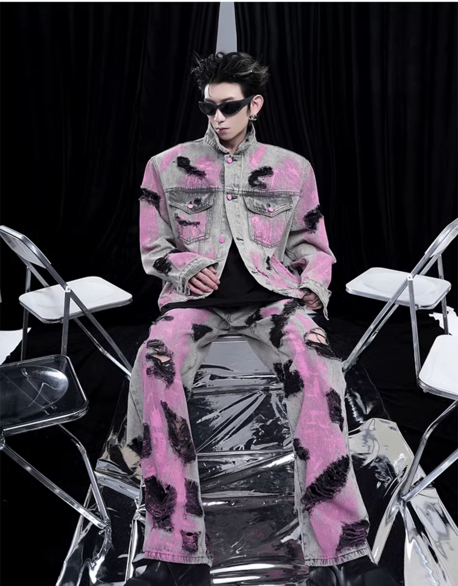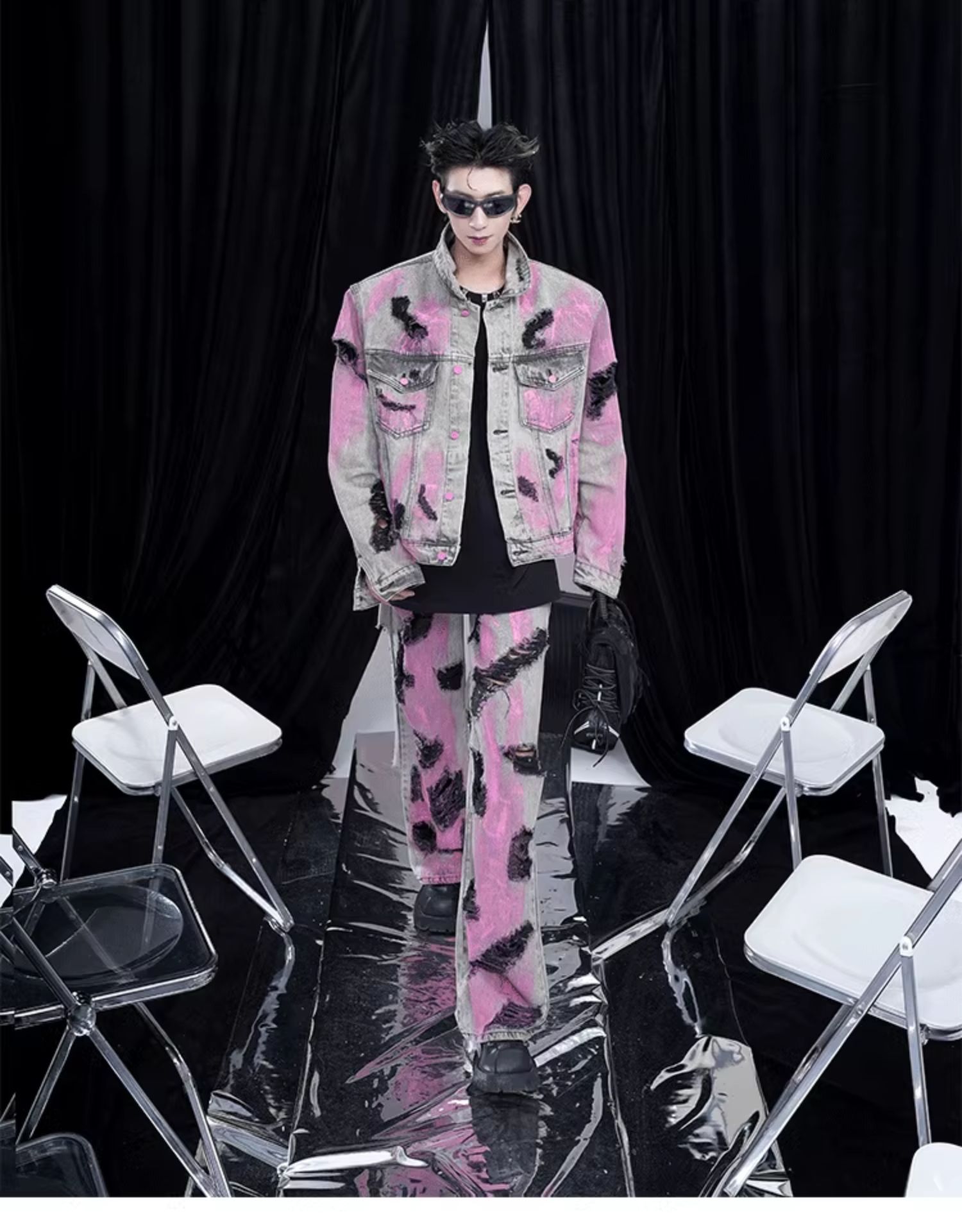 Washed Damage Denim Jacket & Washed Graffiti Wide-Leg Denim Jeans Setup WN6941