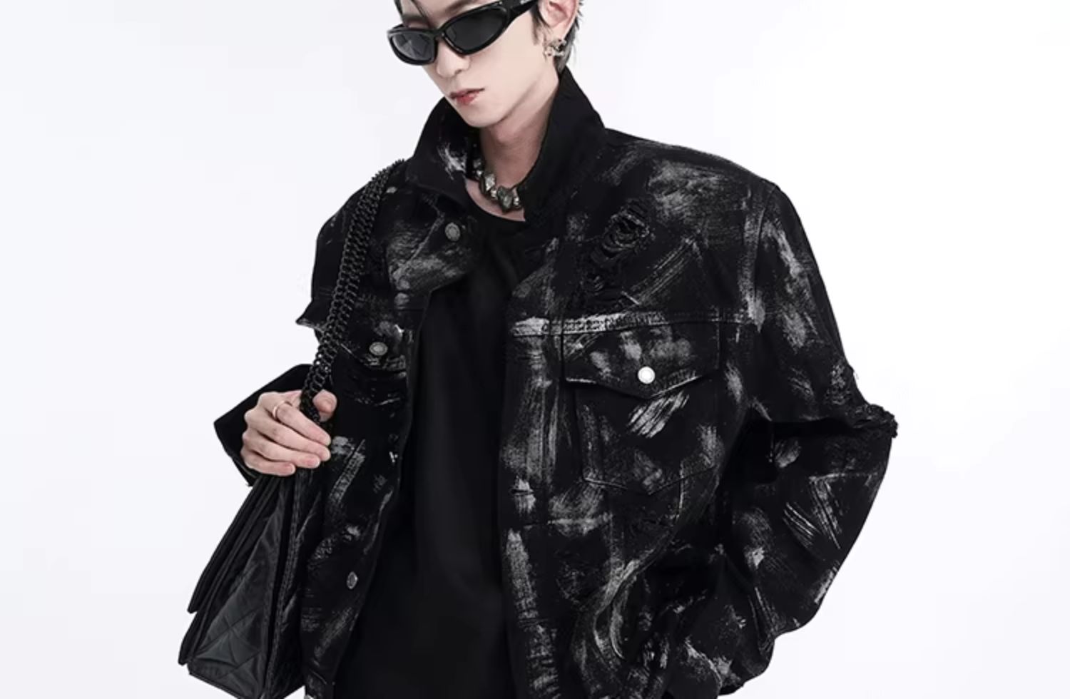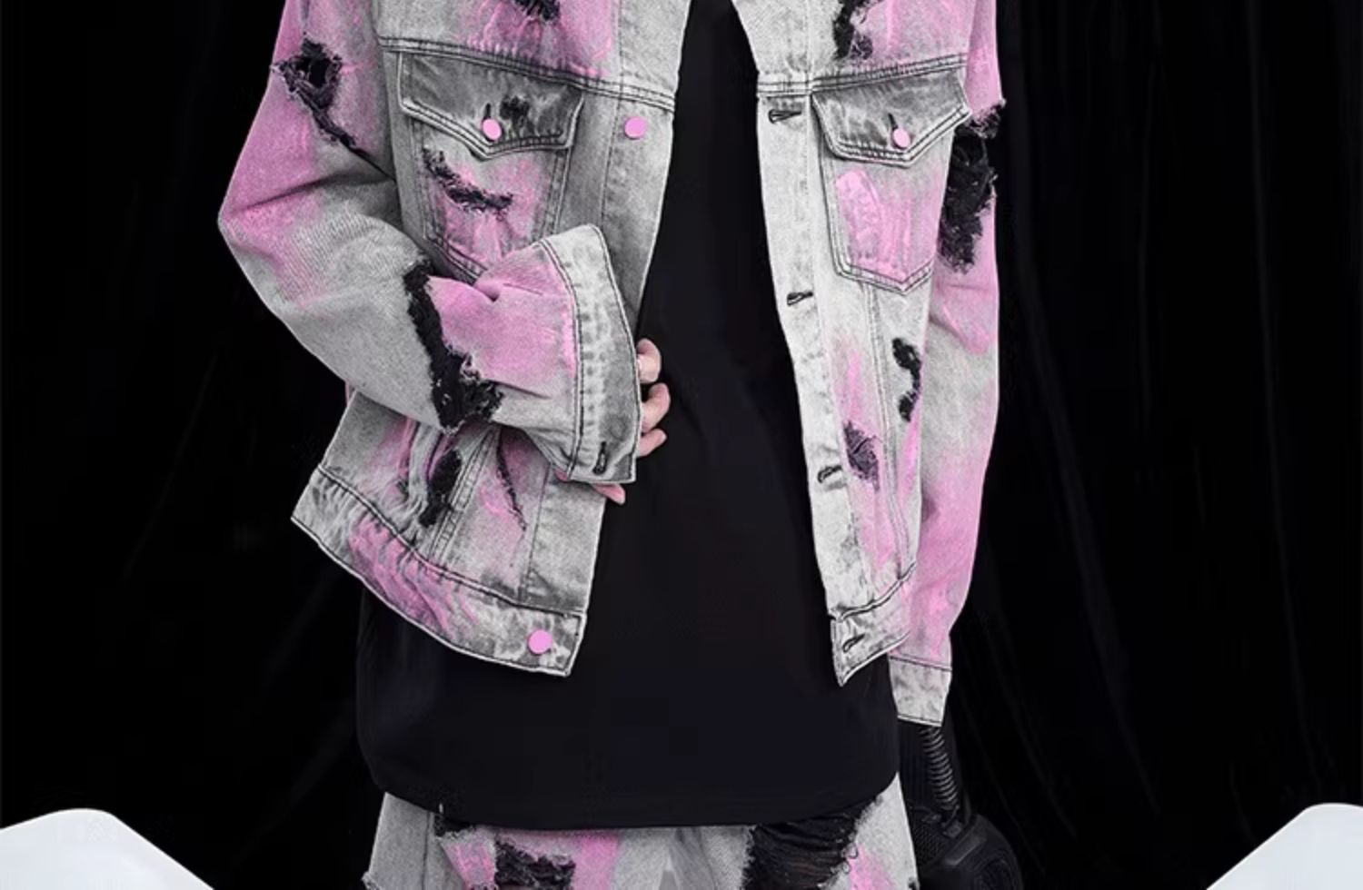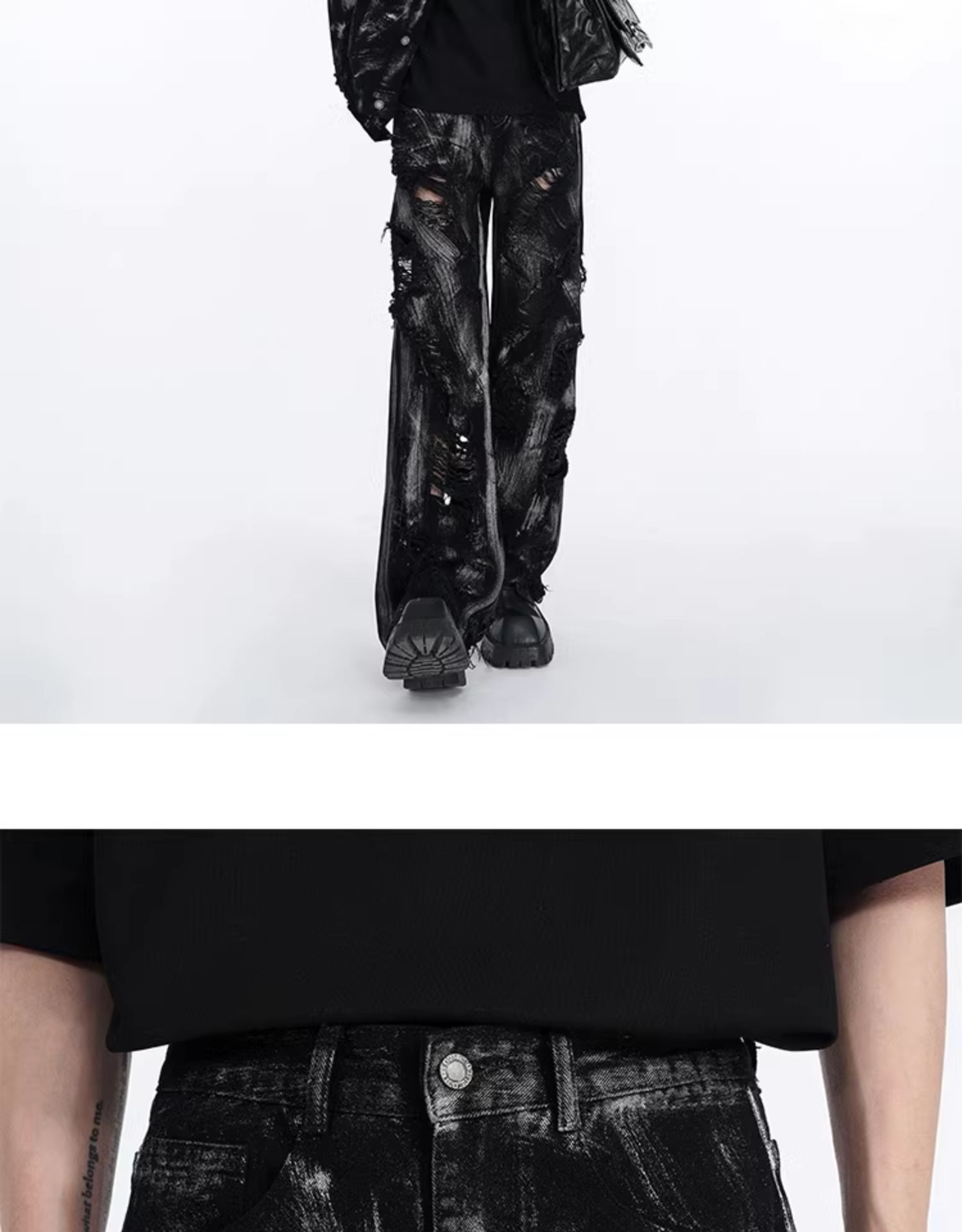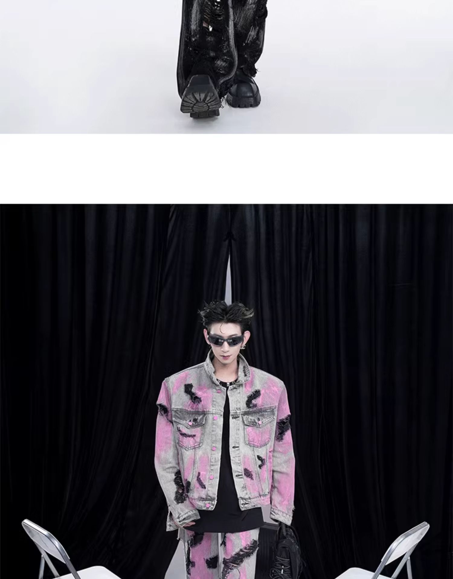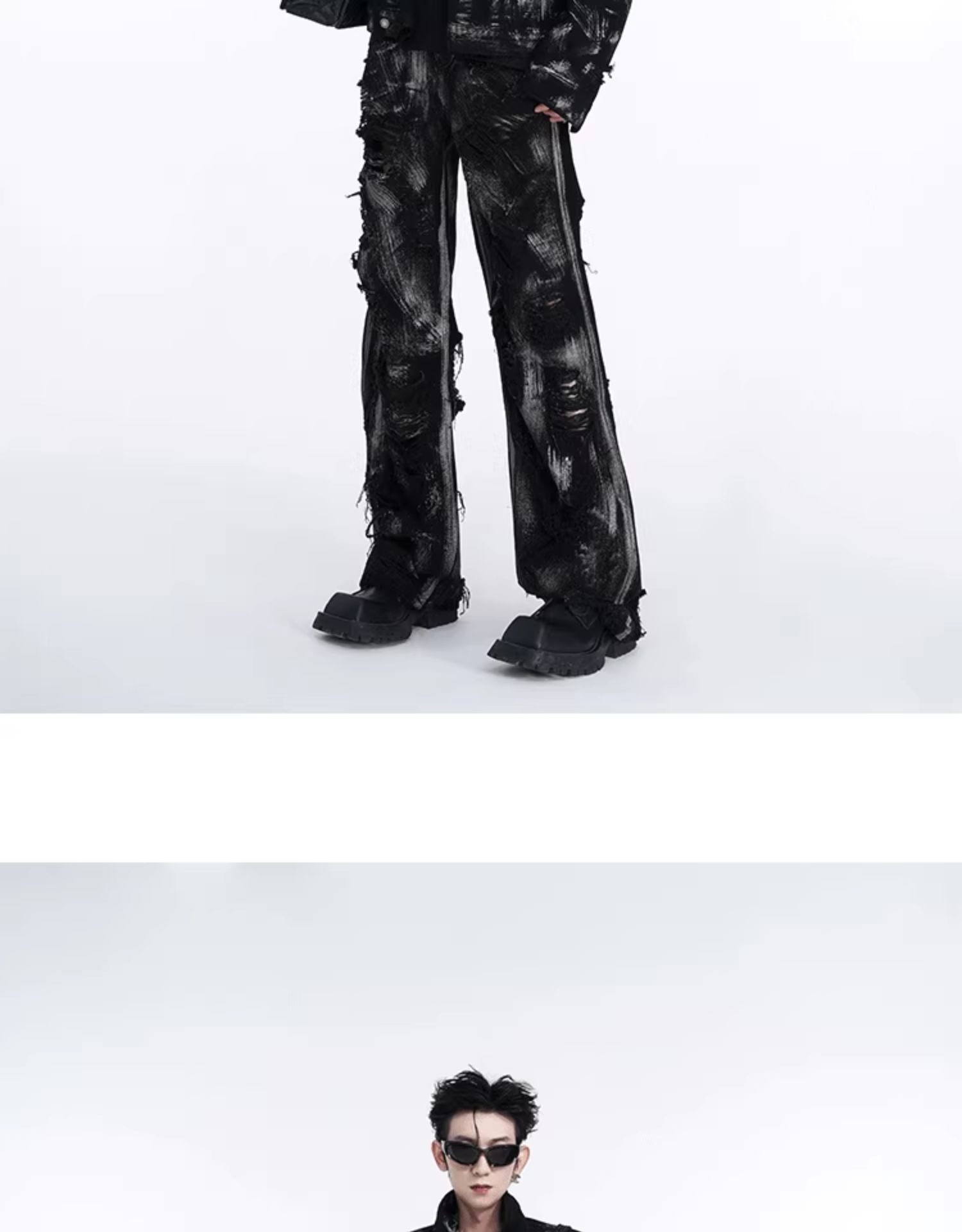 Washed Damage Denim Jacket & Washed Graffiti Wide-Leg Denim Jeans Setup WN6941