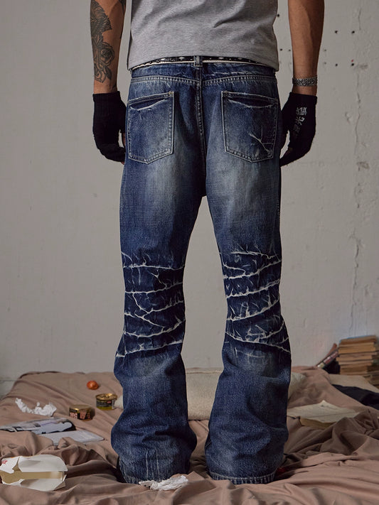 Lightning Wave Pattern Washed Straight Flare Denim Jeans WN17034
