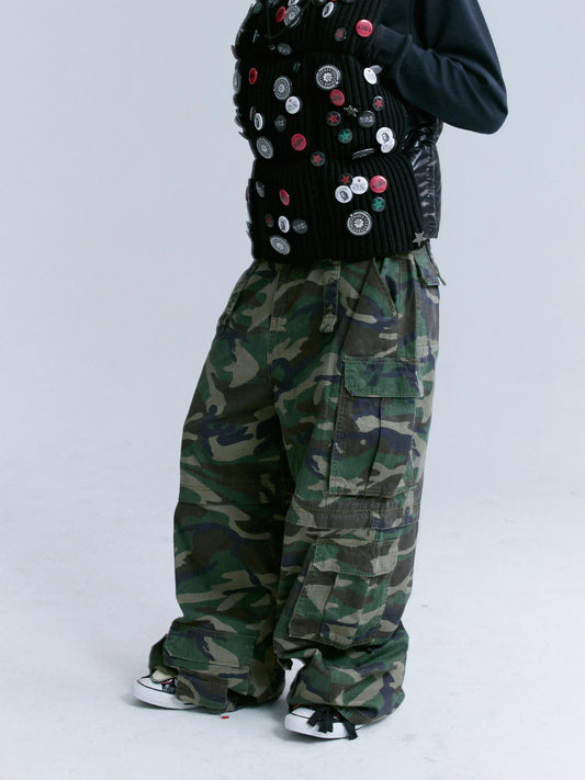 Adjustable Drawstring Multi-Pocket Camouflage Wide Leg Cargo Pants WN17211