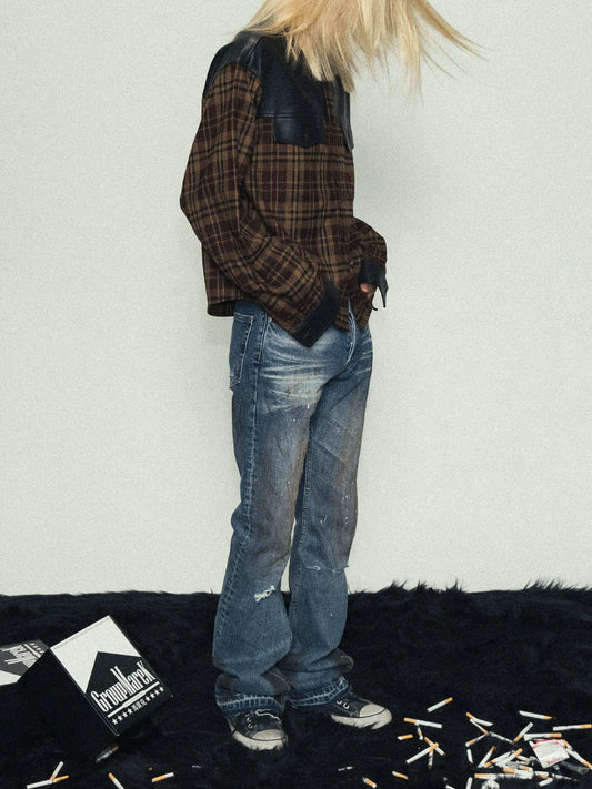 Brown Plaid Fake Leather Mix Graphic Long Sleeve Shirt WN17227