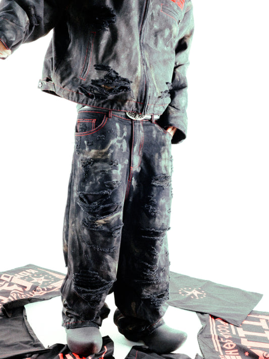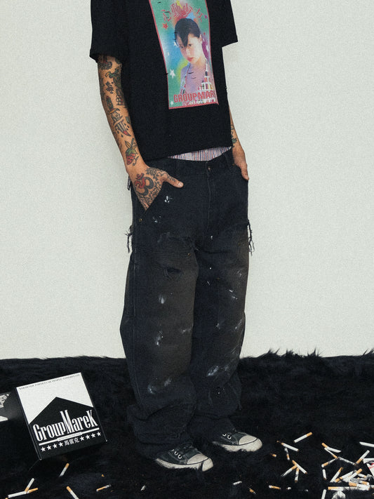 Knee Stitch Damage Heavy Wash Paint Wide Leg Pants WN17236