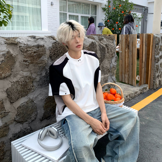 Shoulder-Pad Patchwork Oversize Short Sleeve T-Shirt WN19875