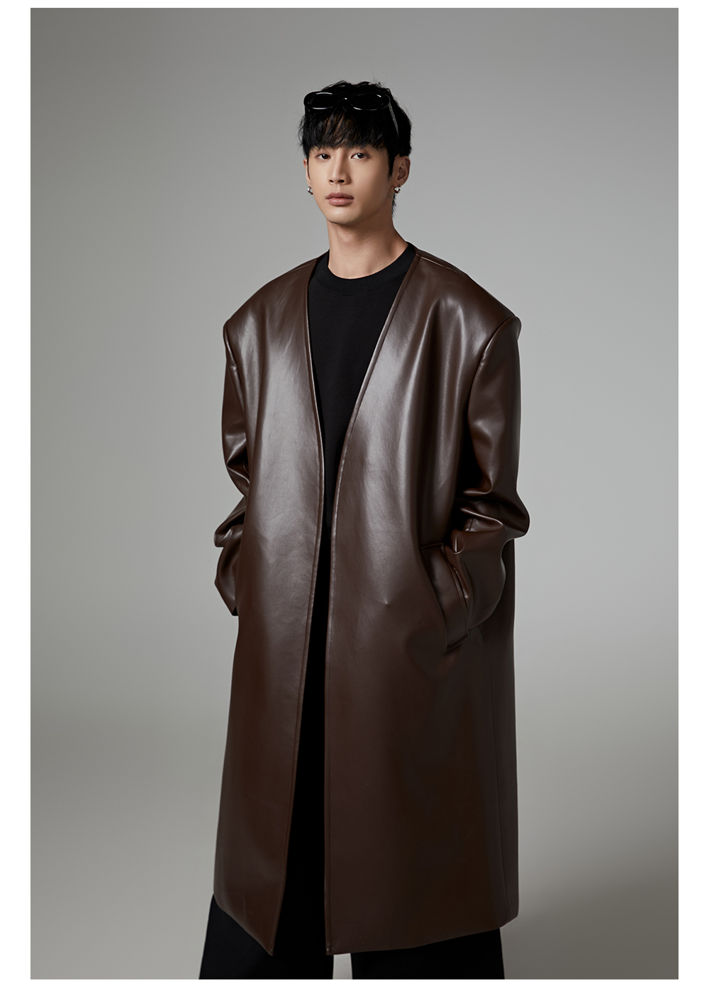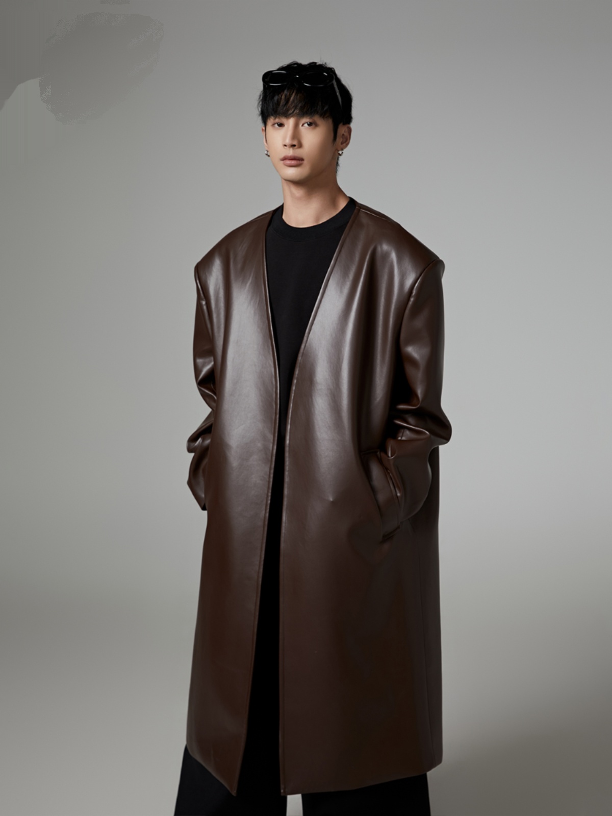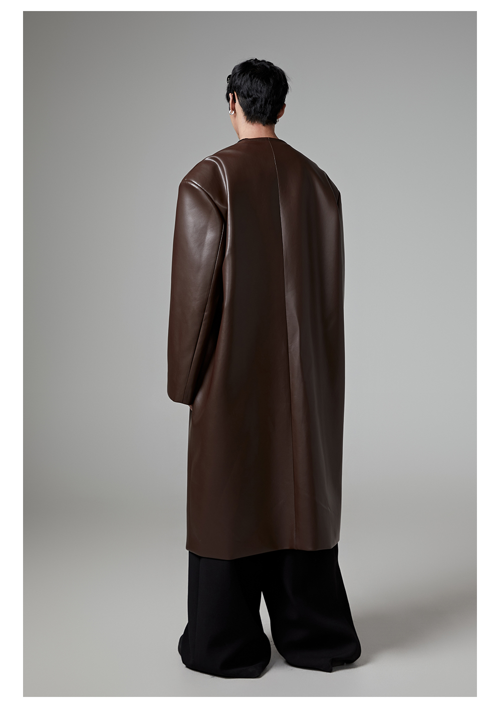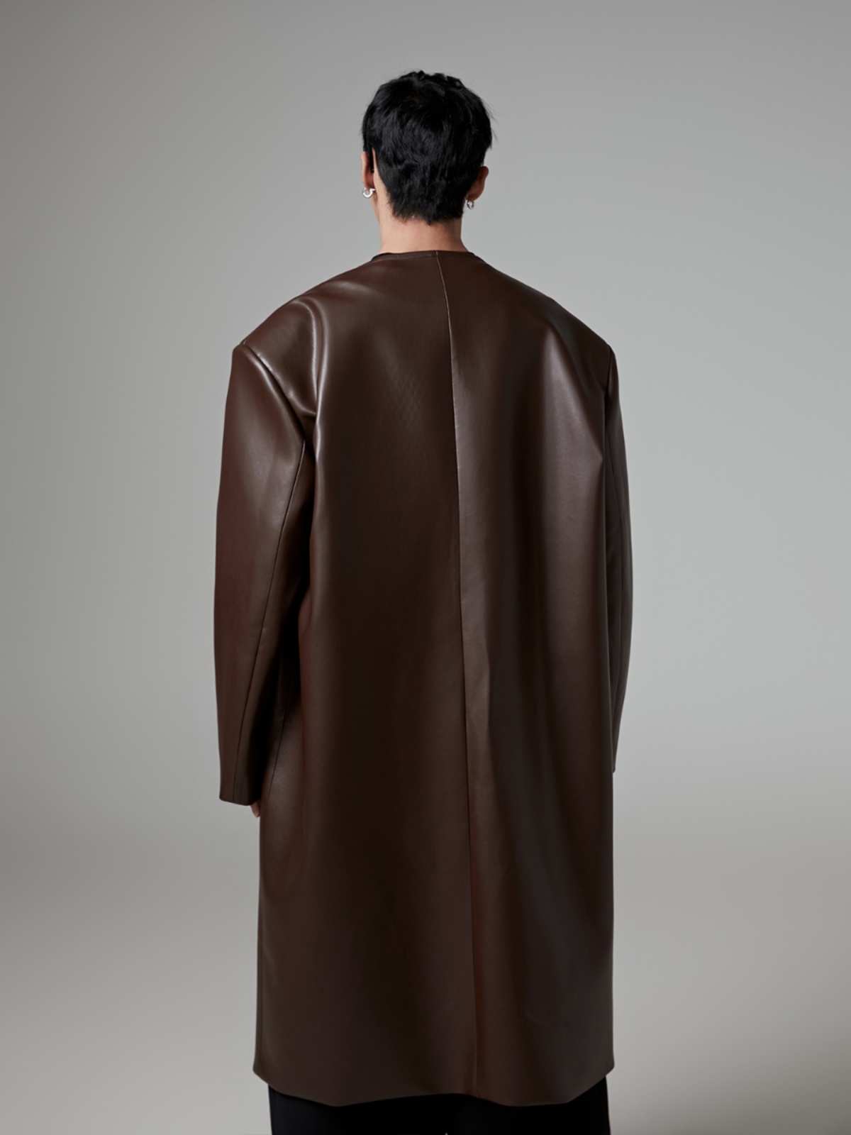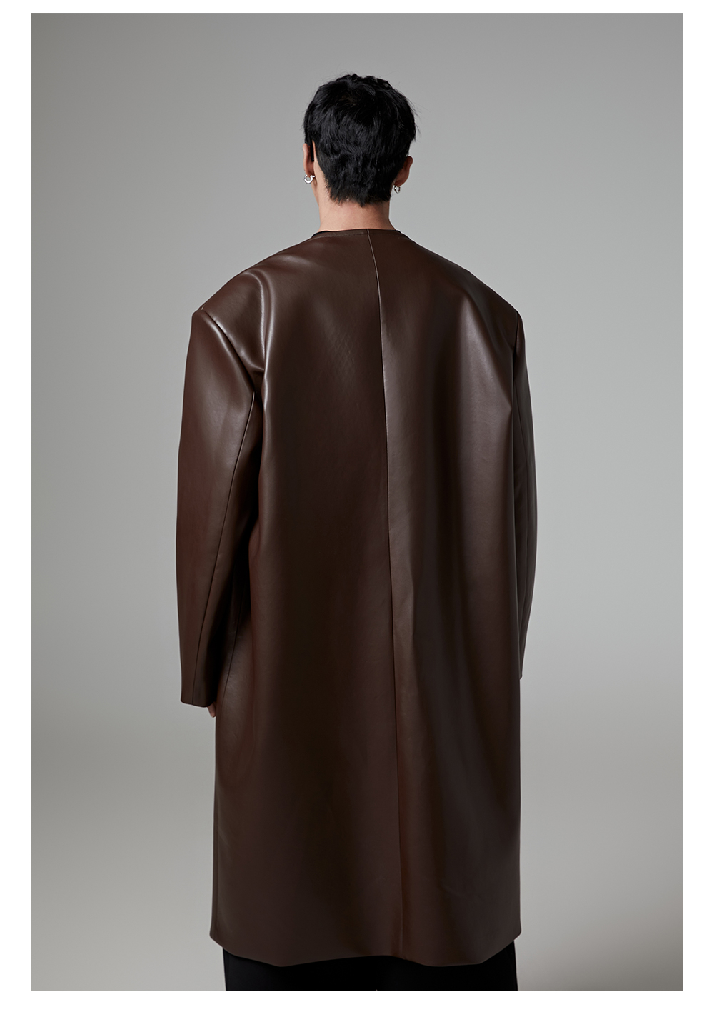 Oversize Collarless Mid-Length PU Leather Coat WN13310