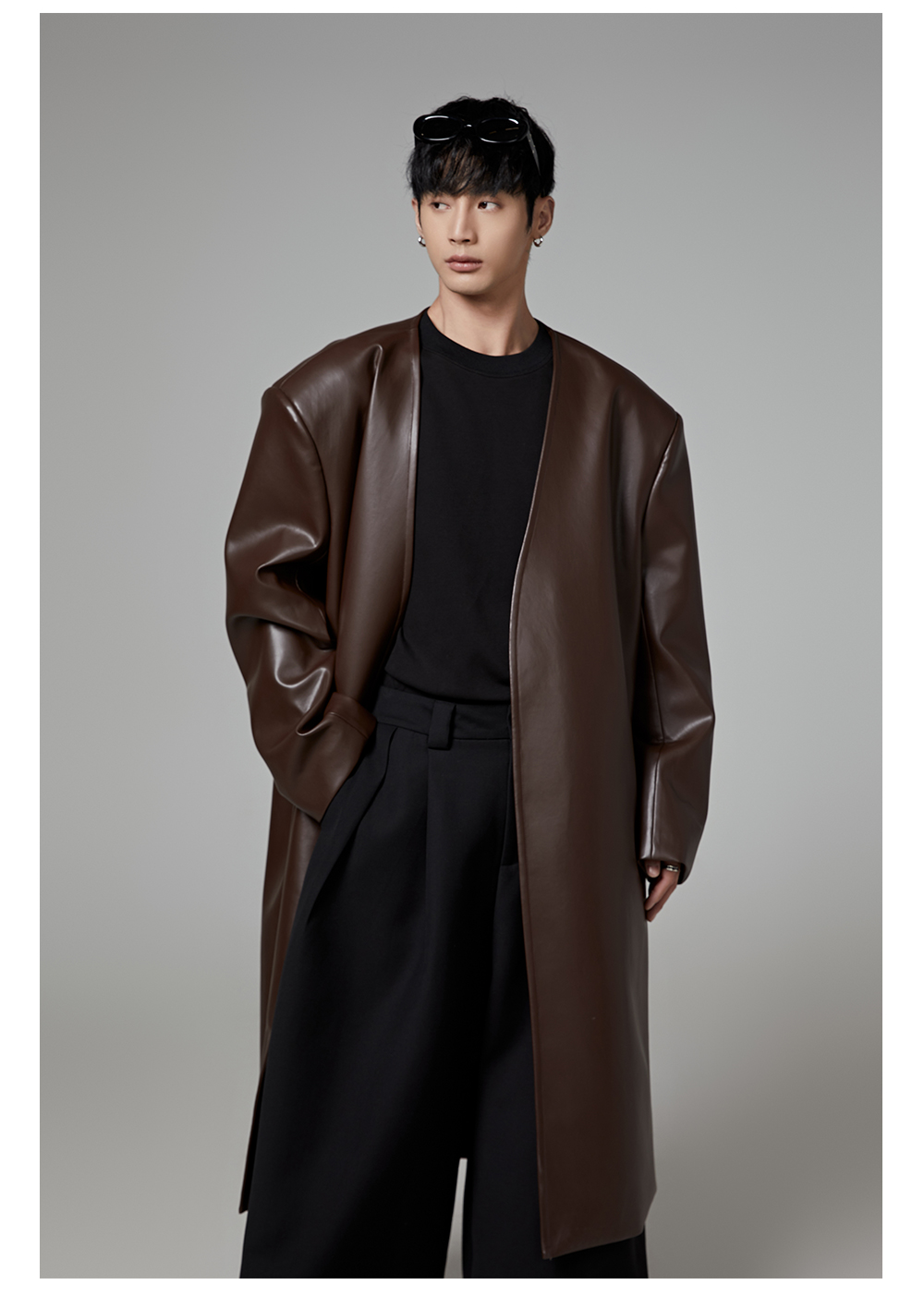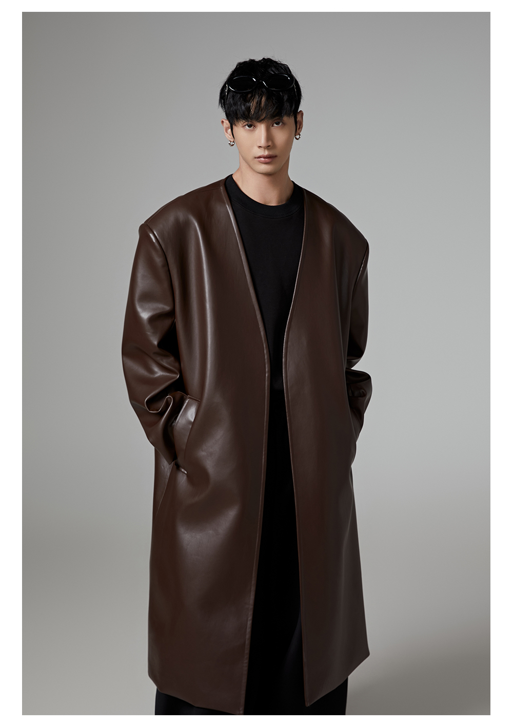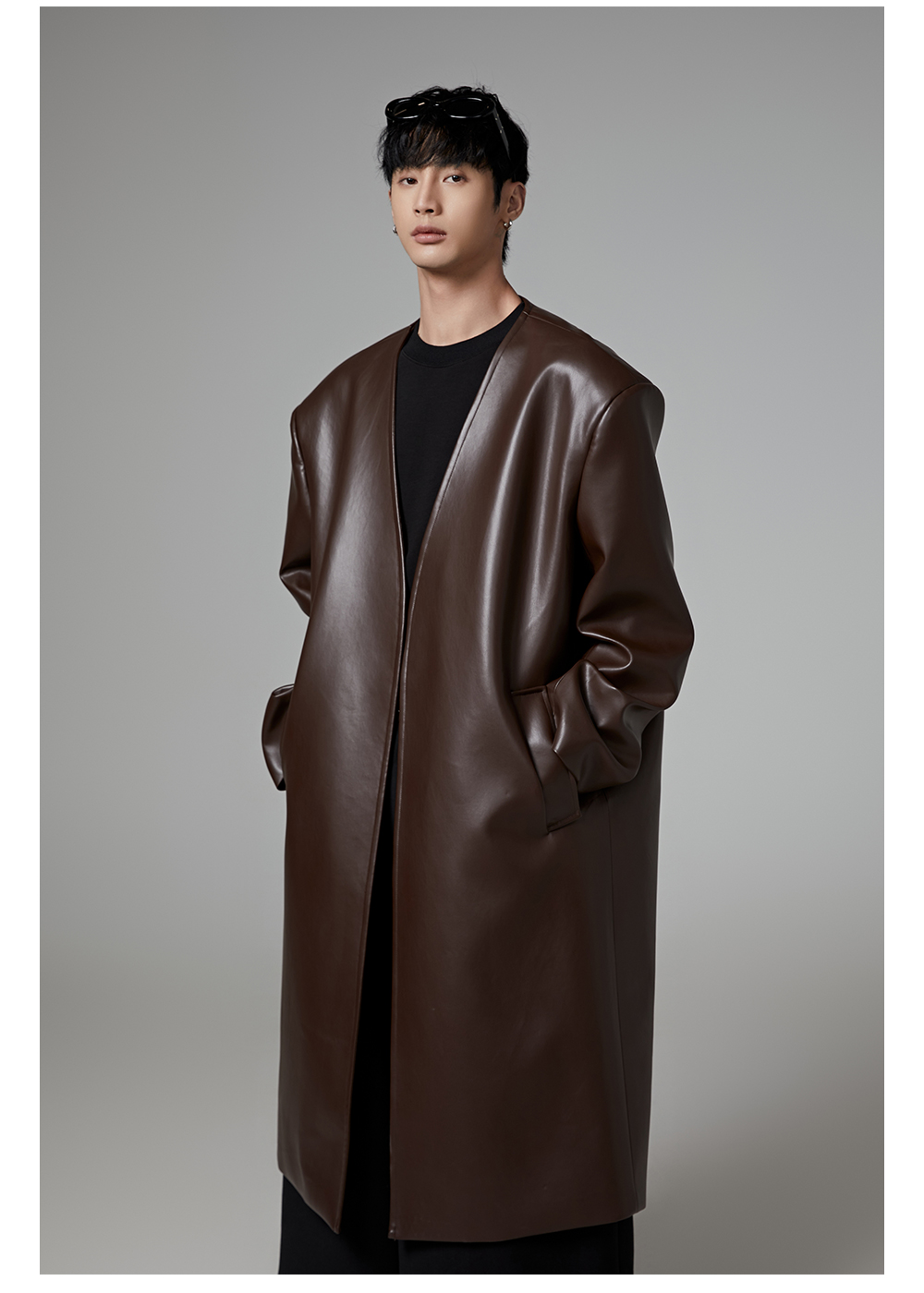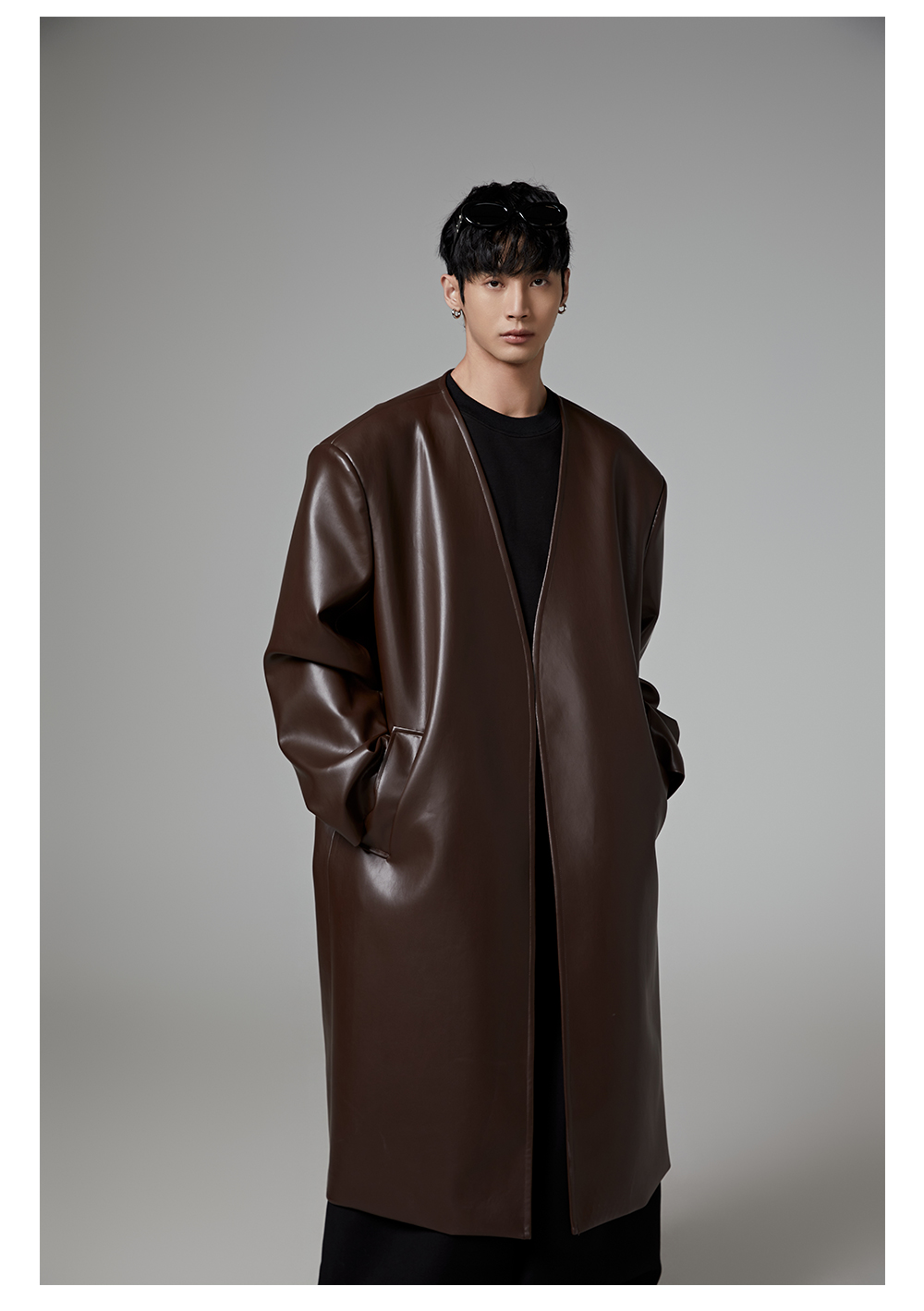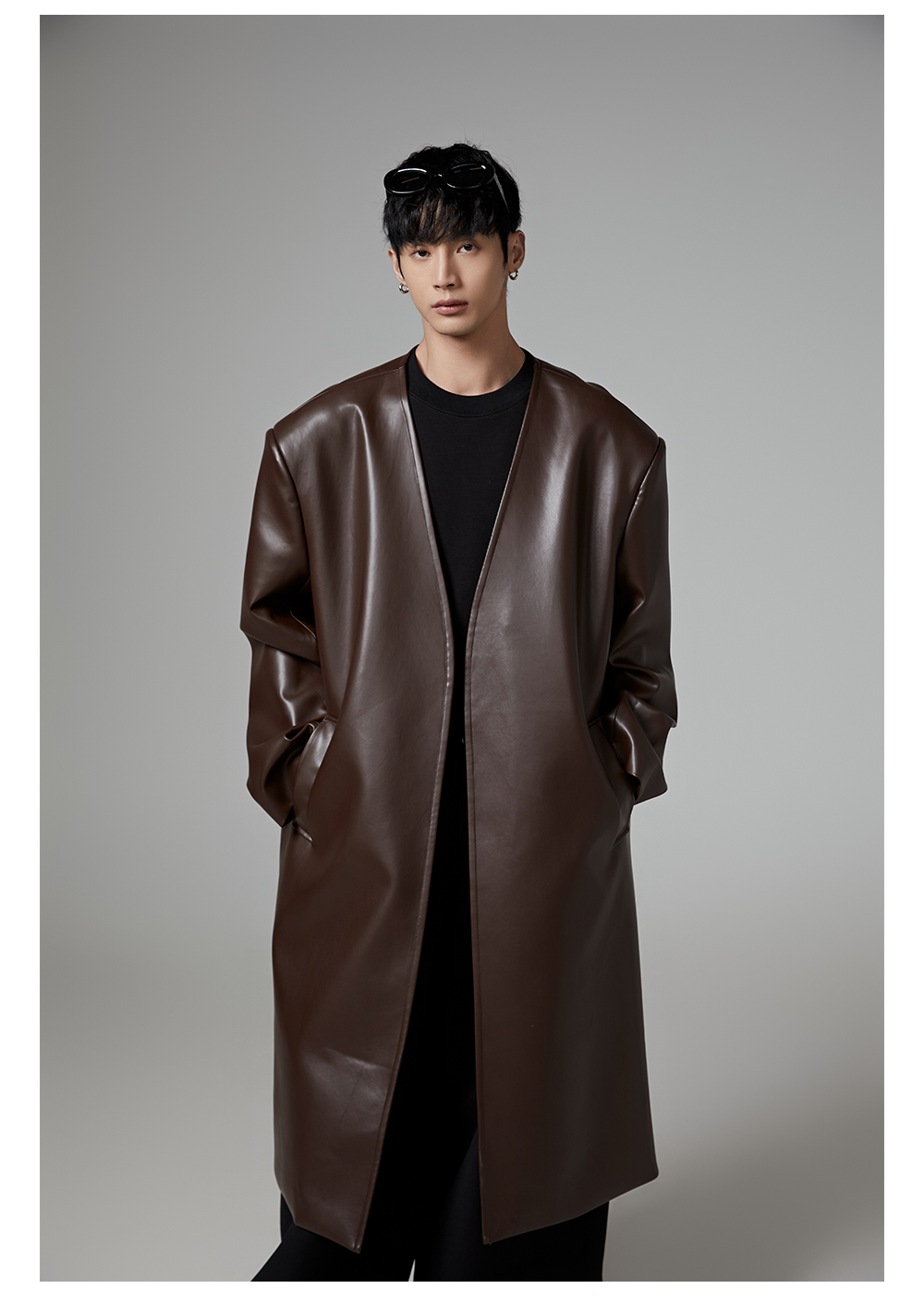 Oversize Collarless Mid-Length PU Leather Coat WN13310