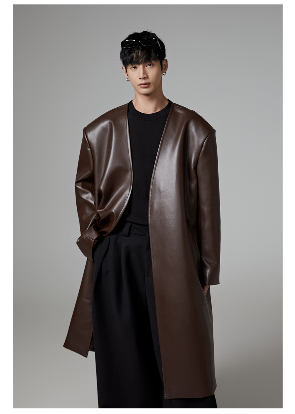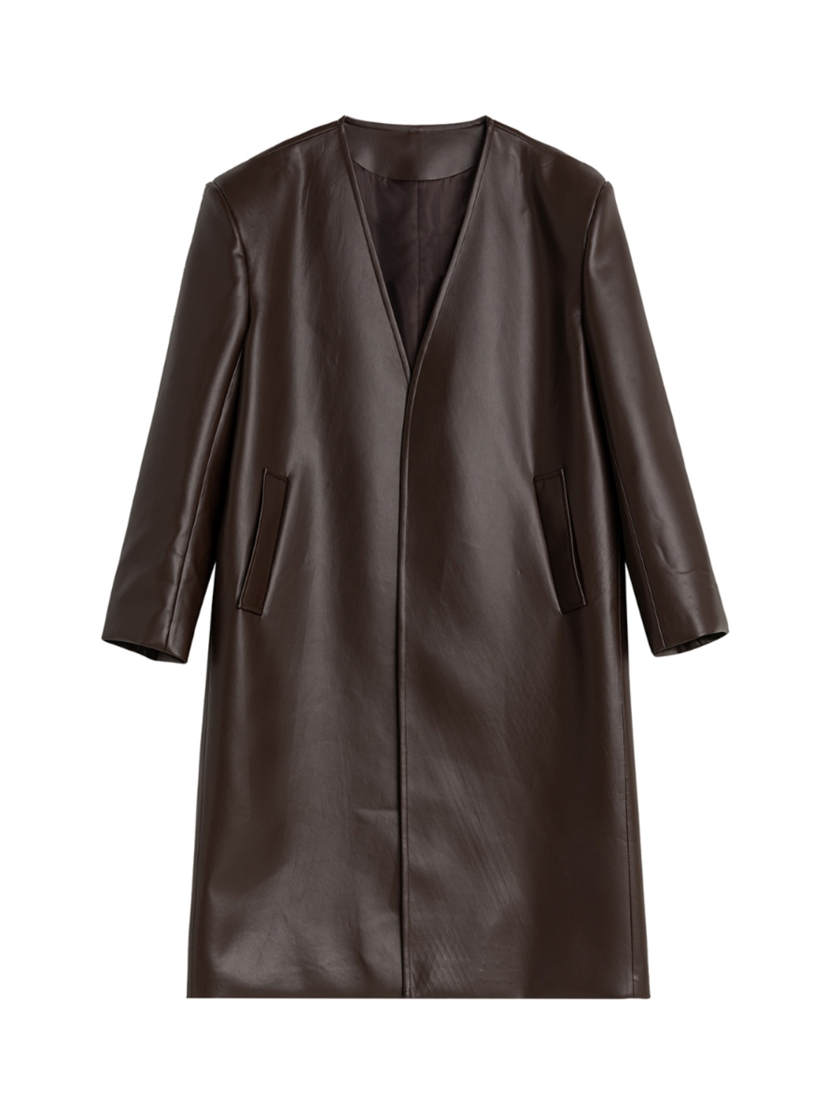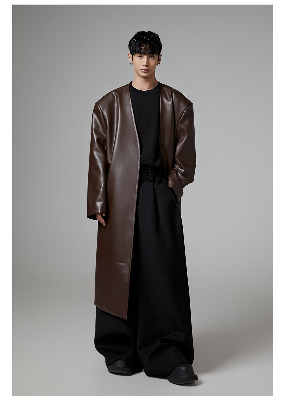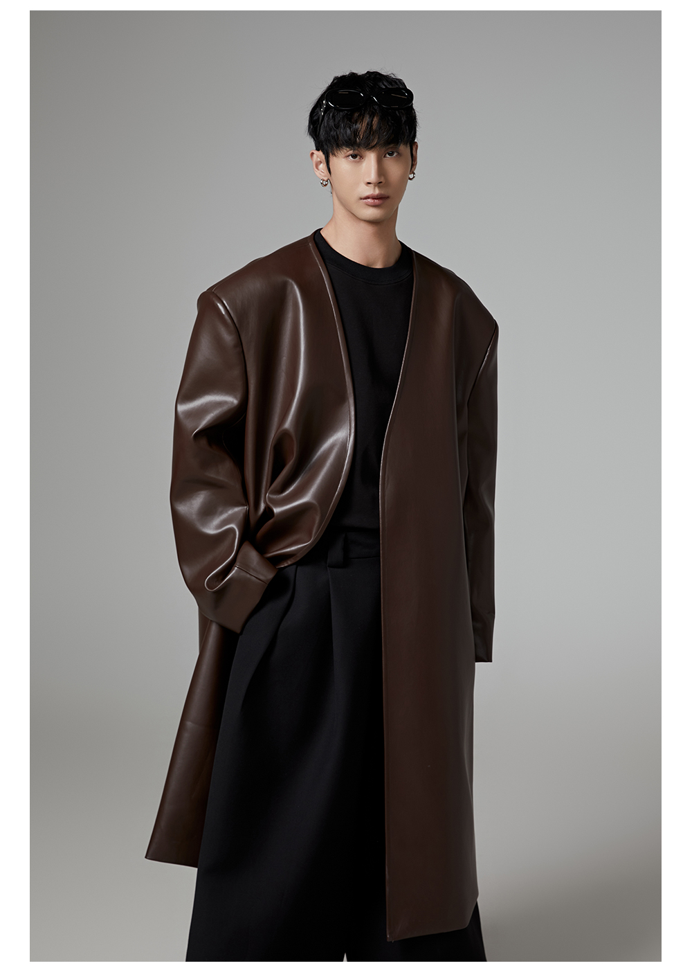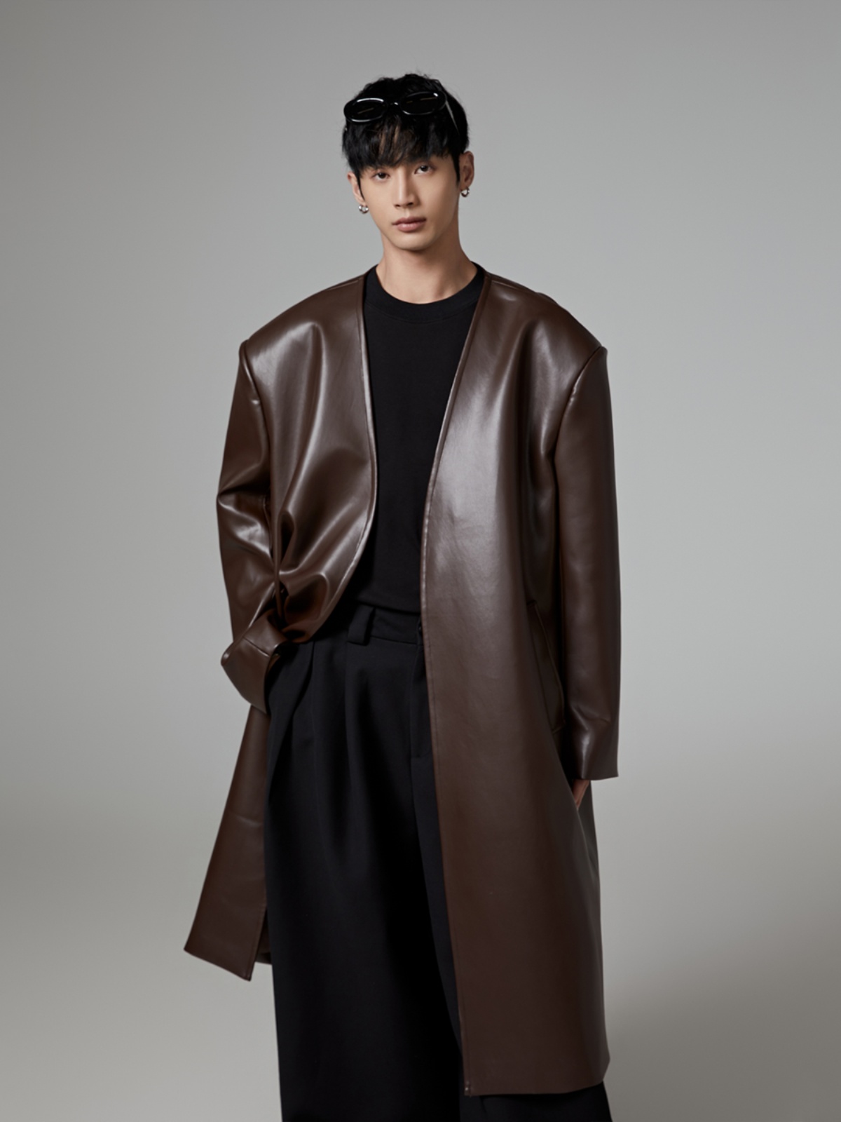 Oversize Collarless Mid-Length PU Leather Coat WN13310