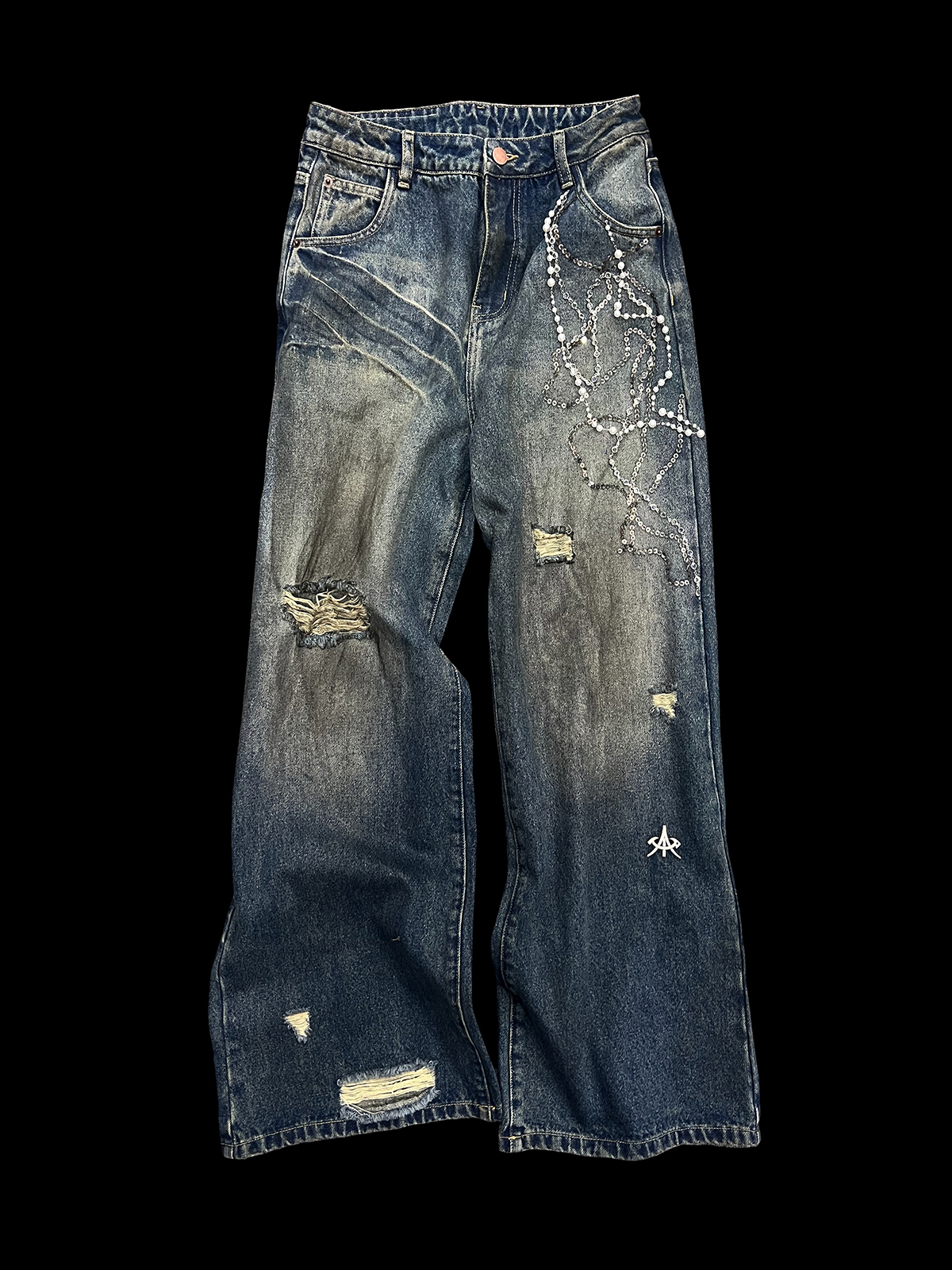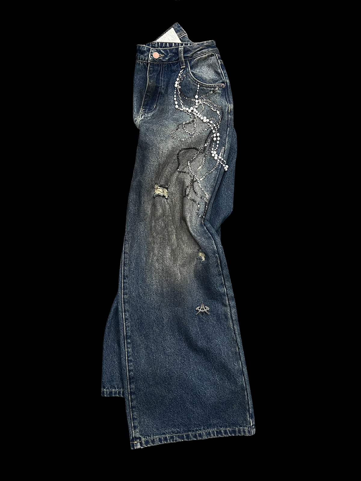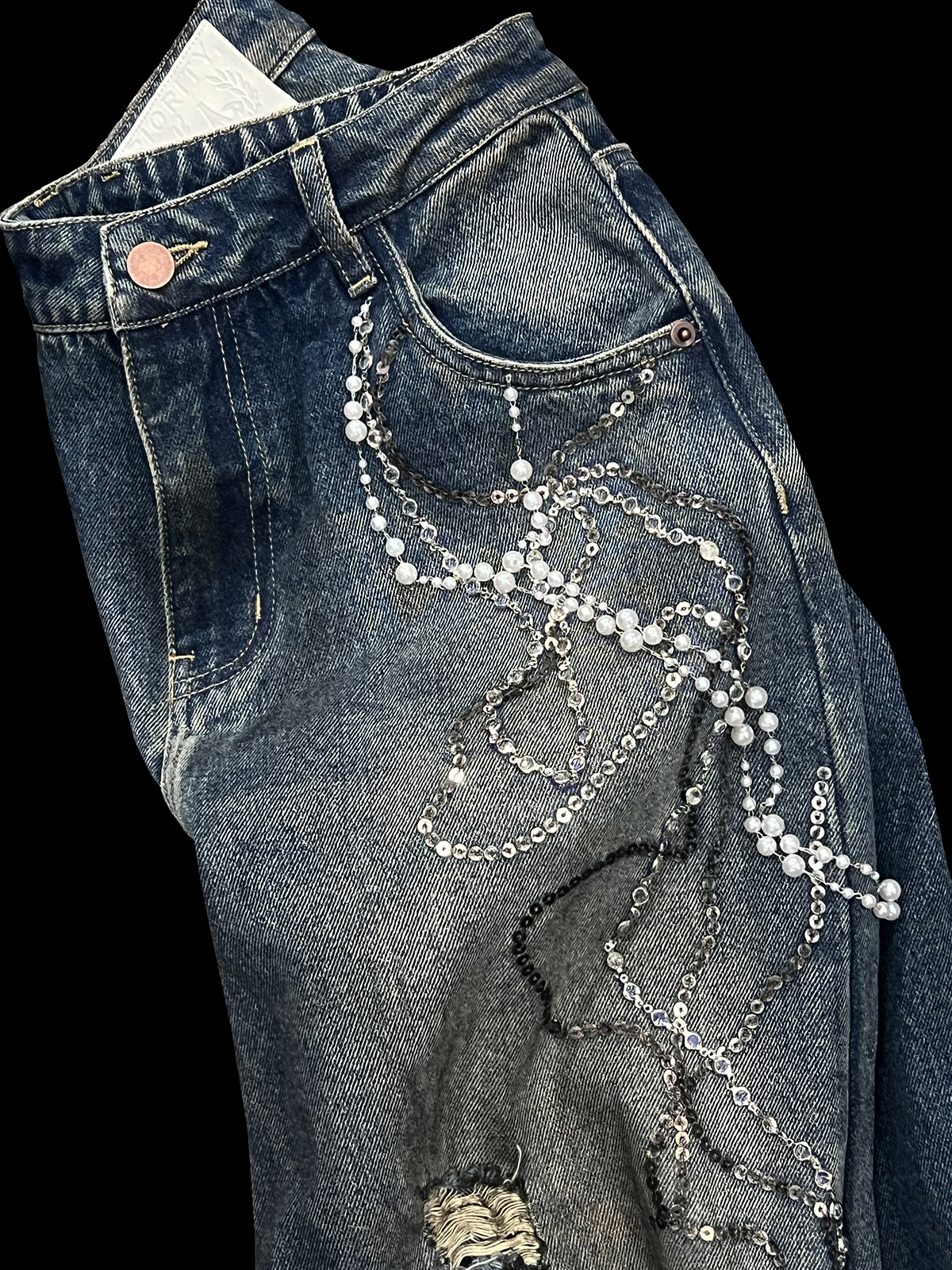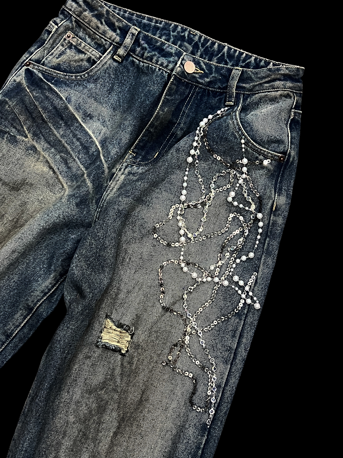 Sequin Embroidery Beaded Design Damage Wash Denim Jeans WN18927