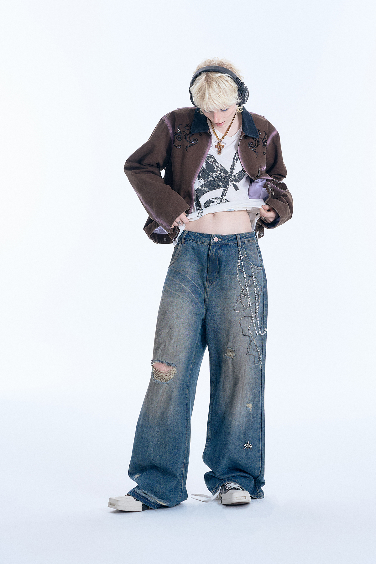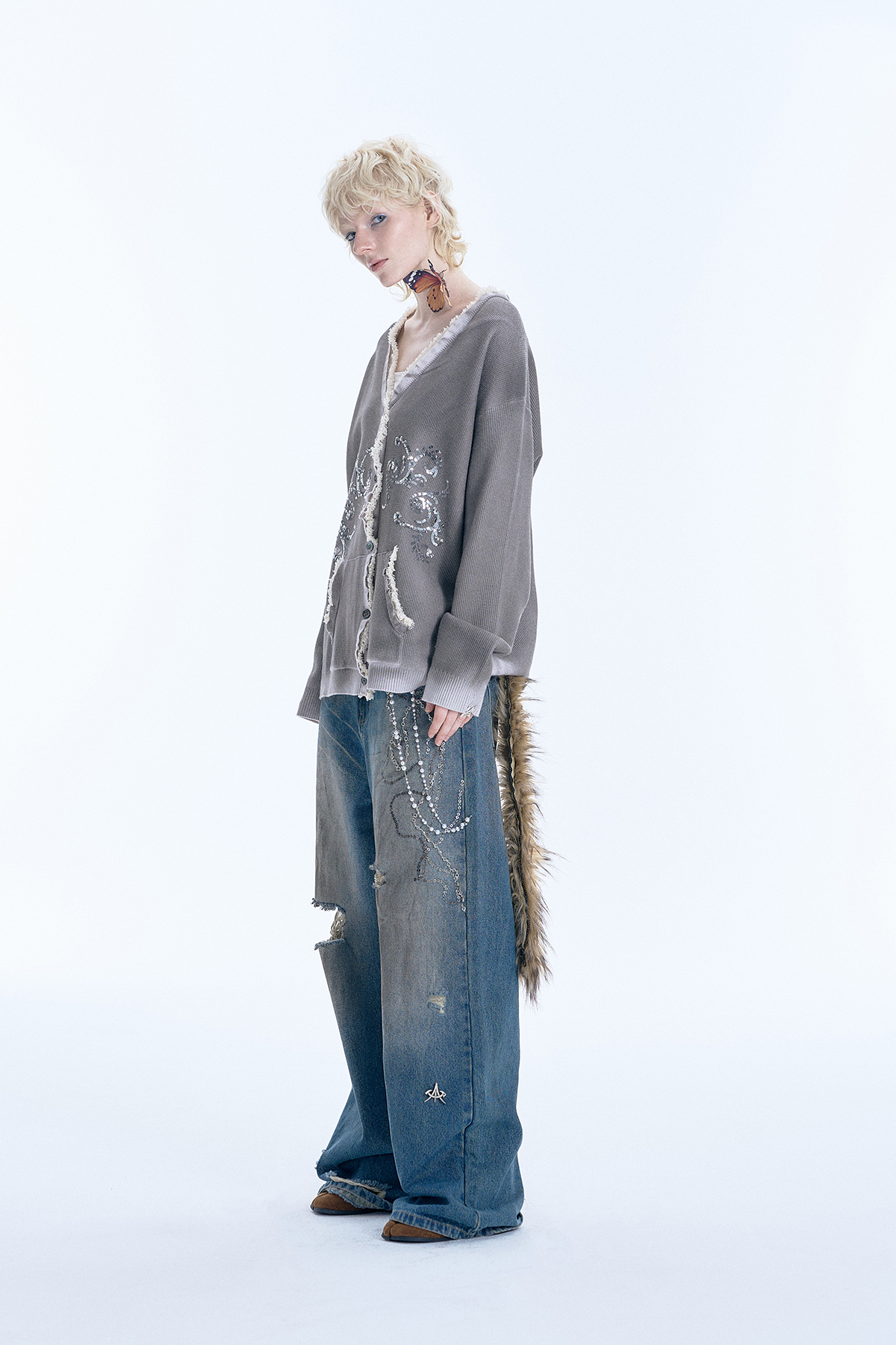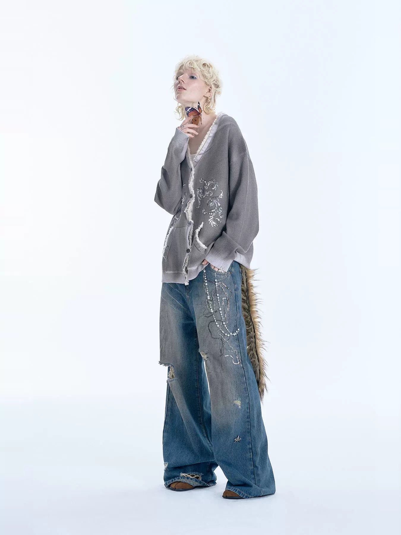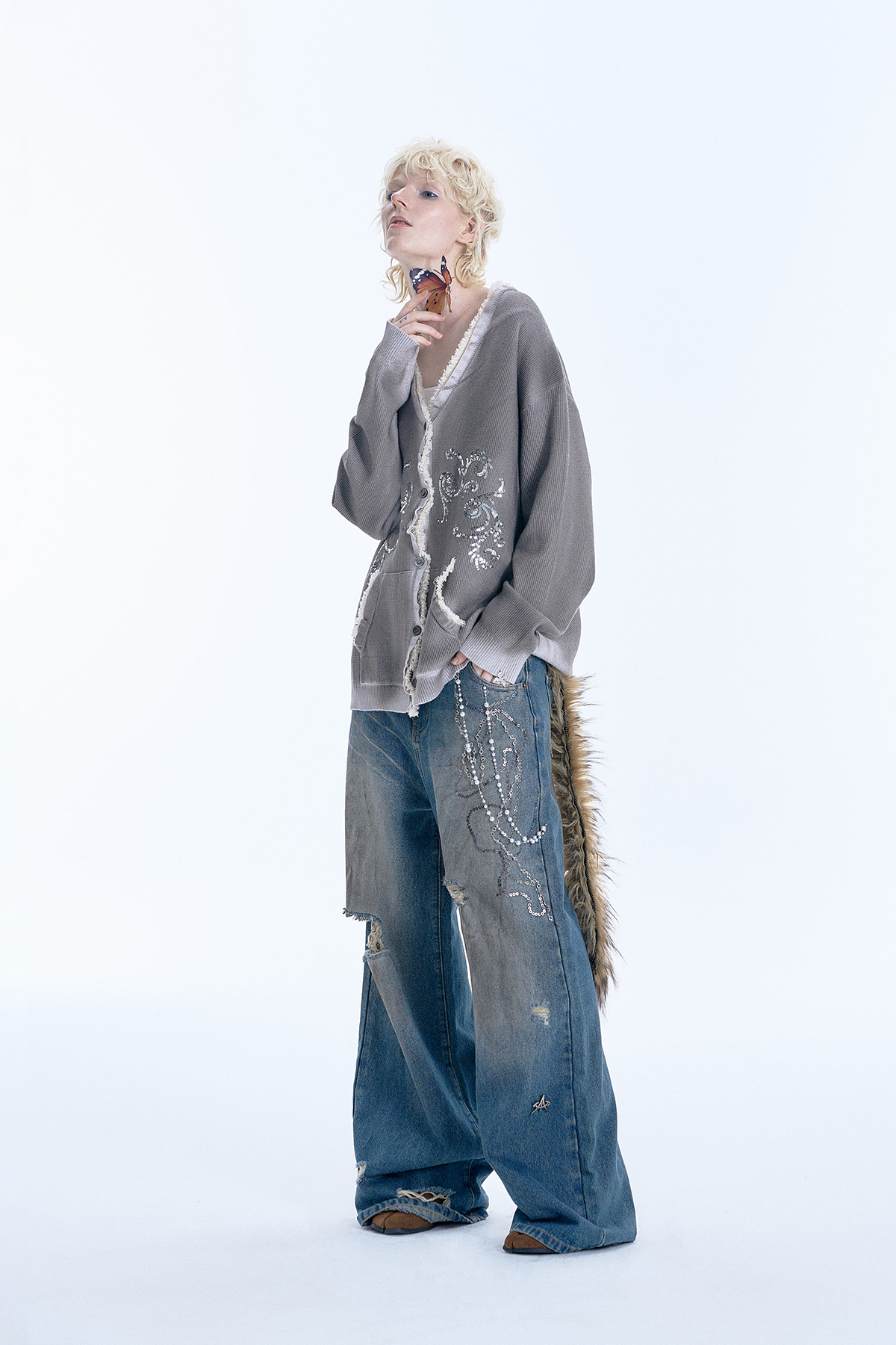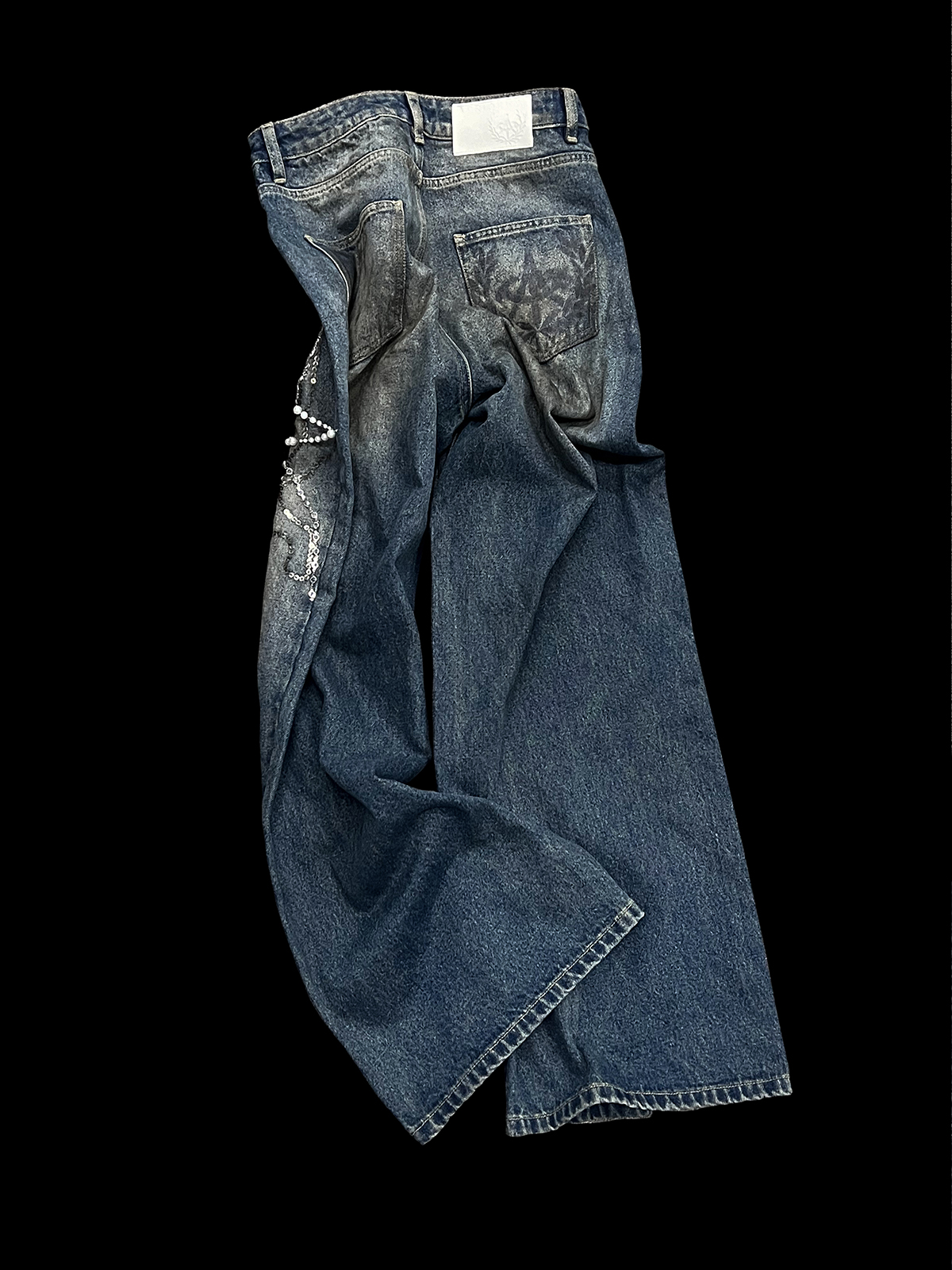 Sequin Embroidery Beaded Design Damage Wash Denim Jeans WN18927