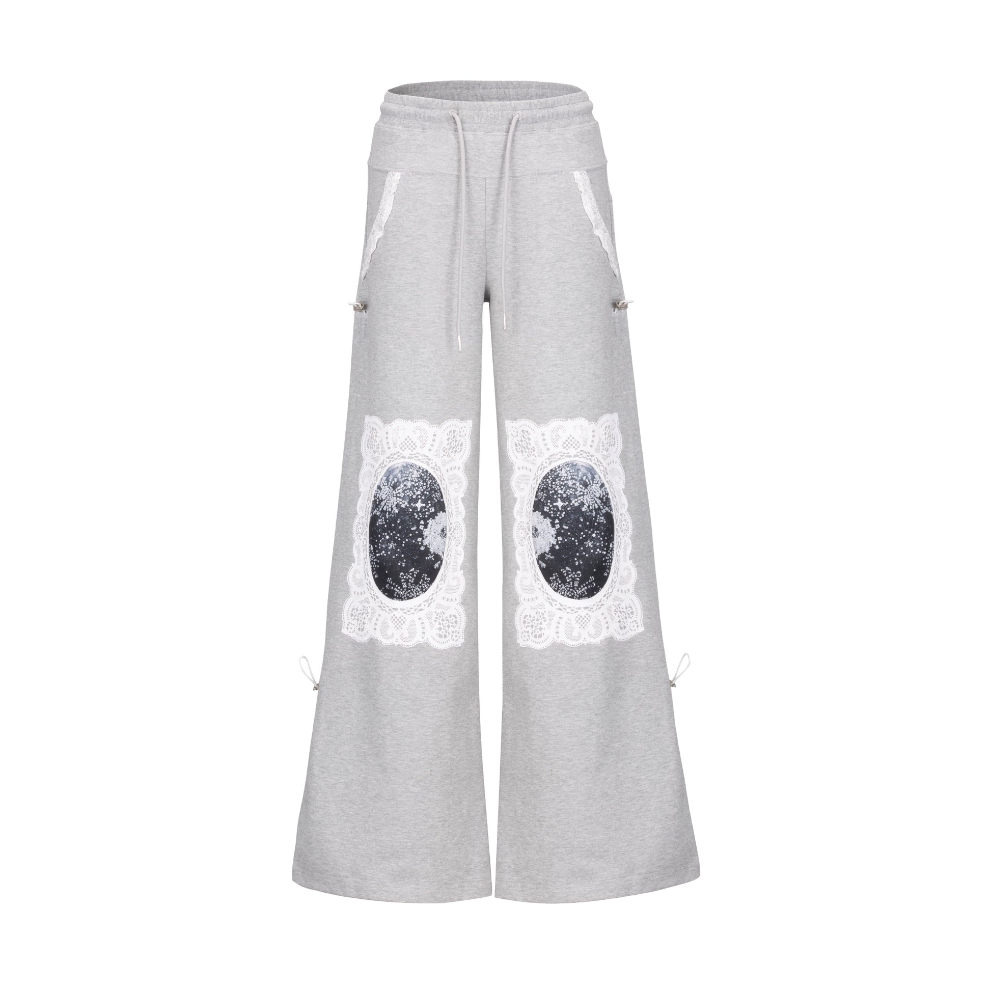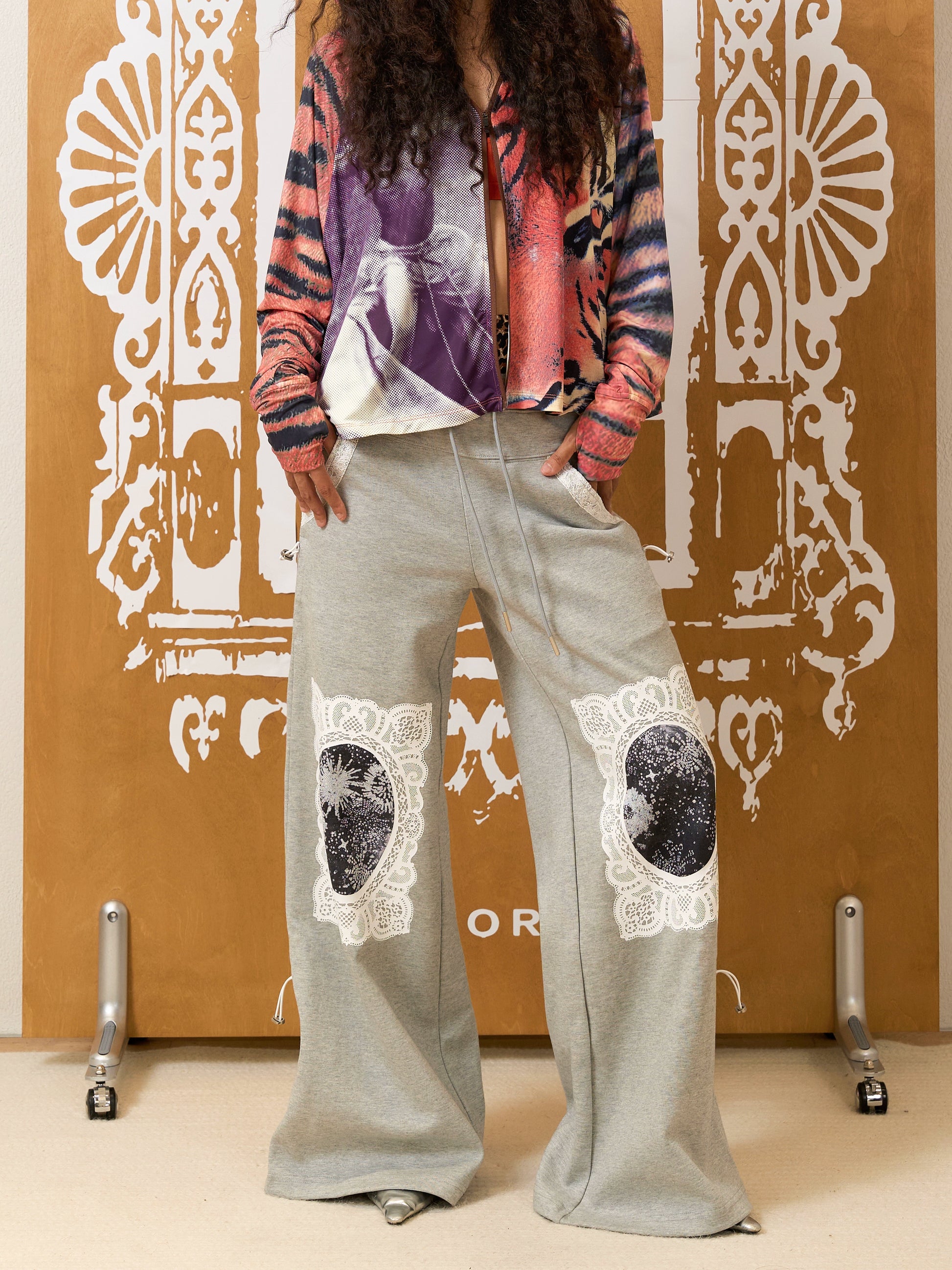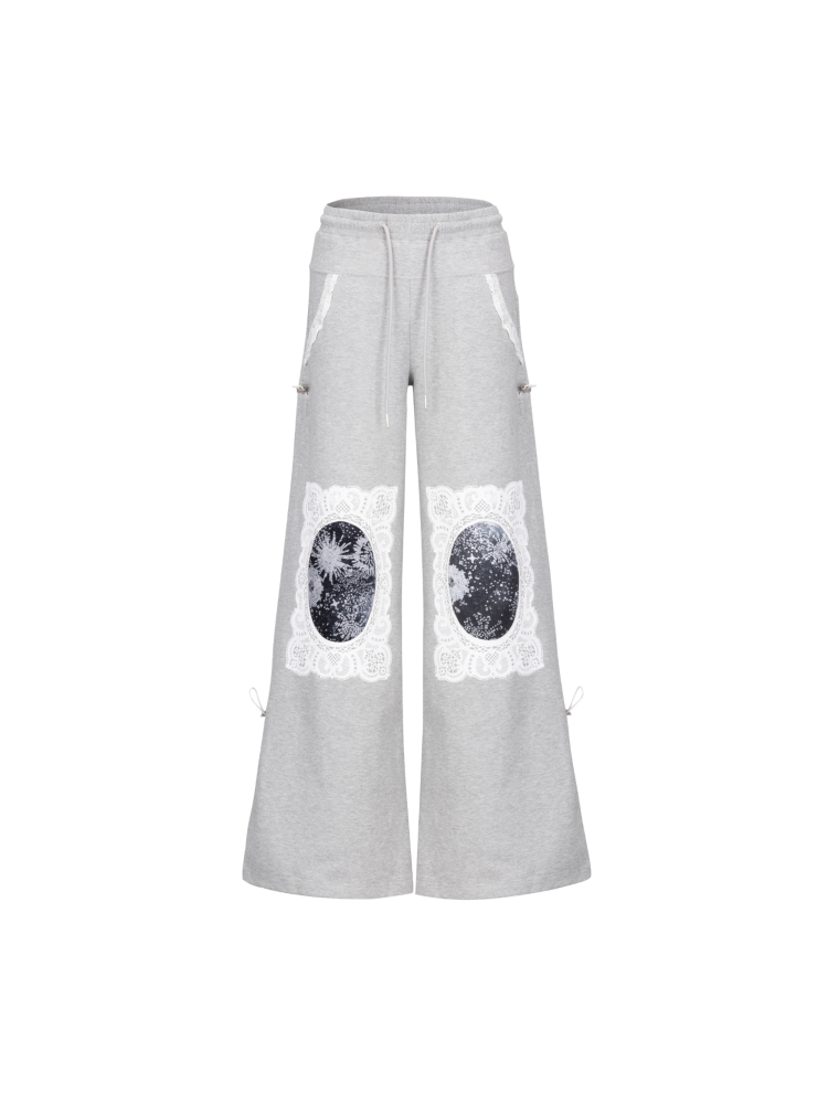 Lace Trim Sequin Print Wide Leg Flare Sweatopants WN19017