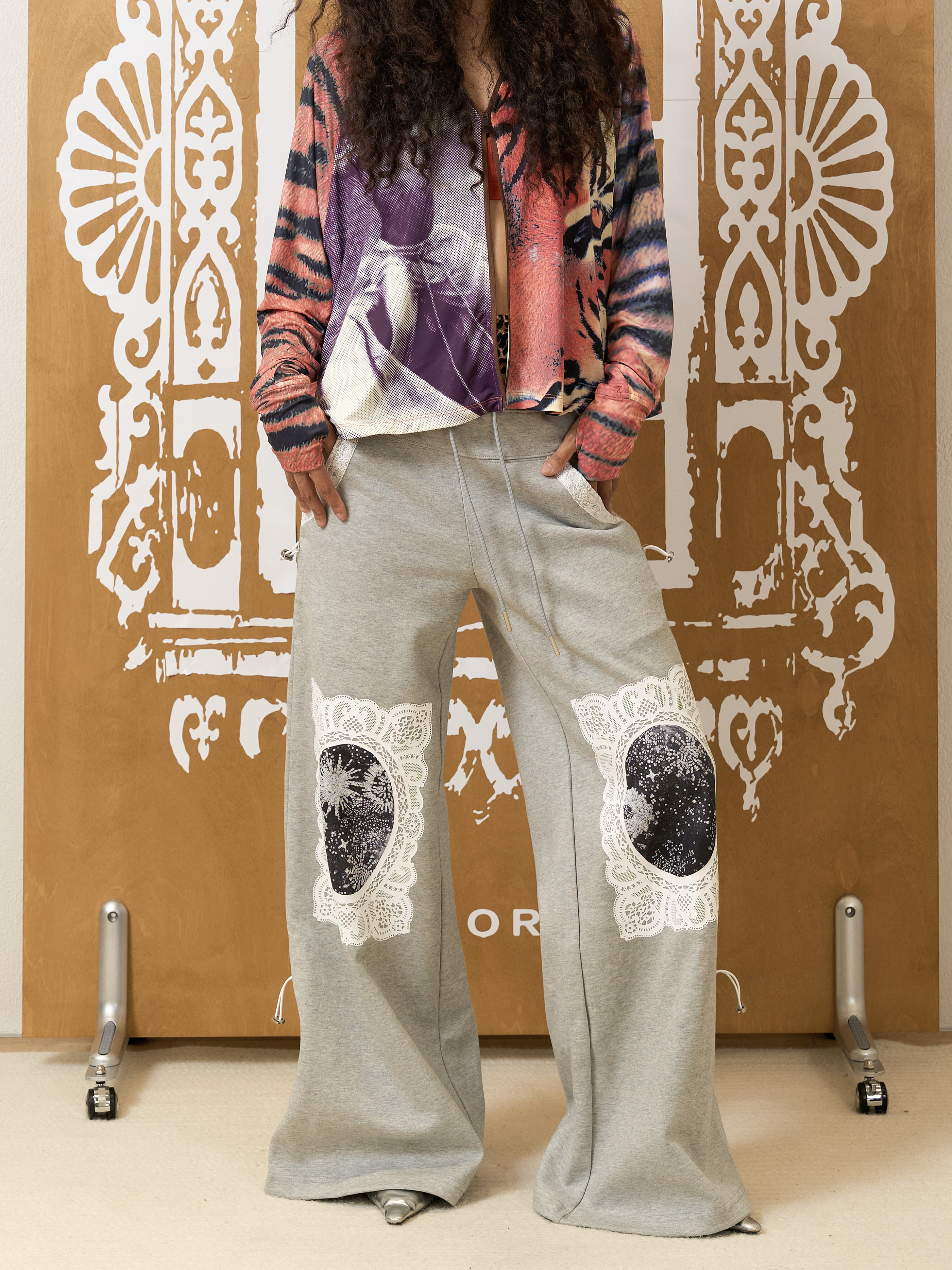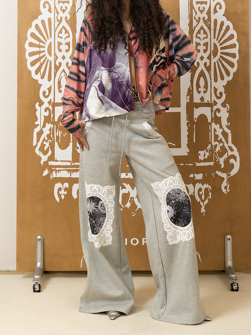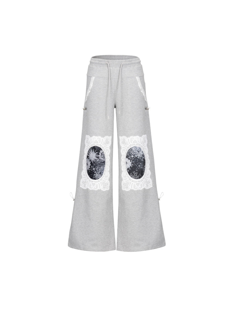 Lace Trim Sequin Print Wide Leg Flare Sweatopants WN19017