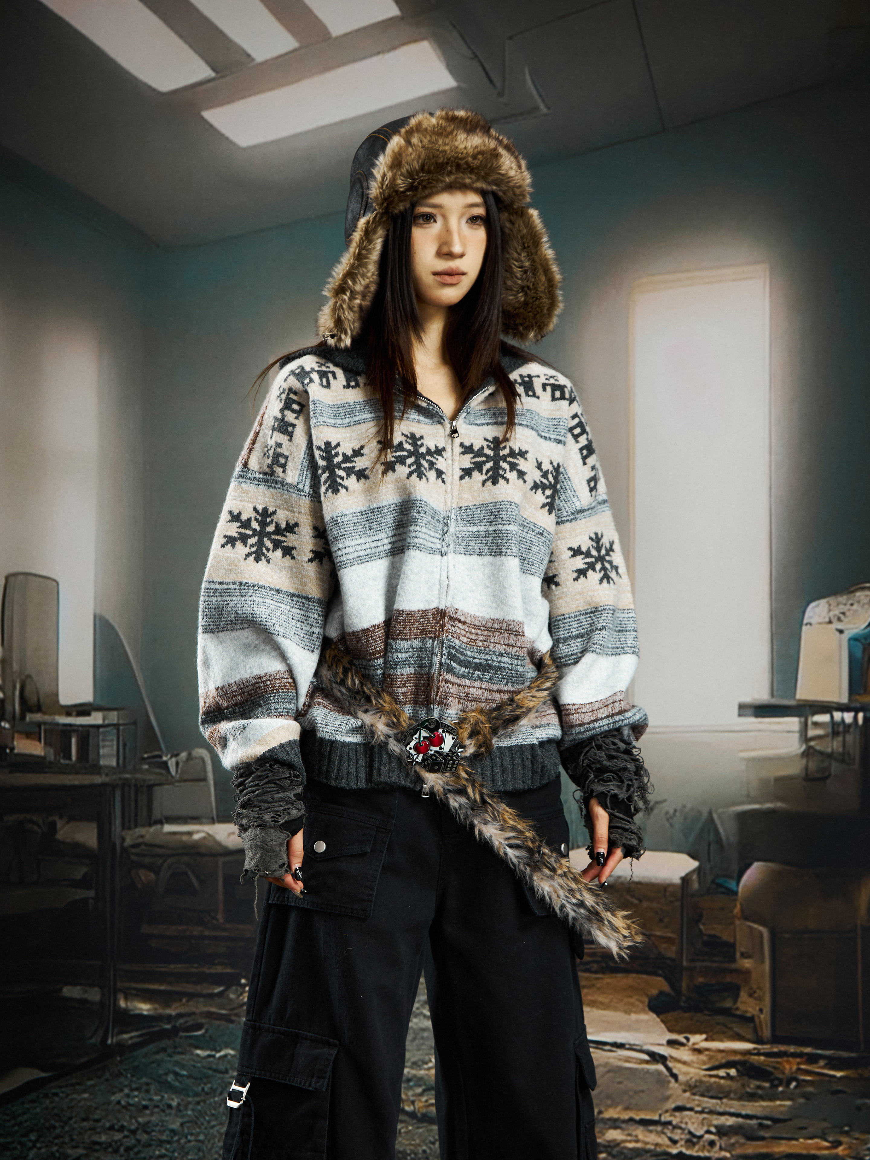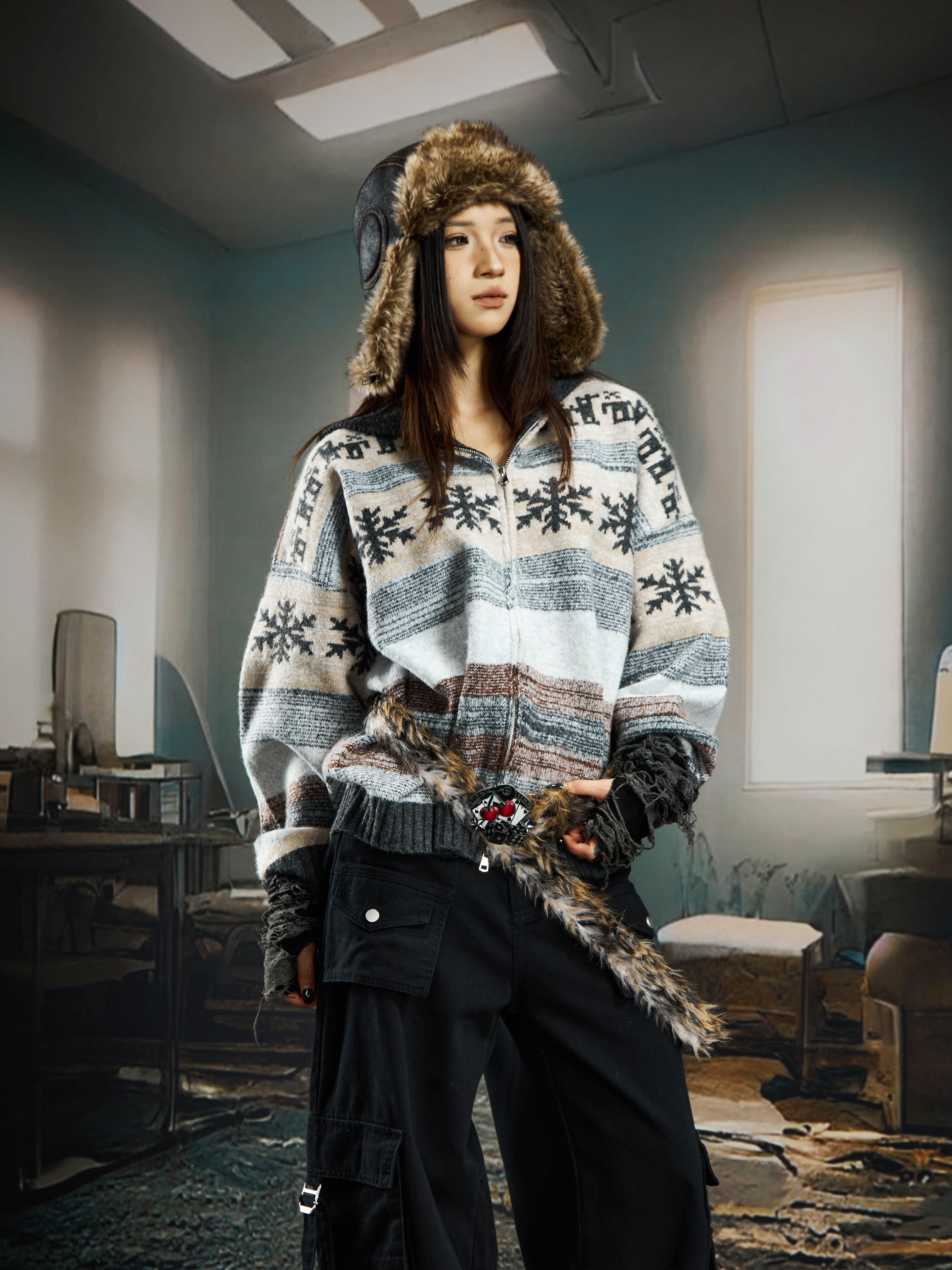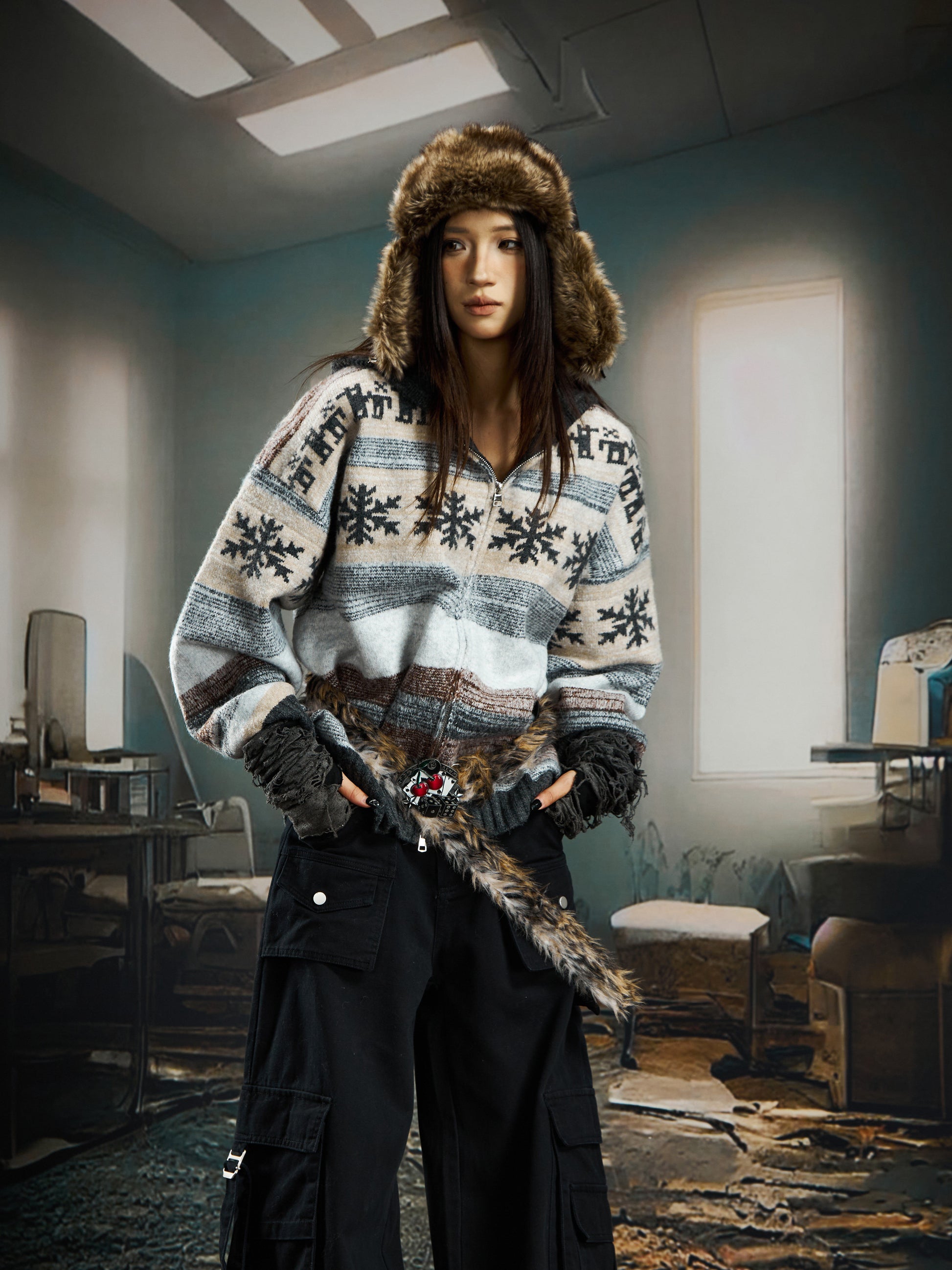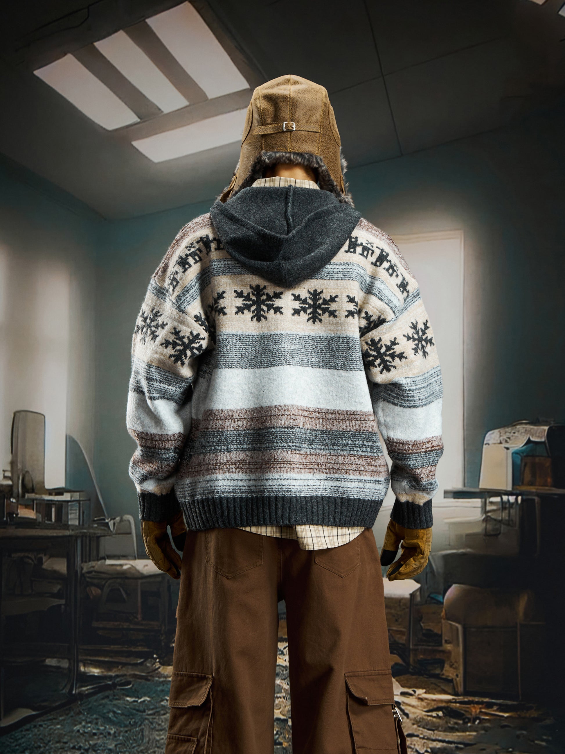 nowflake Contrast Hooded Zipper Knit Cardigan WN22750