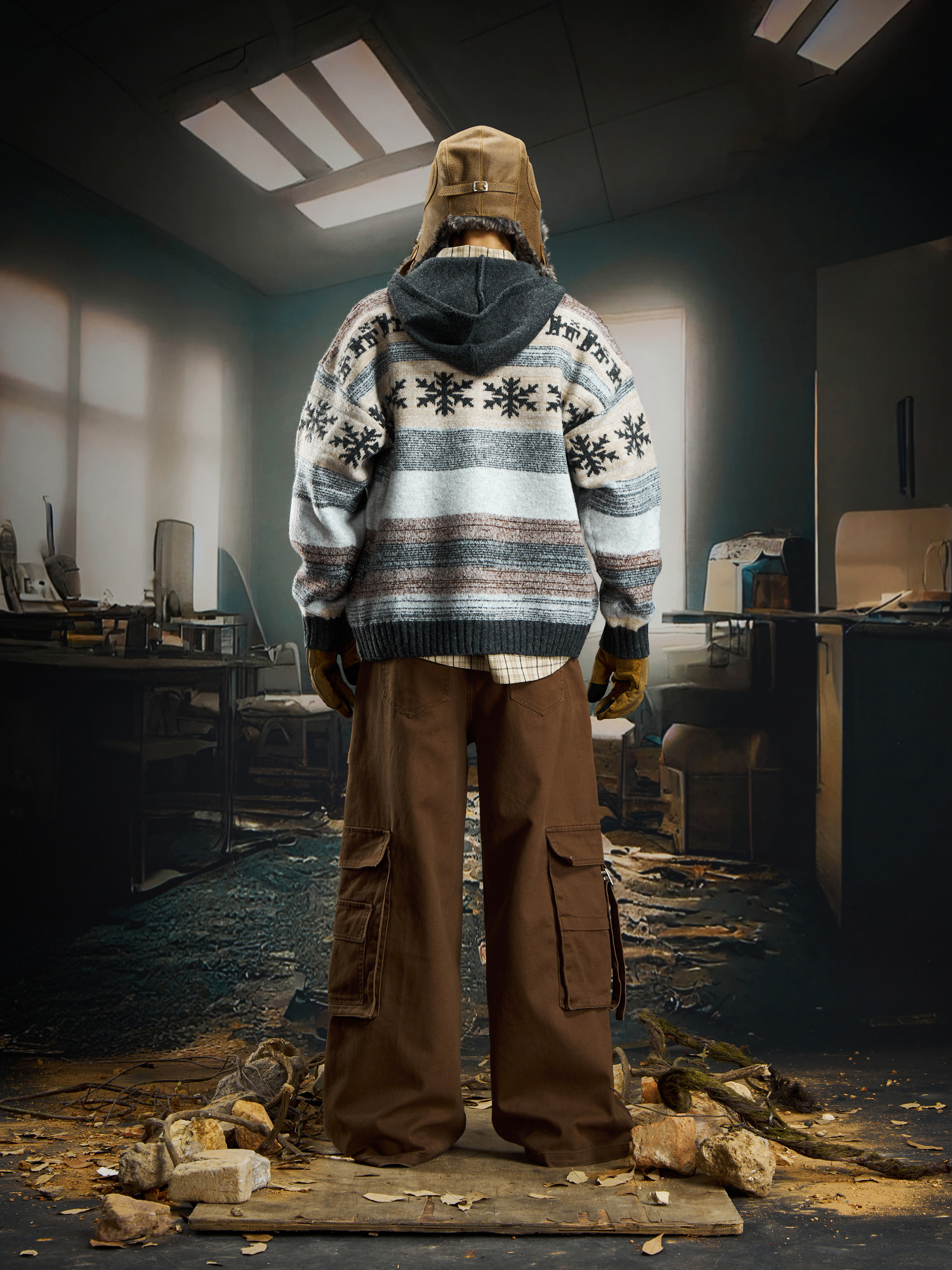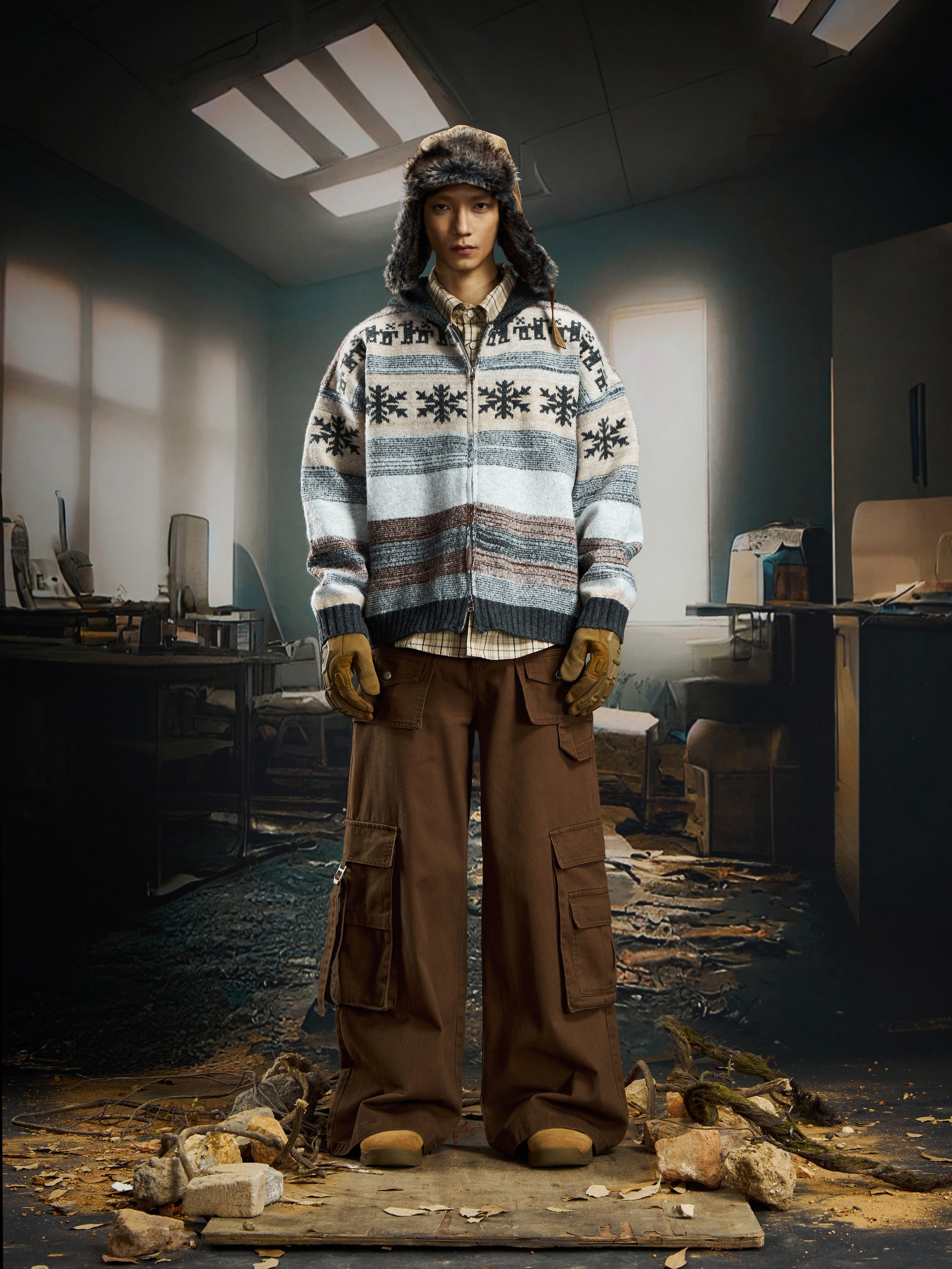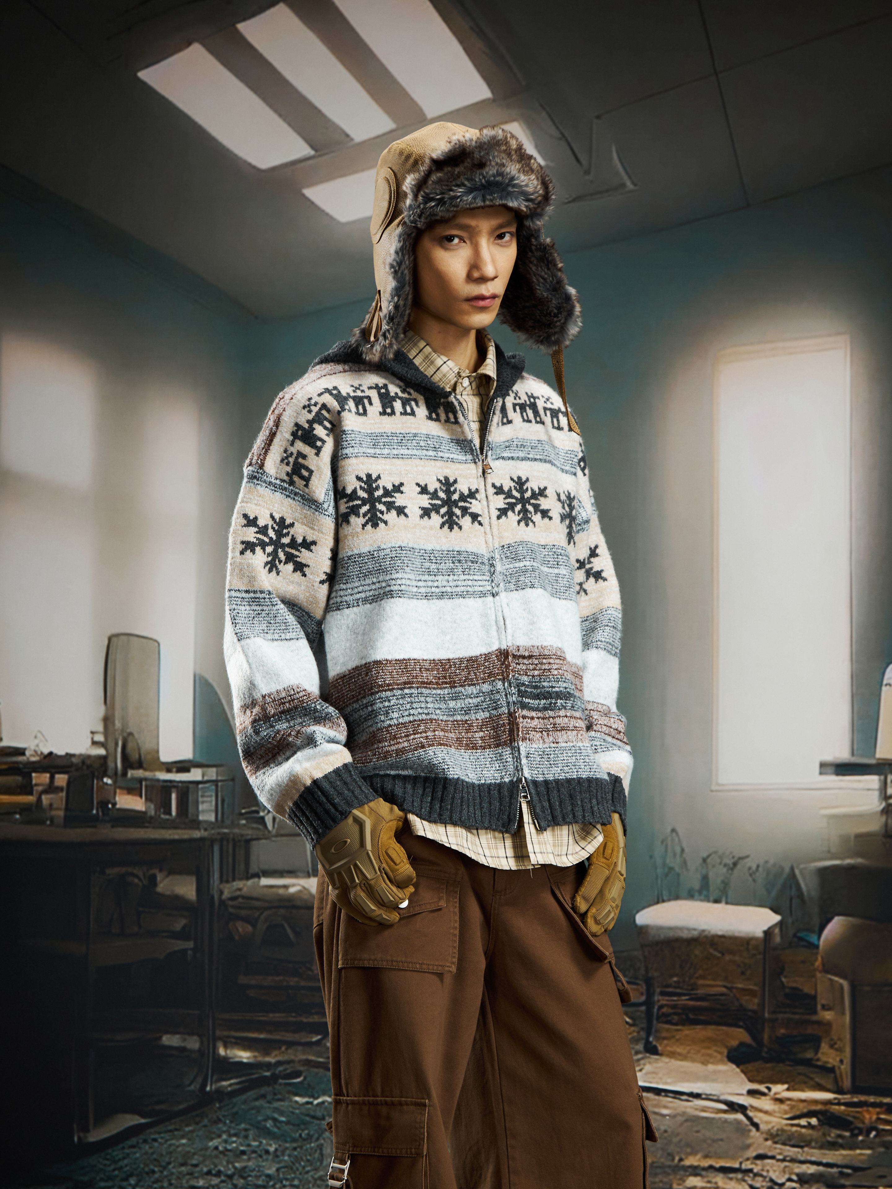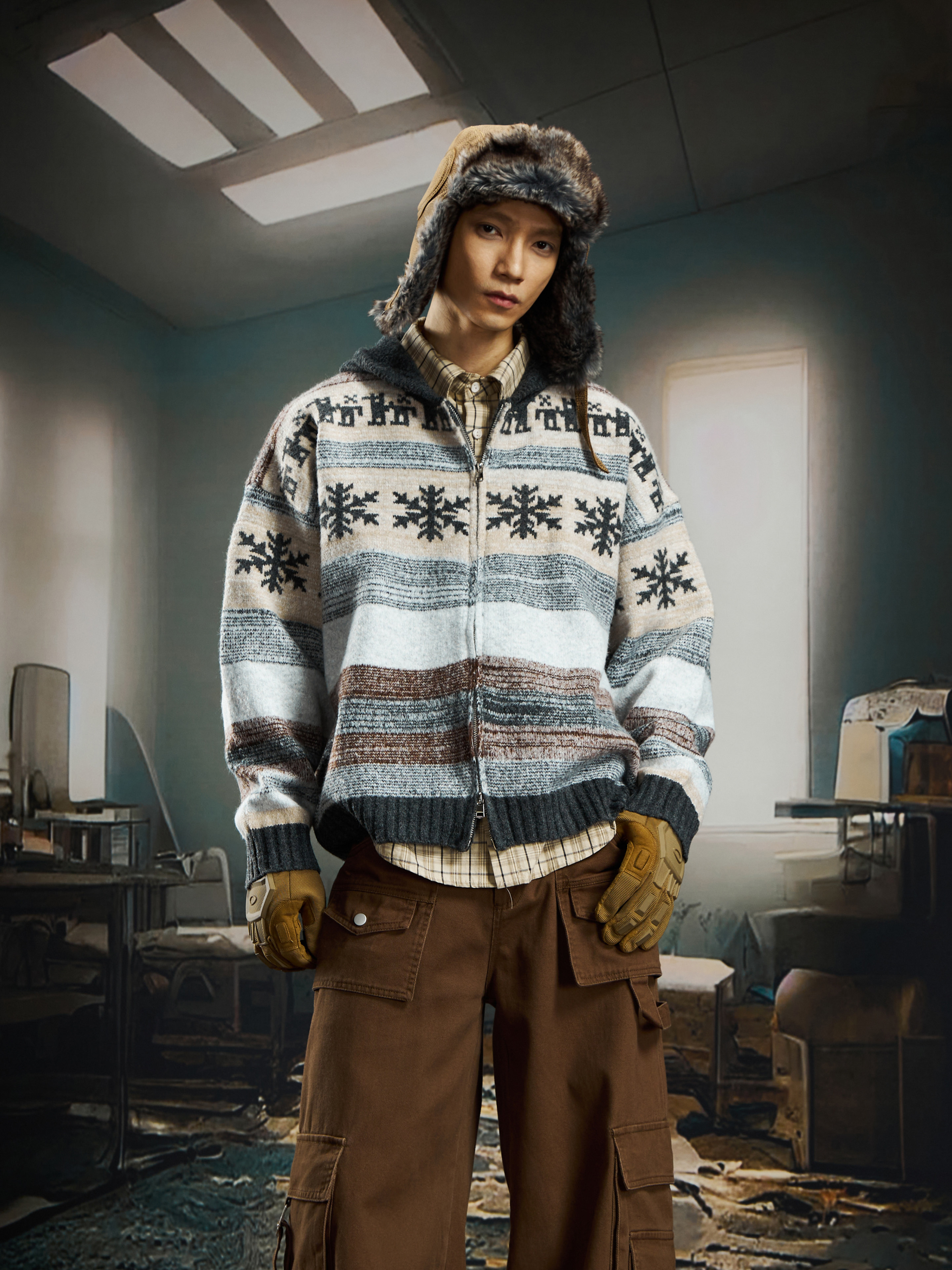 nowflake Contrast Hooded Zipper Knit Cardigan WN22750