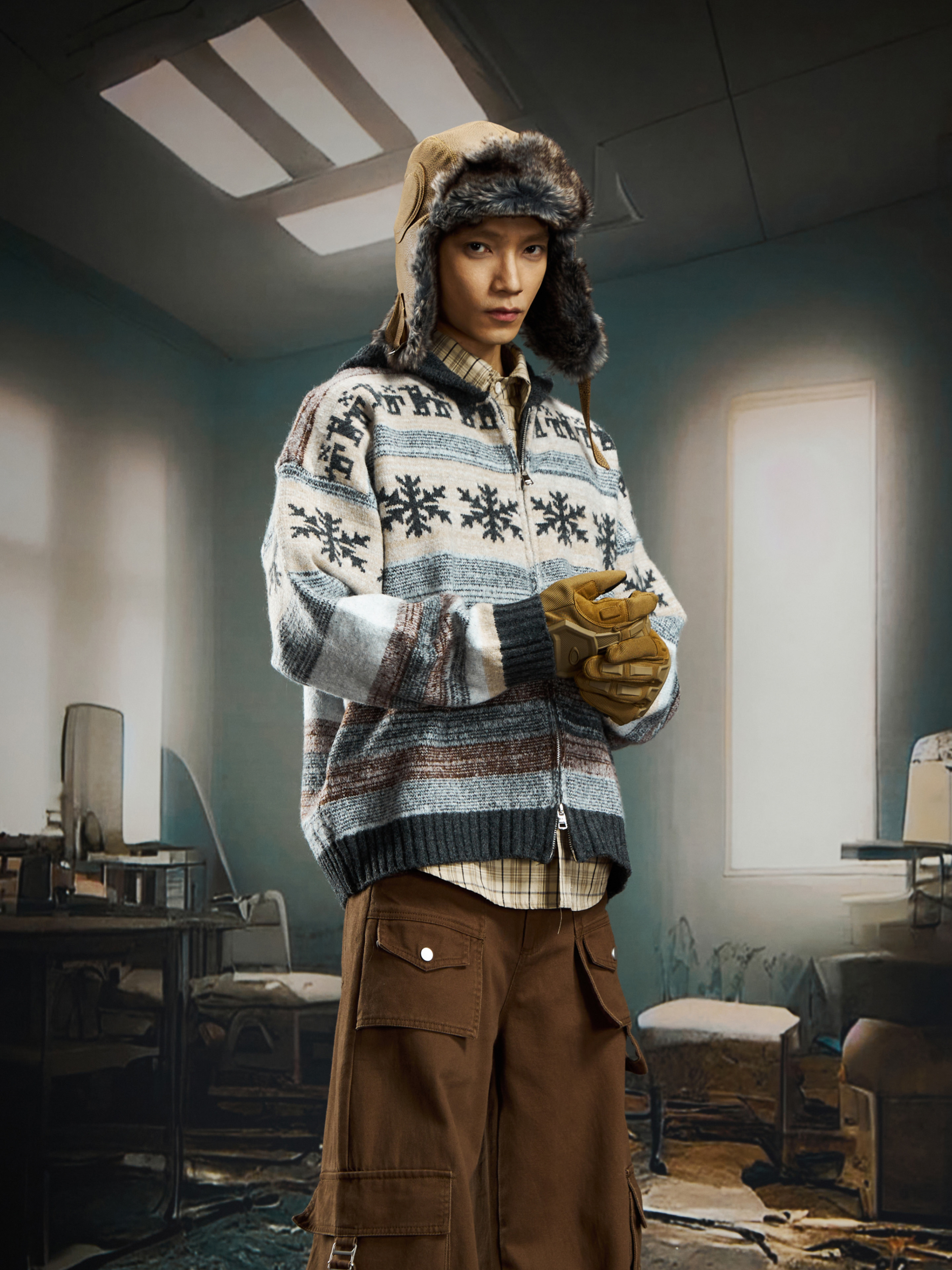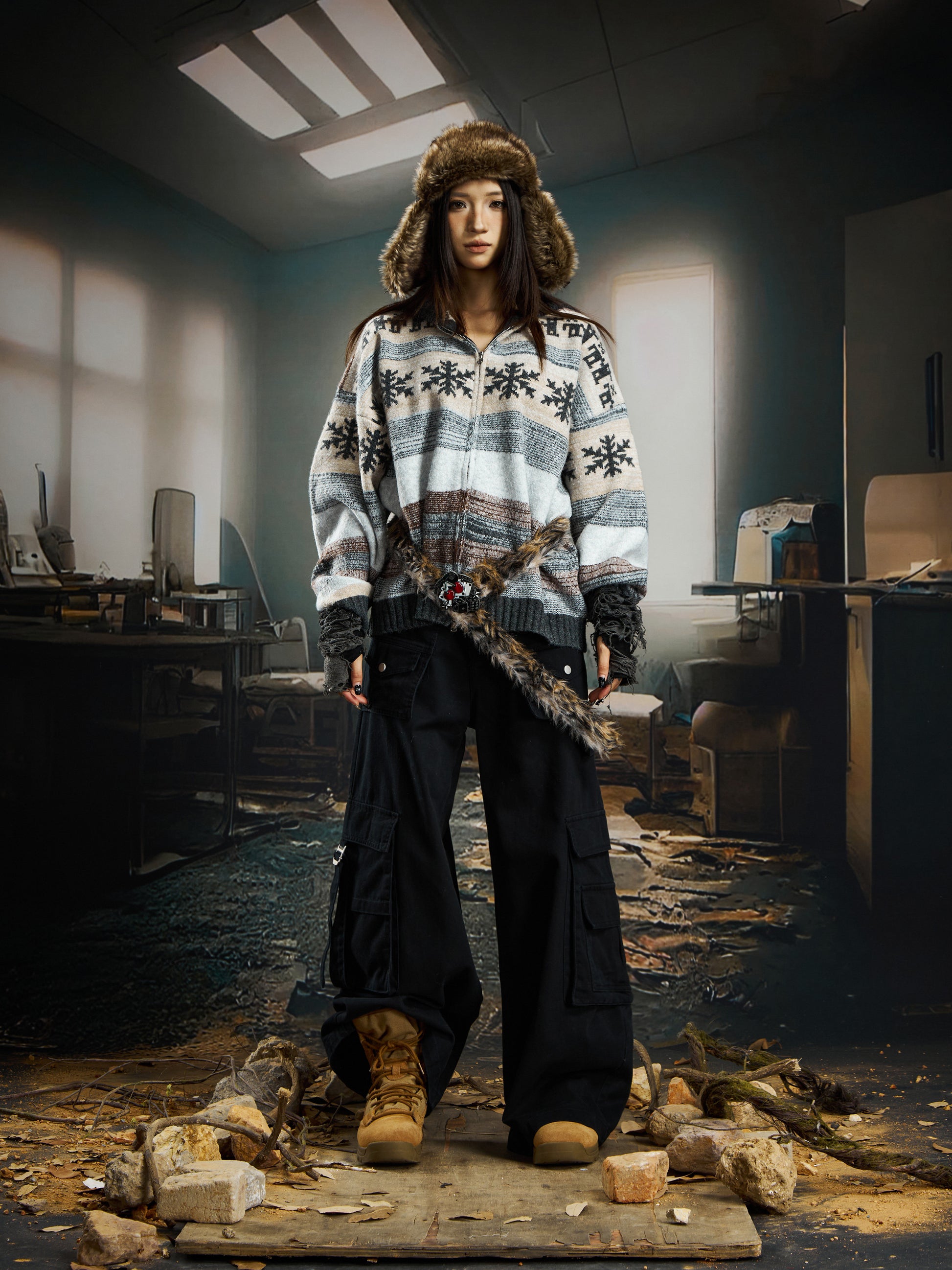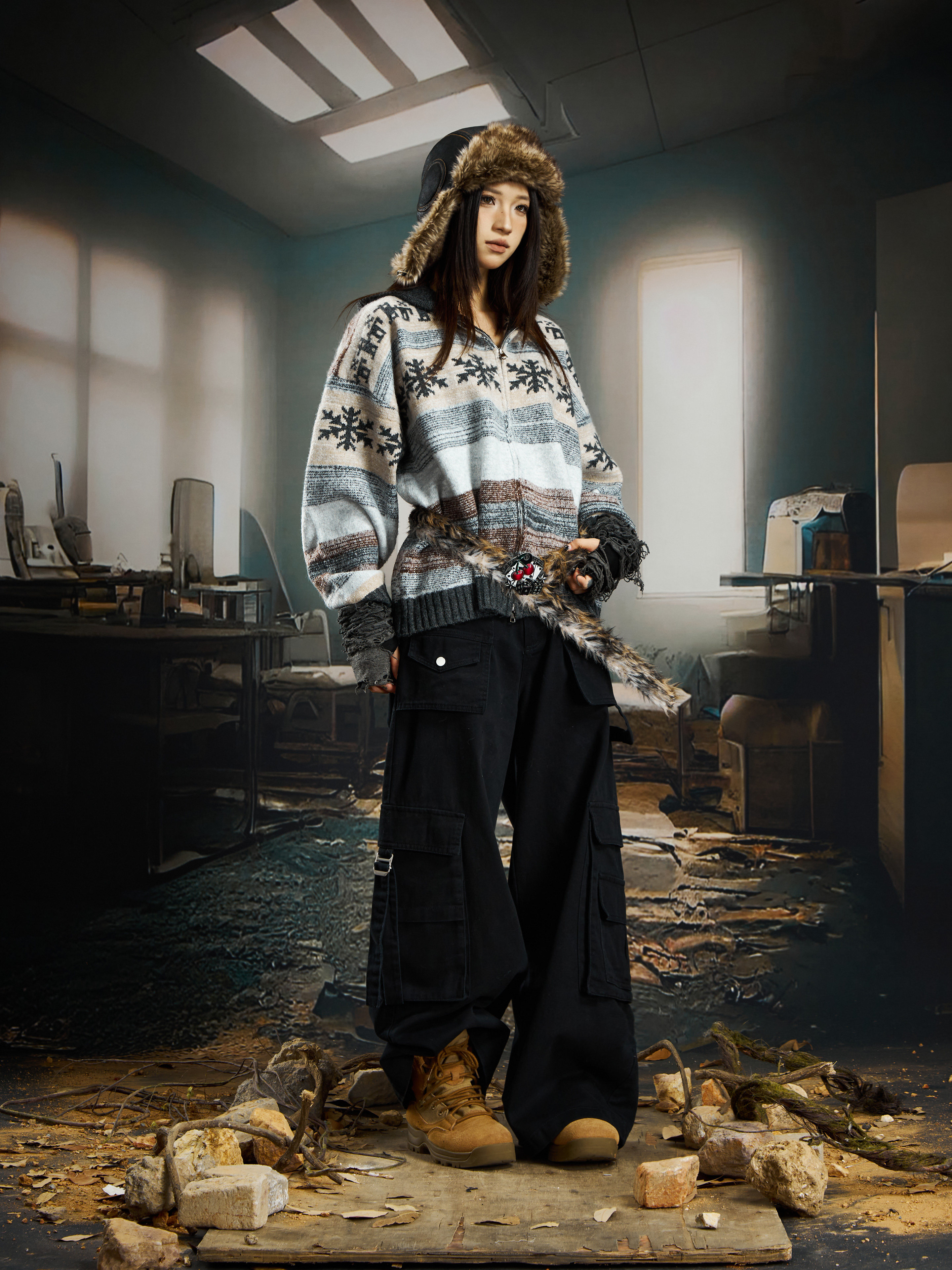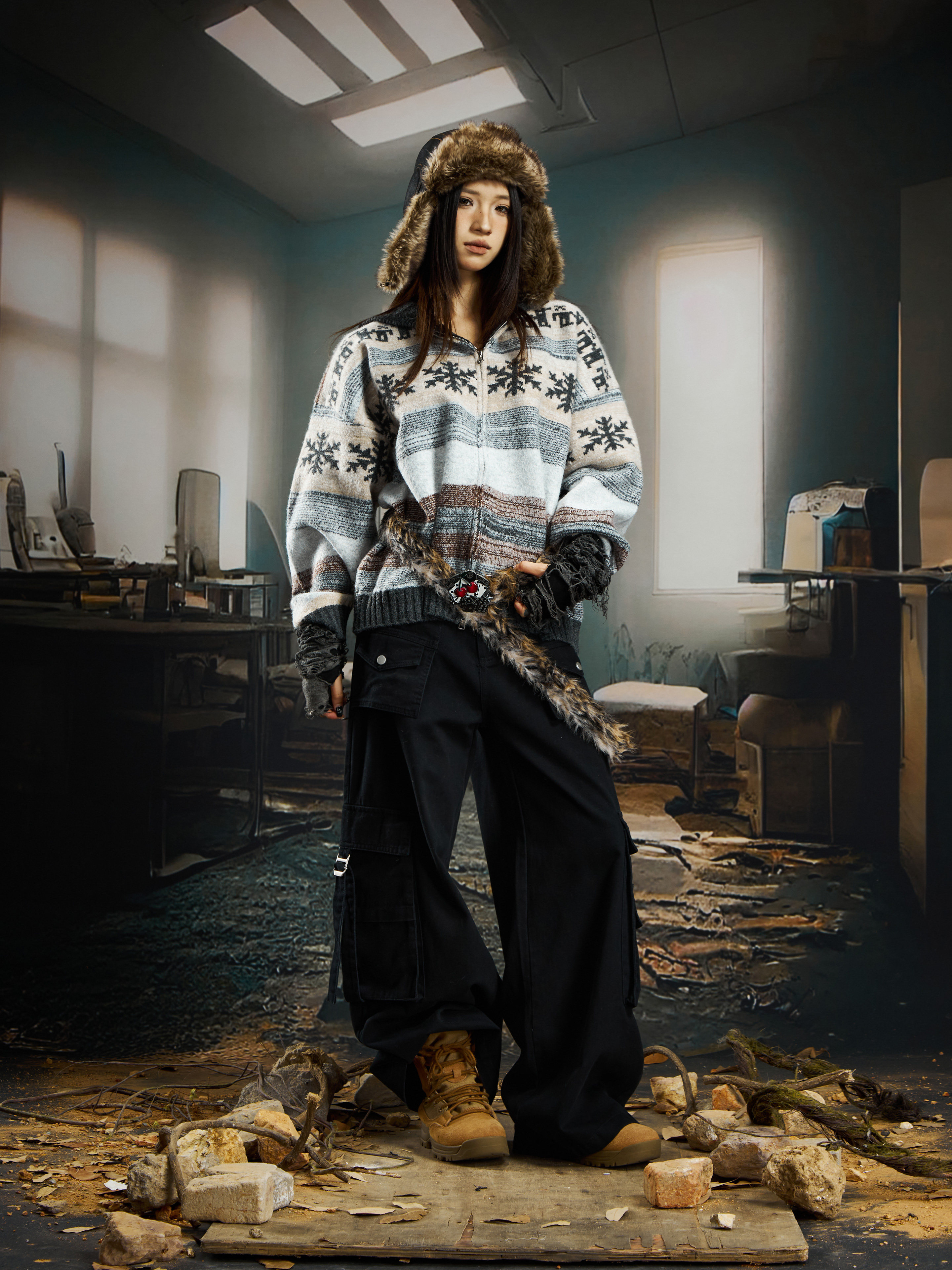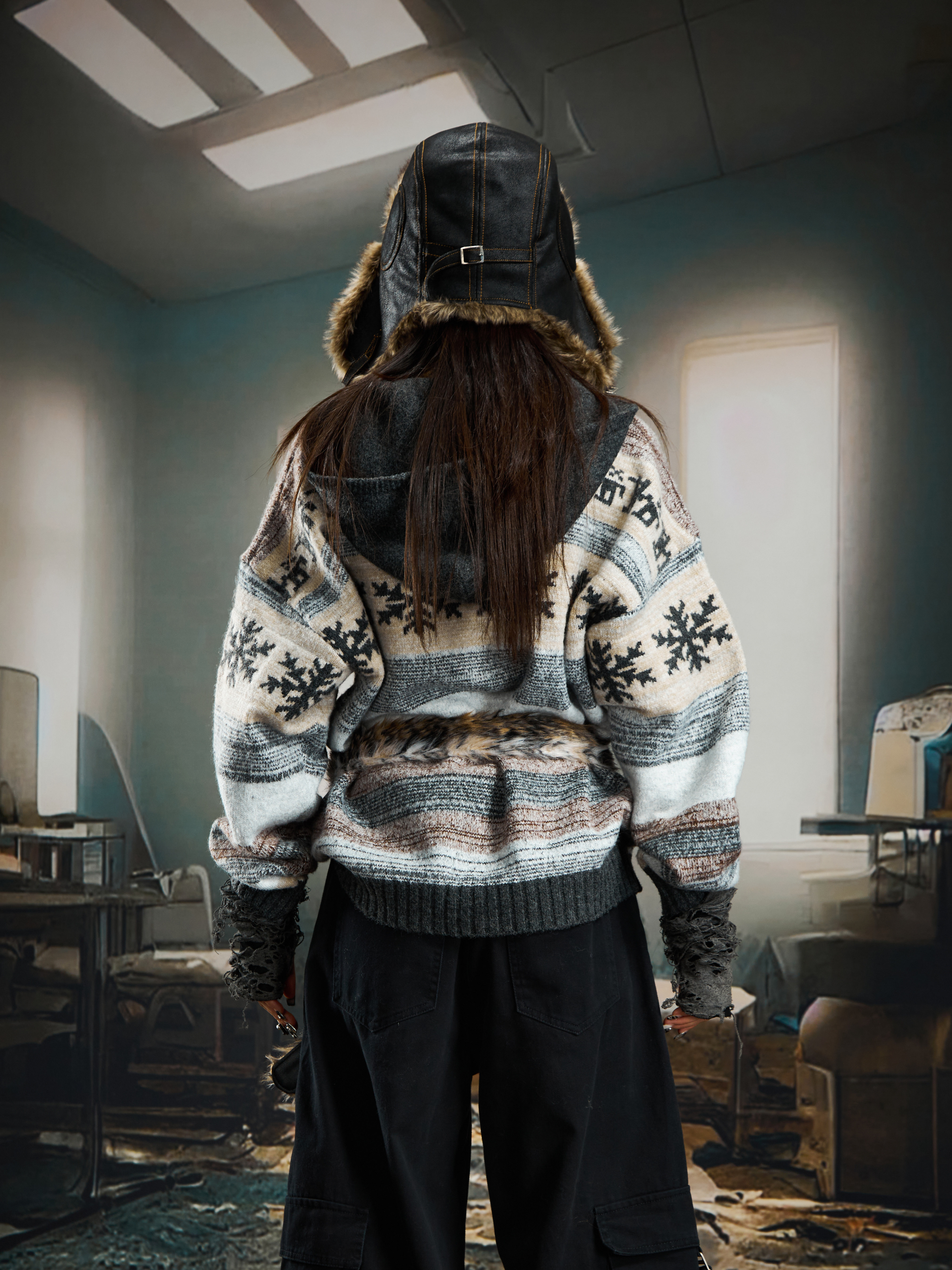 nowflake Contrast Hooded Zipper Knit Cardigan WN22750