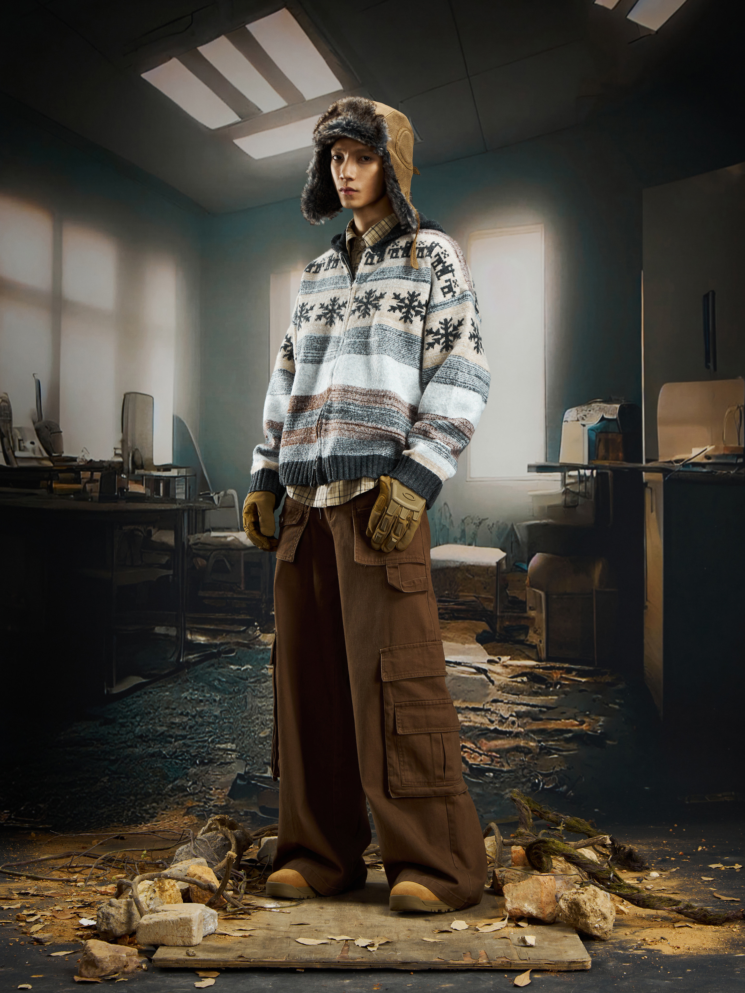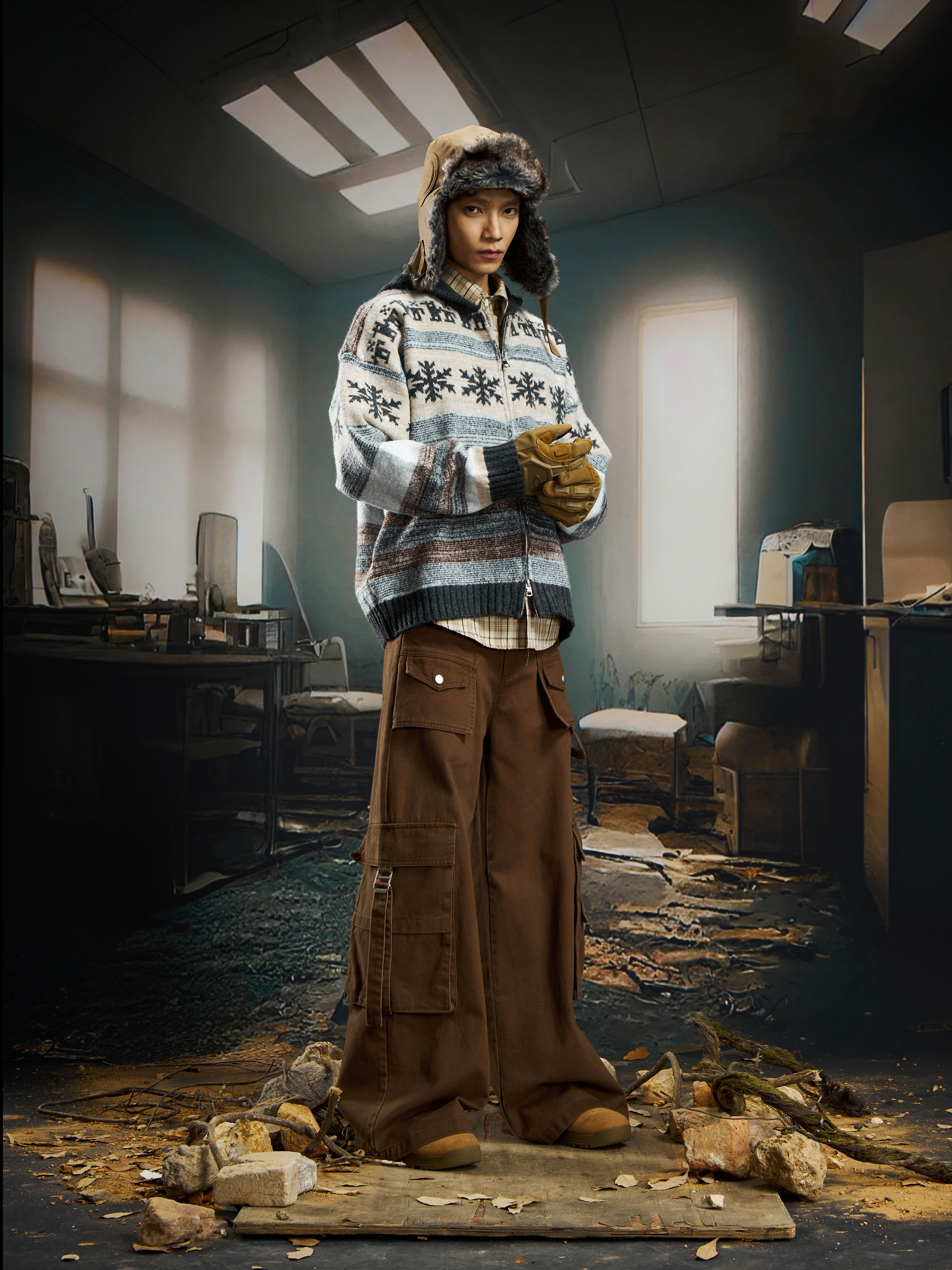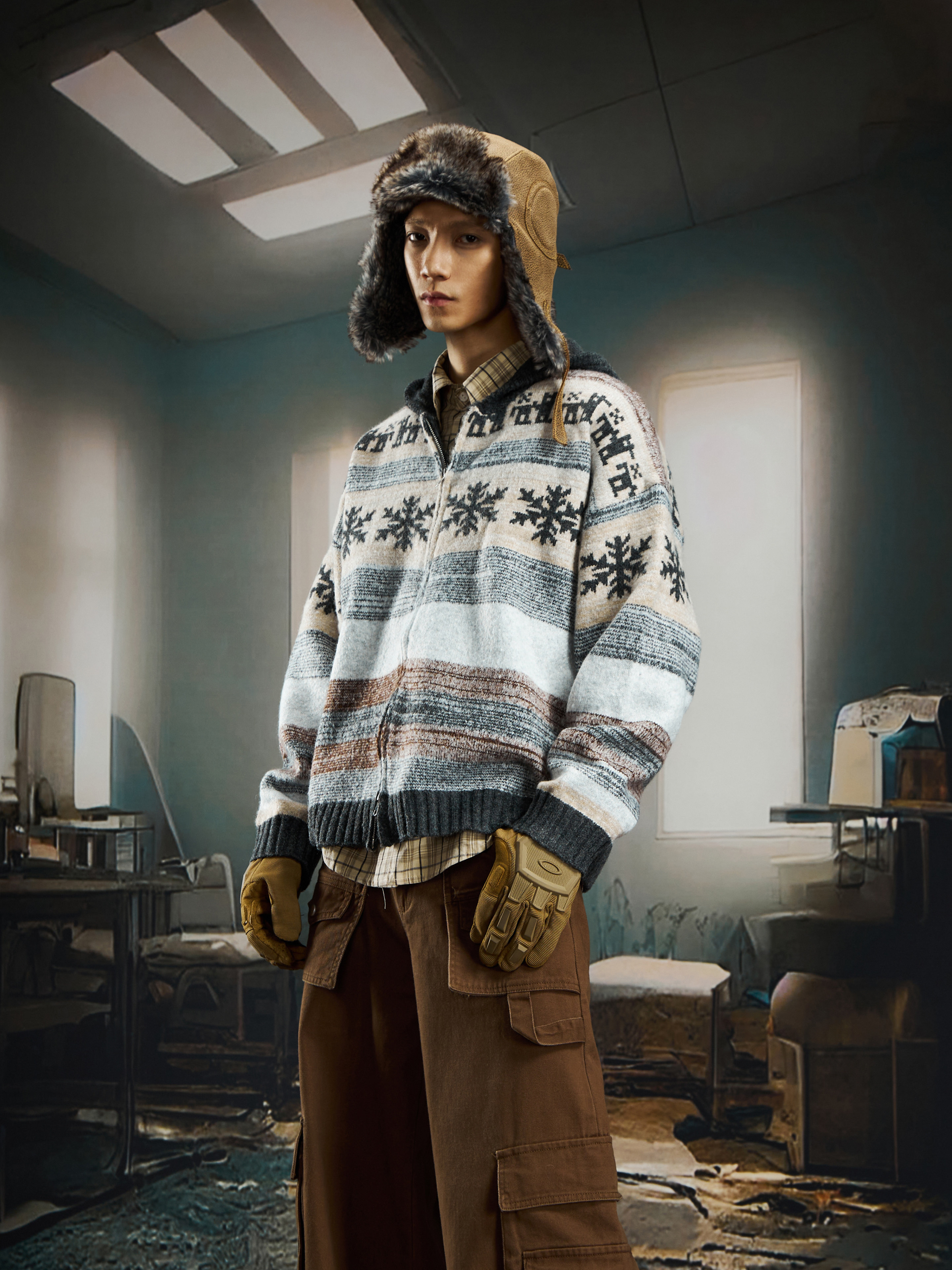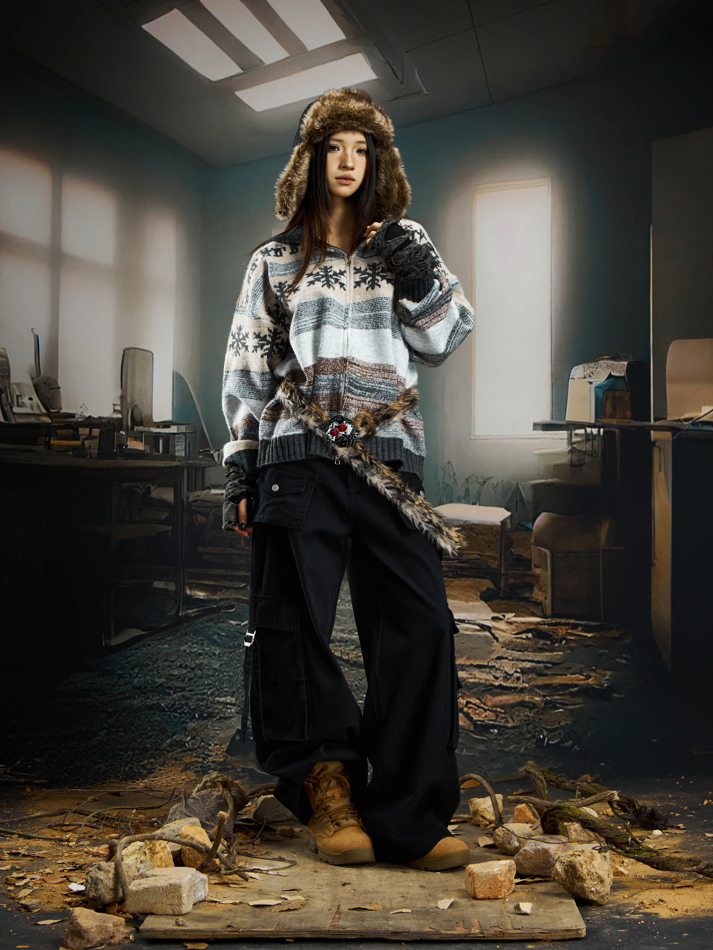 nowflake Contrast Hooded Zipper Knit Cardigan WN22750