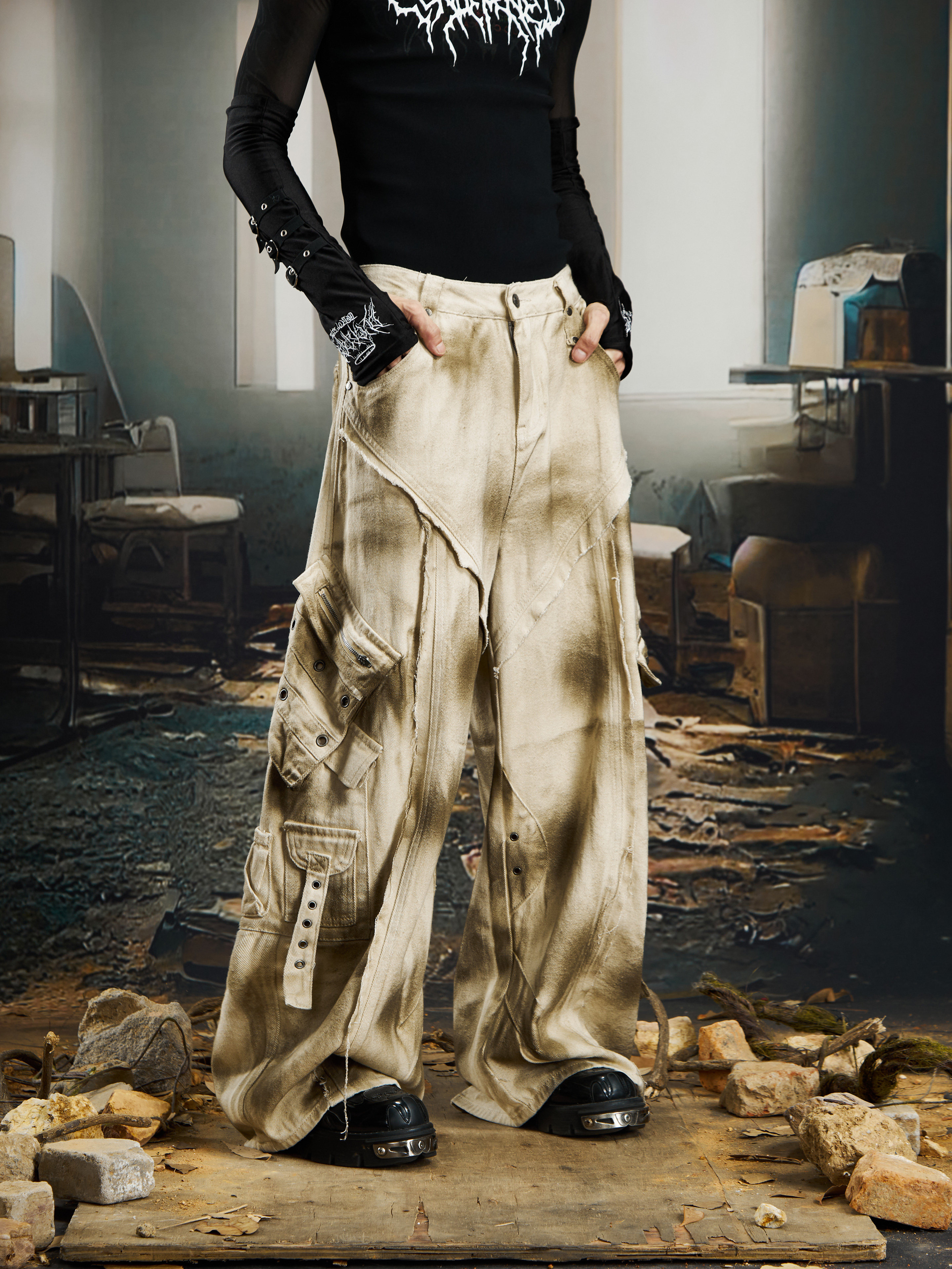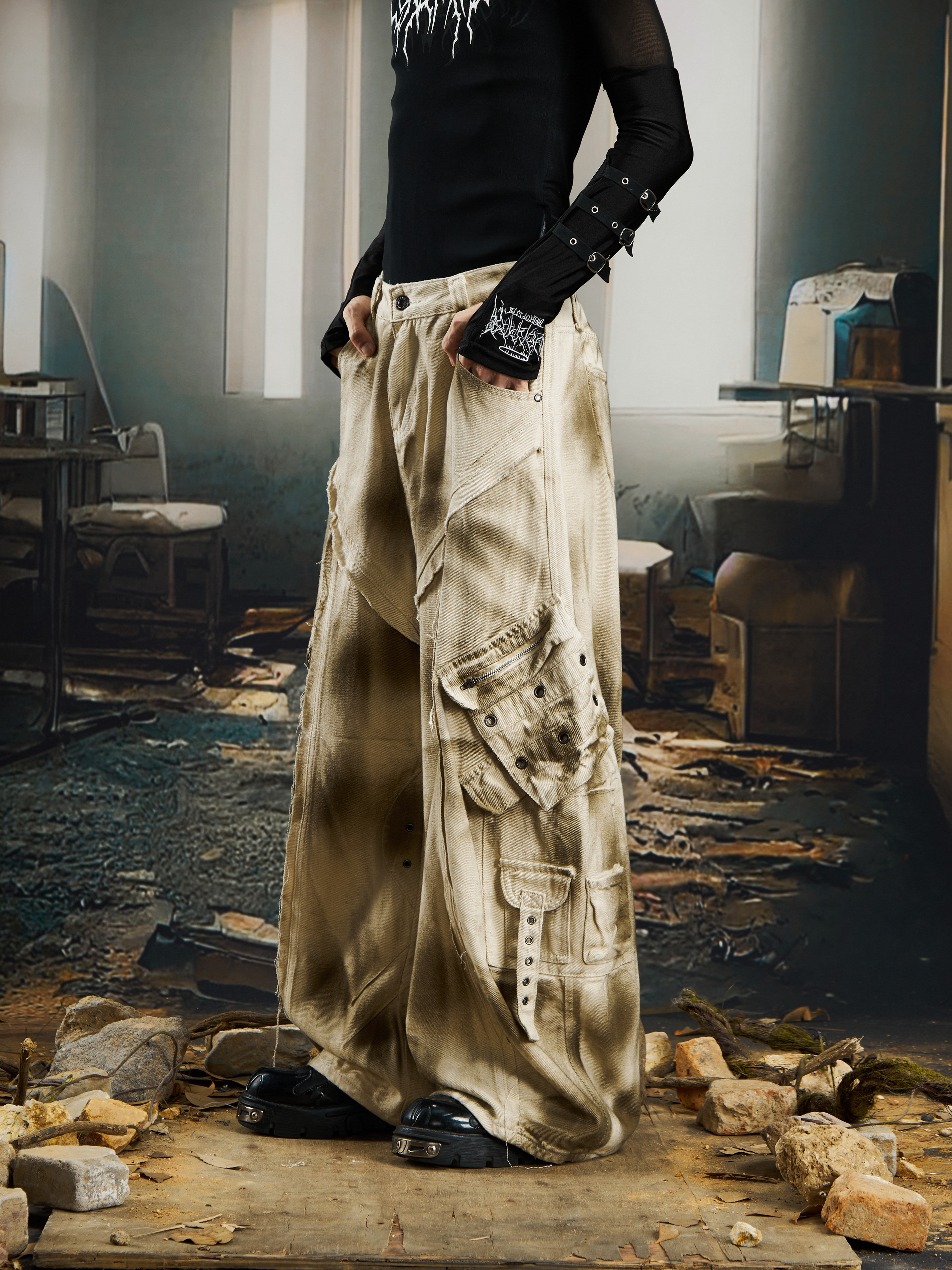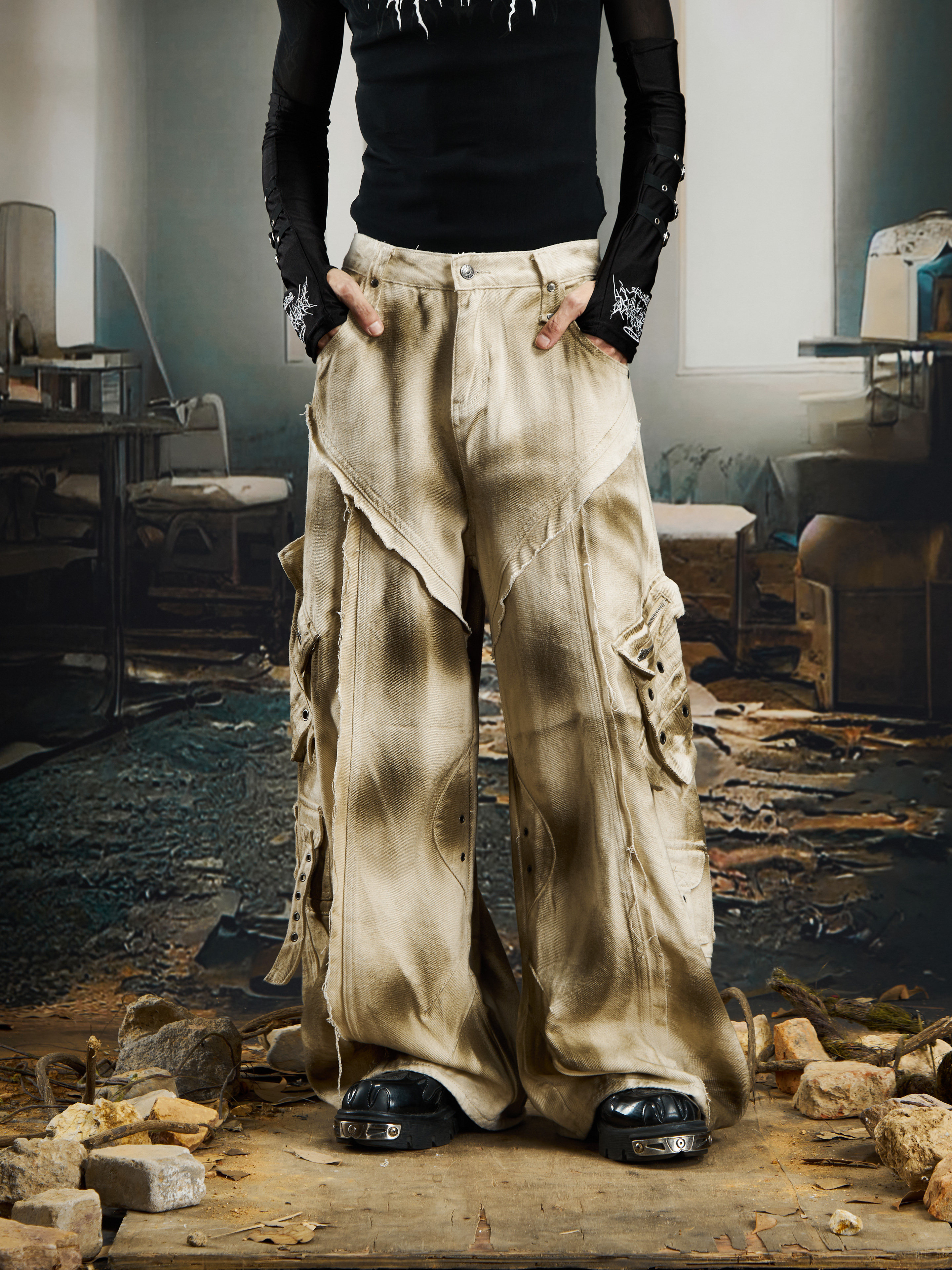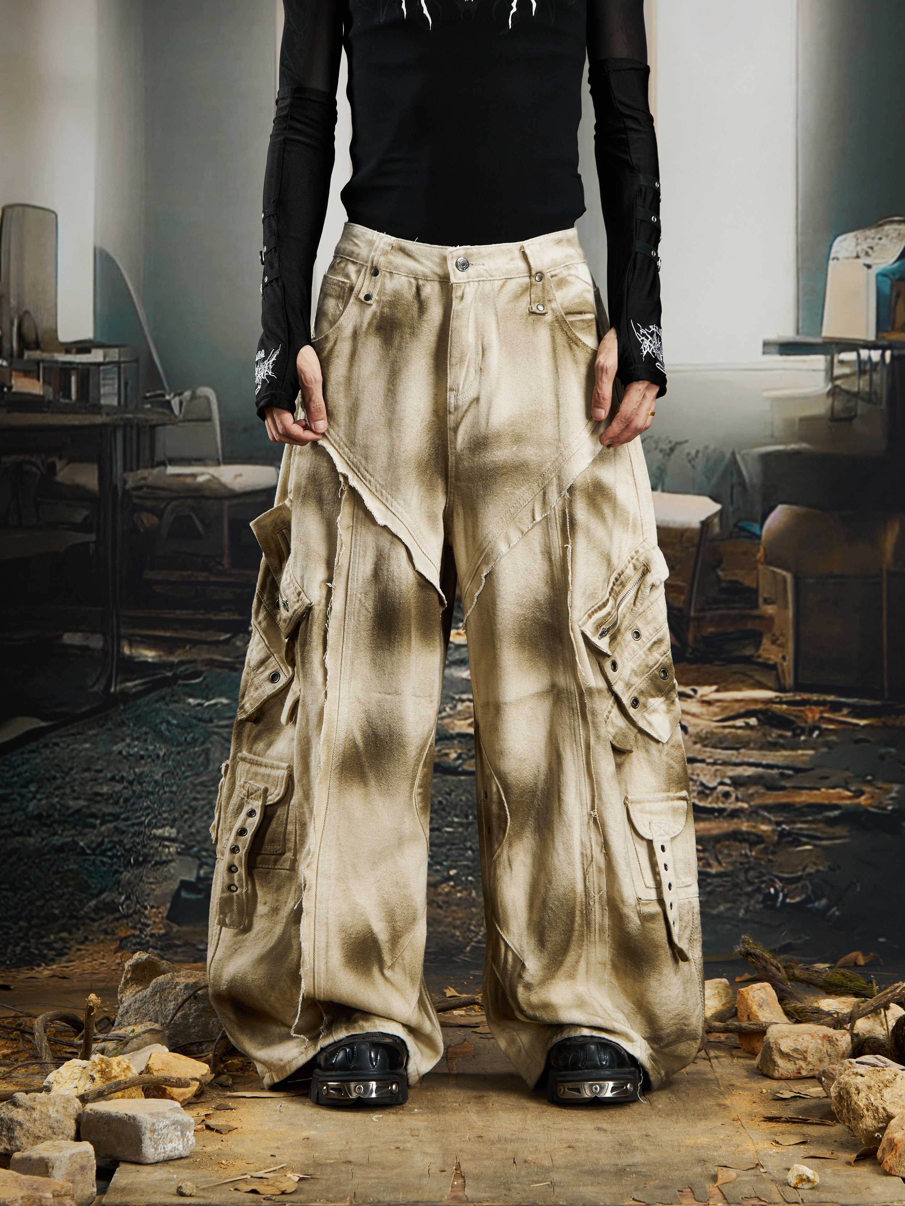 Washed Ink Spray Multi Pocket Cargo Pants WN22769