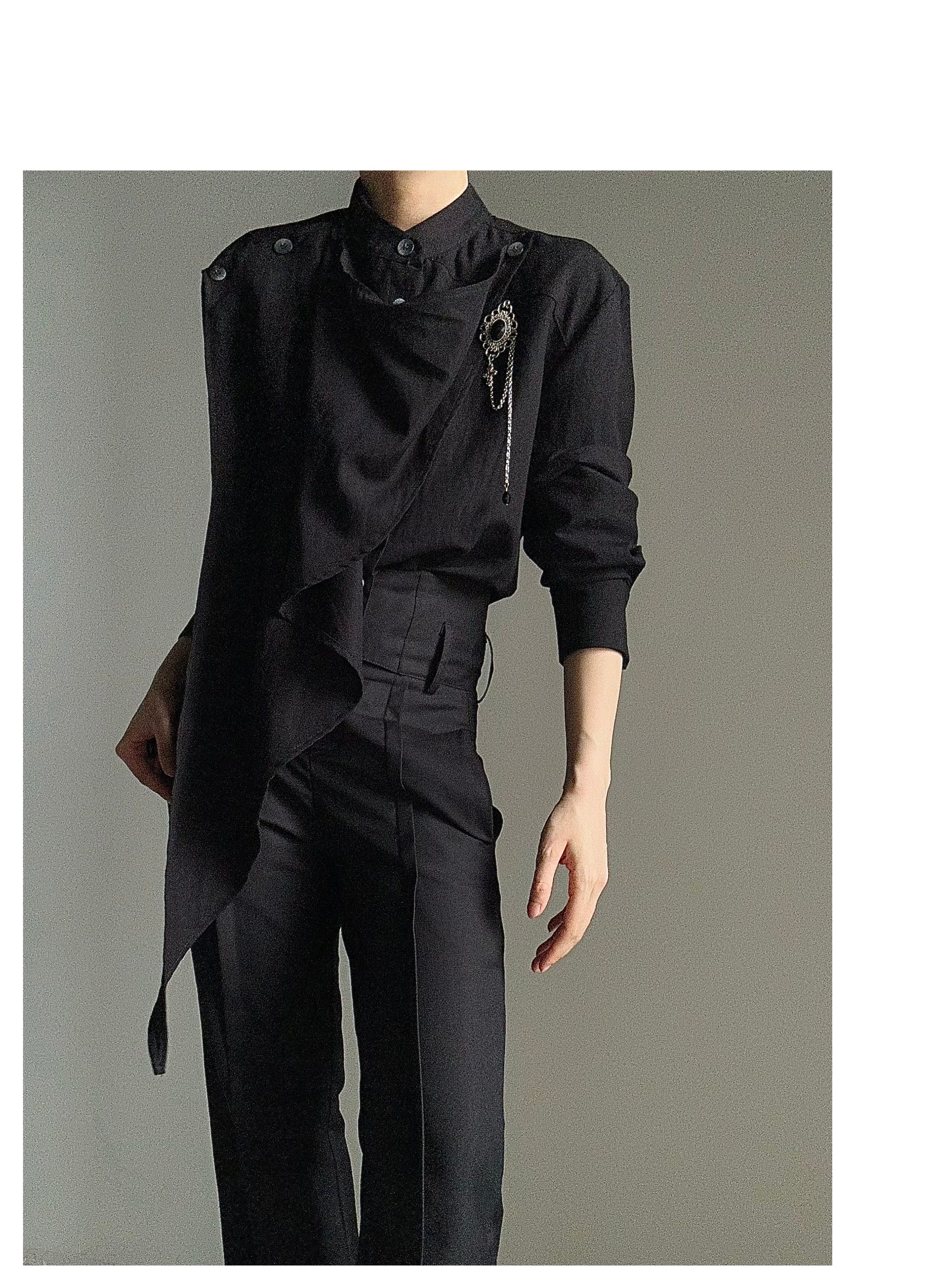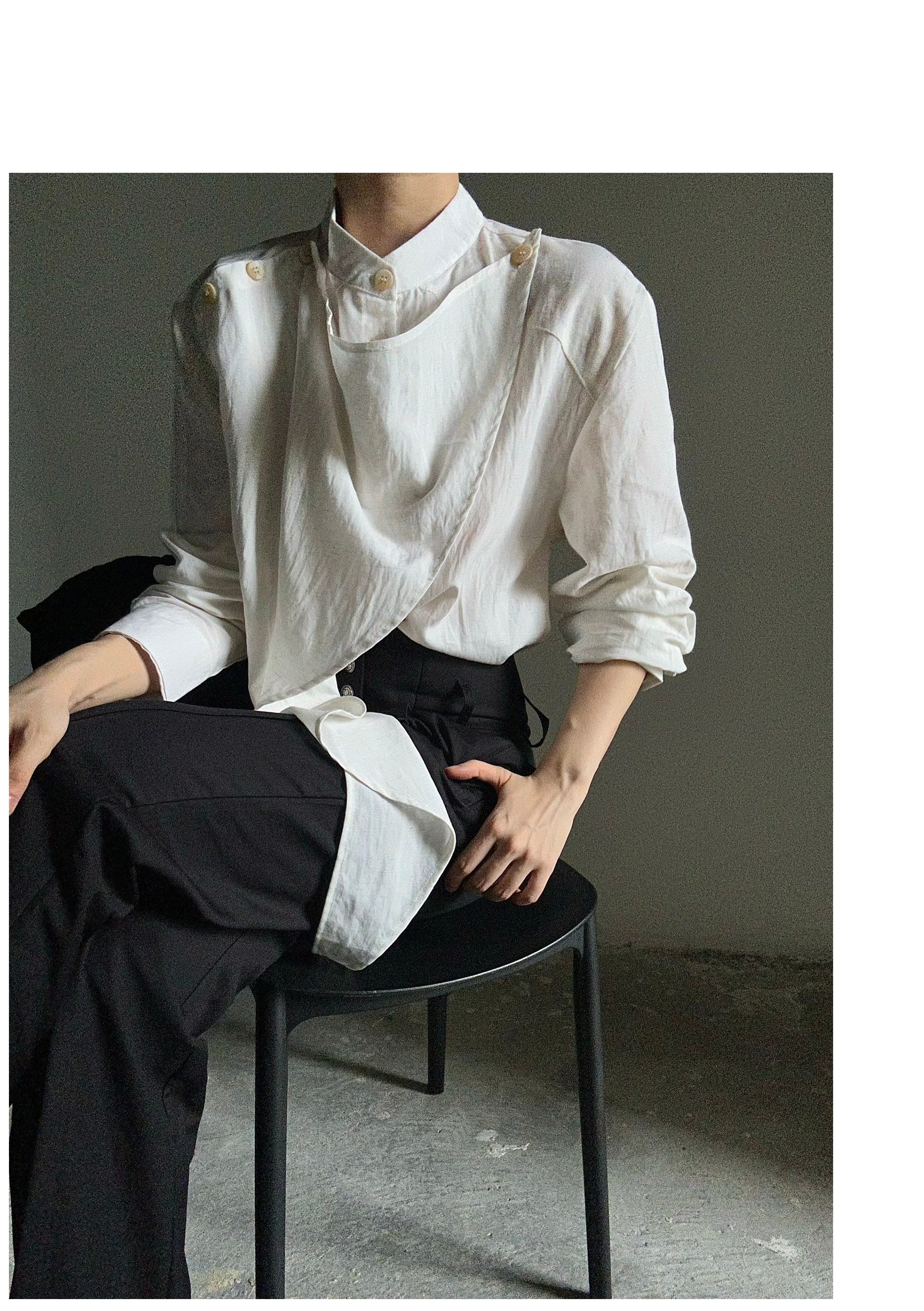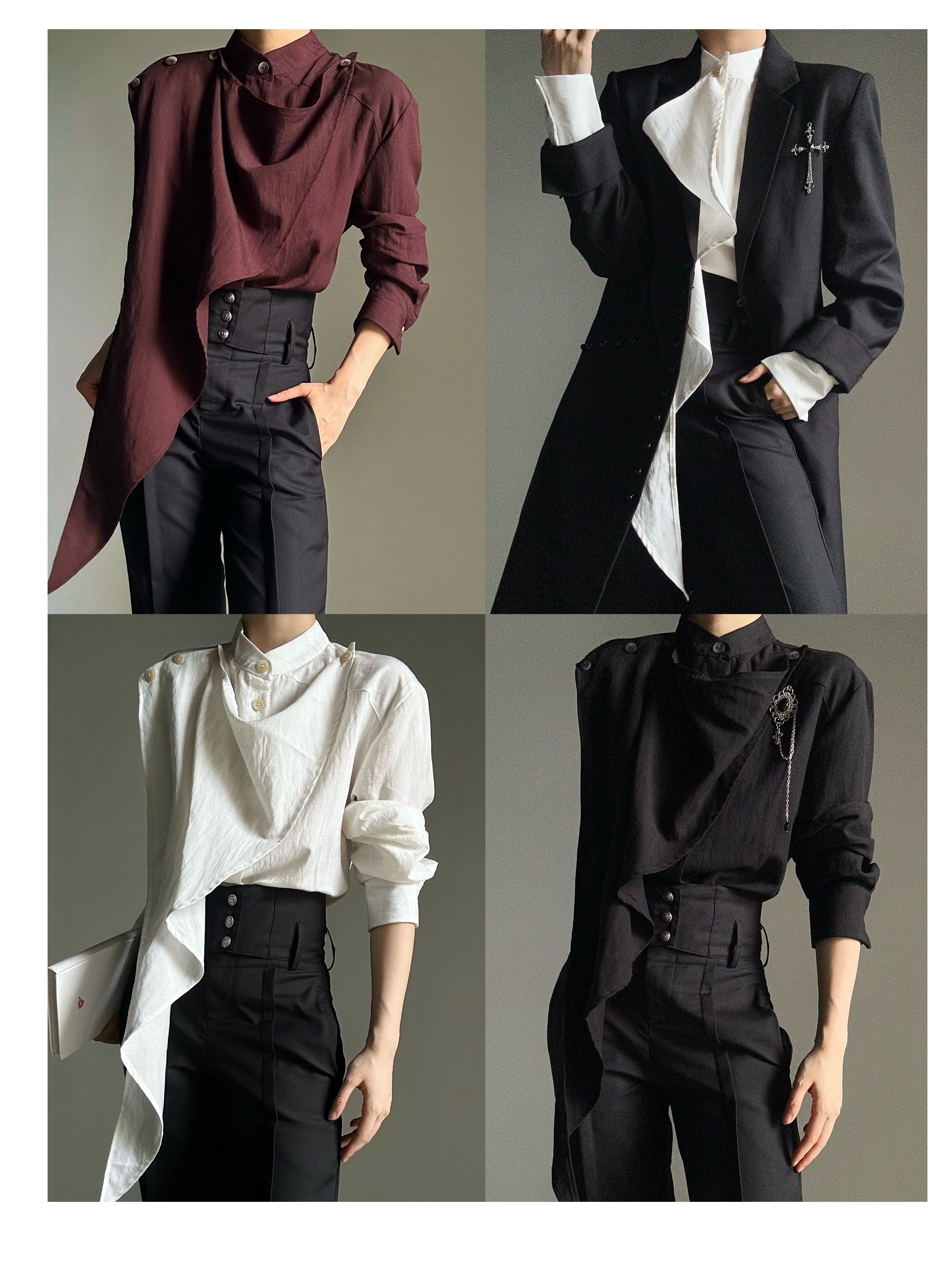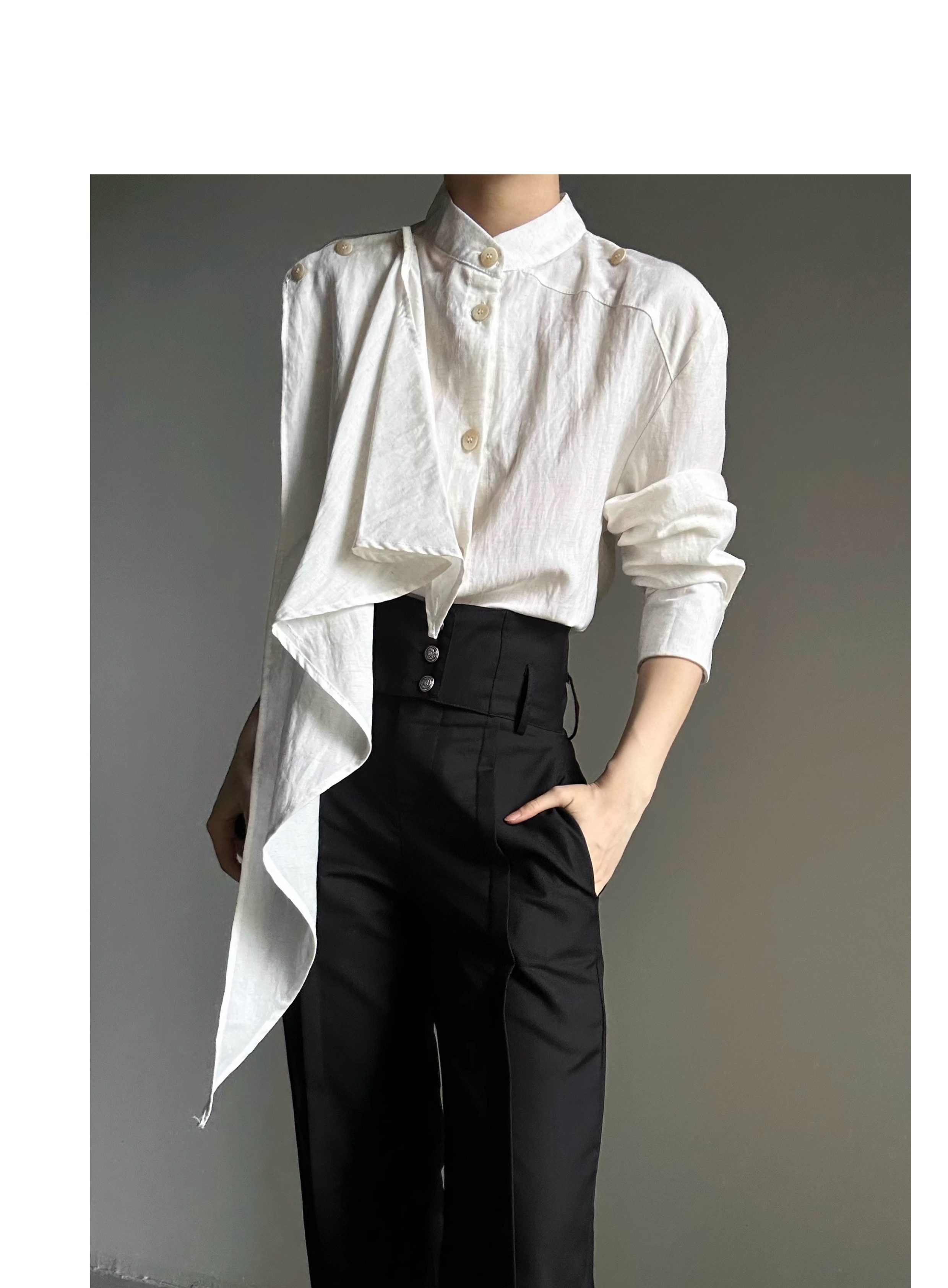Standing-Collar Asymmetric Drape Long Sleeve Shirt WN23132