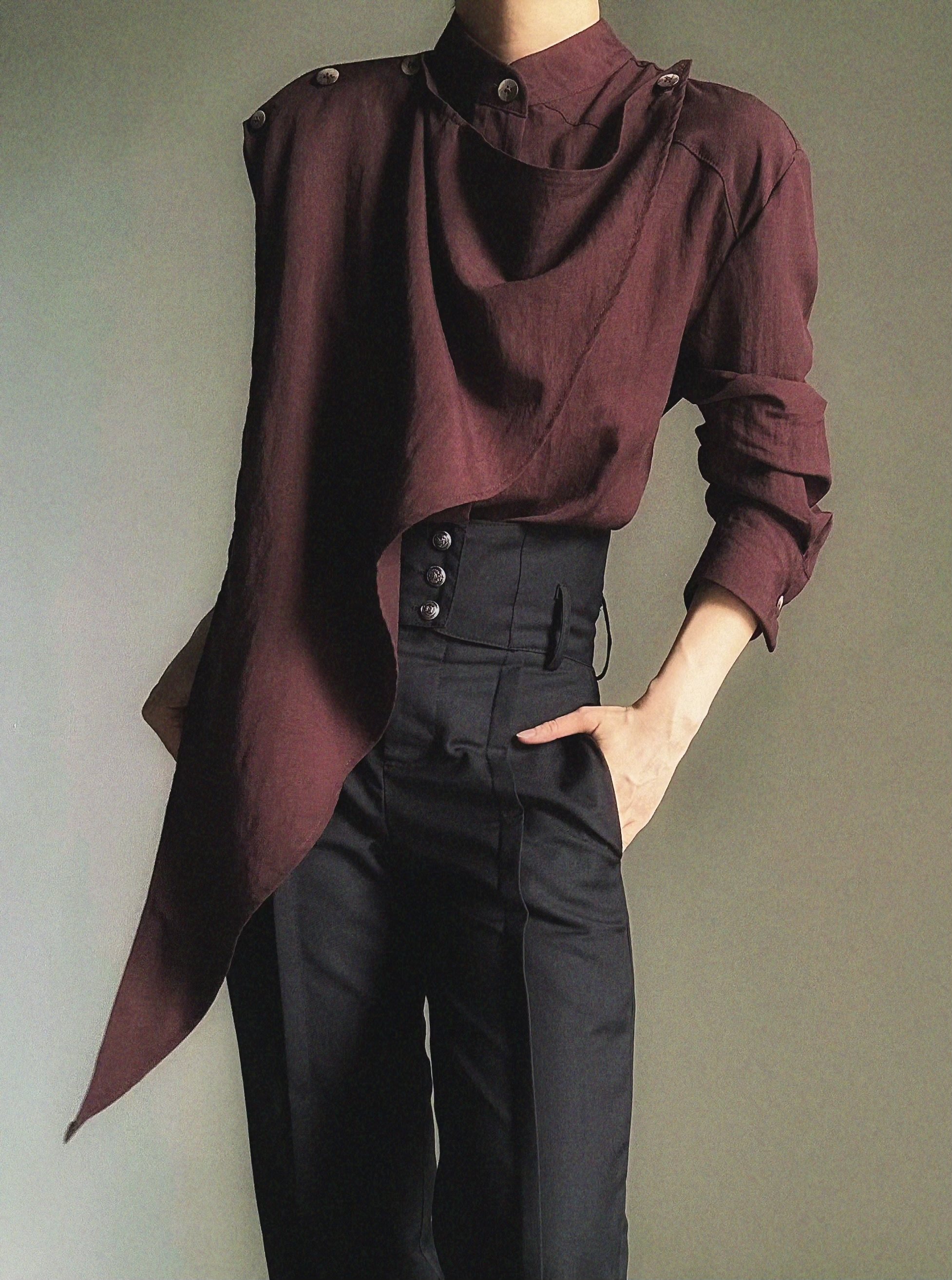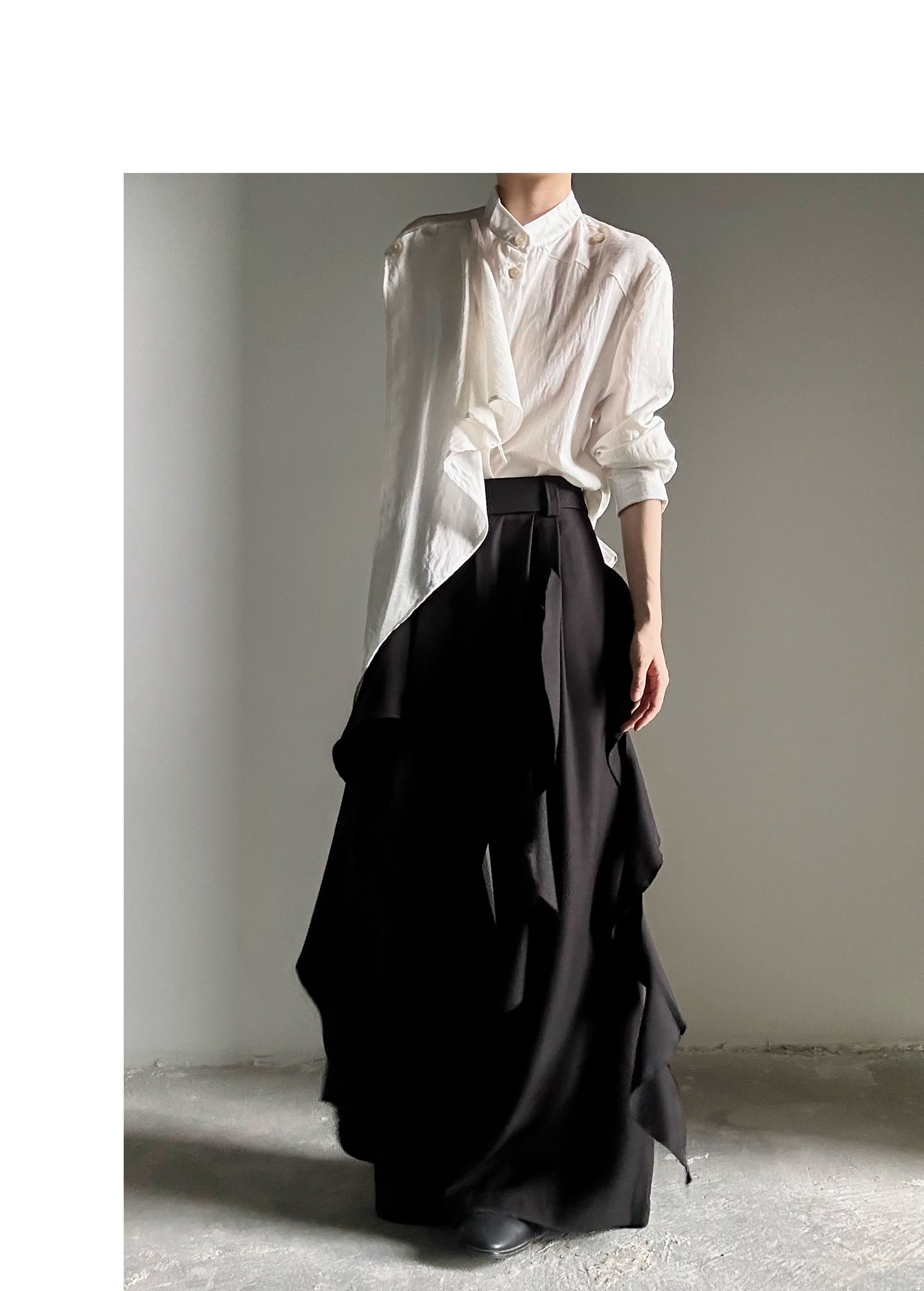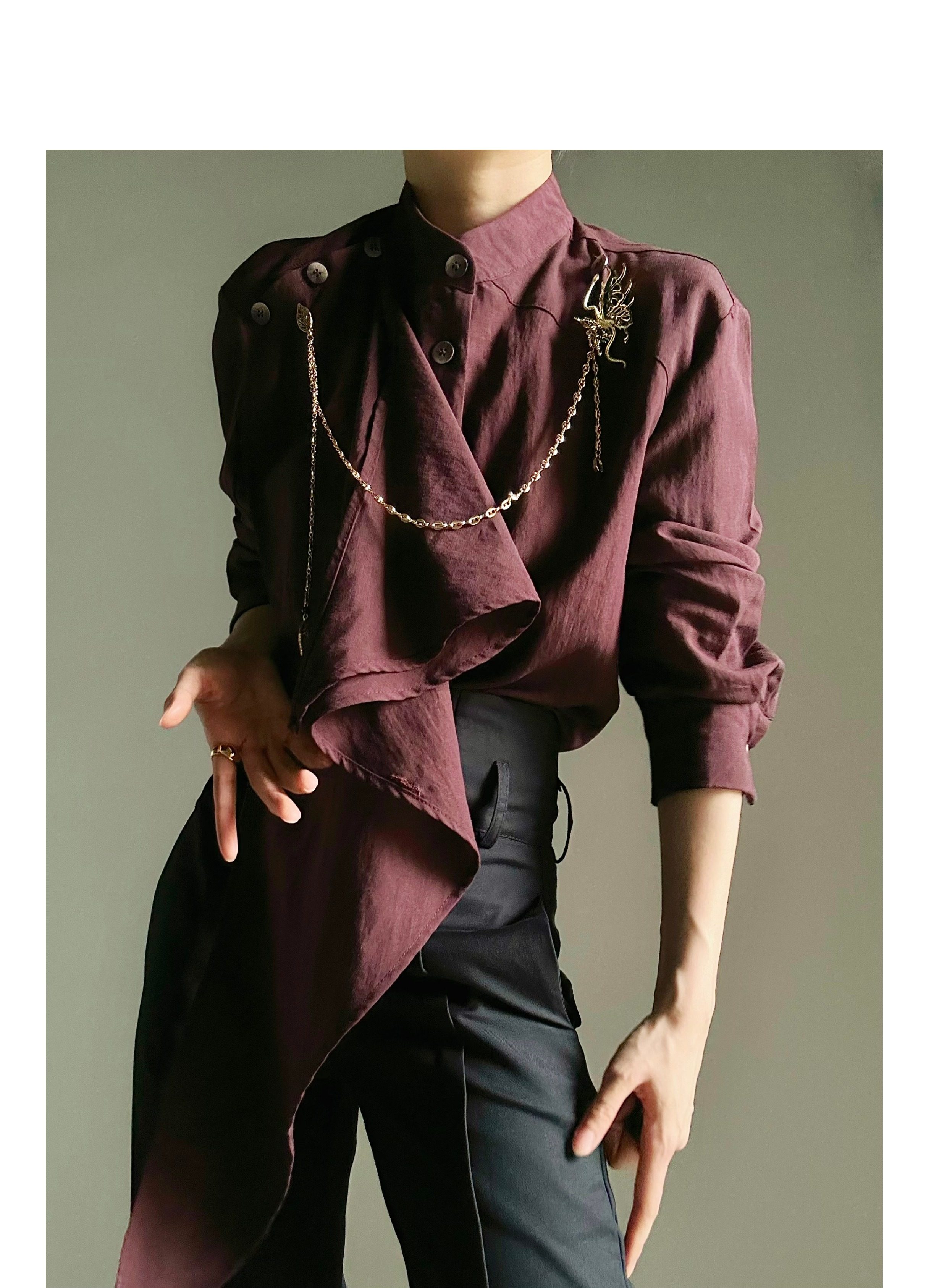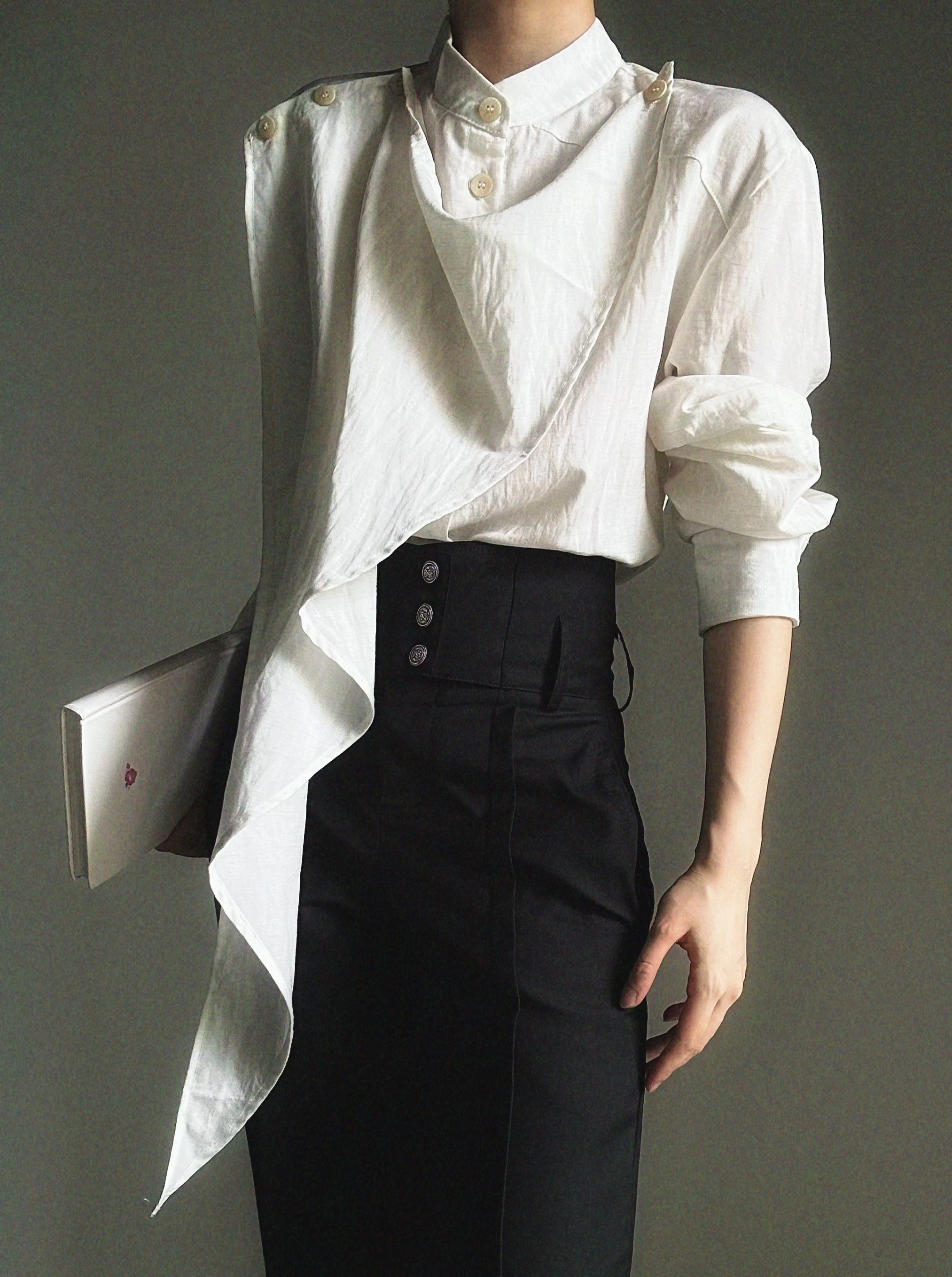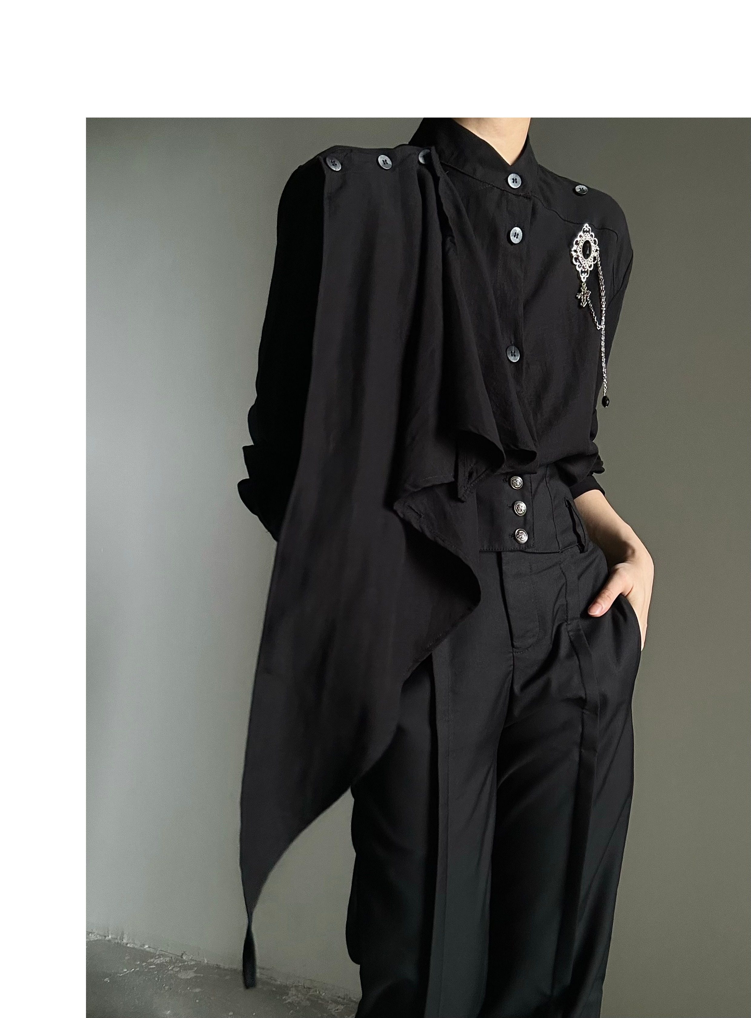 Standing-Collar Asymmetric Drape Long Sleeve Shirt WN23132