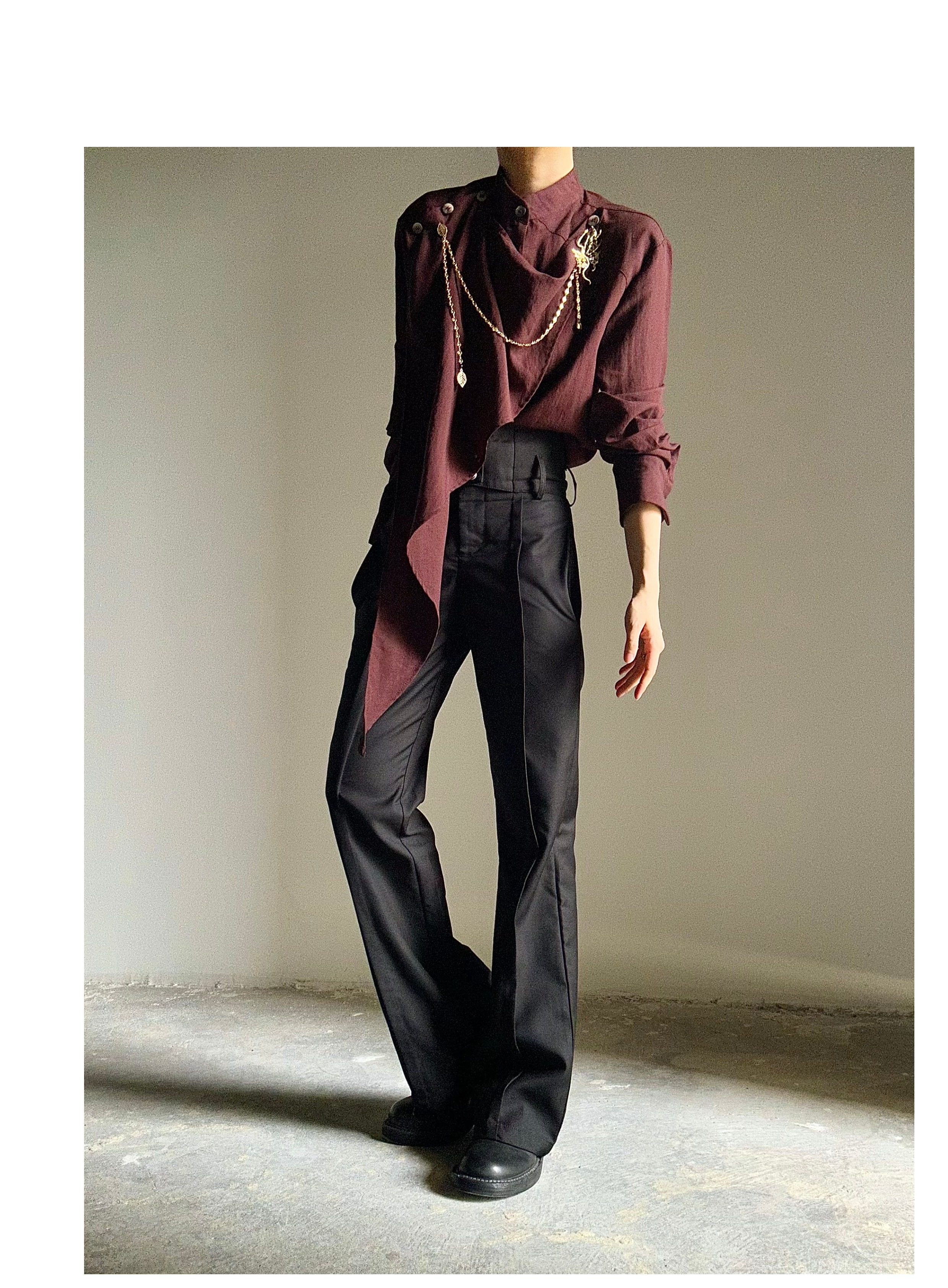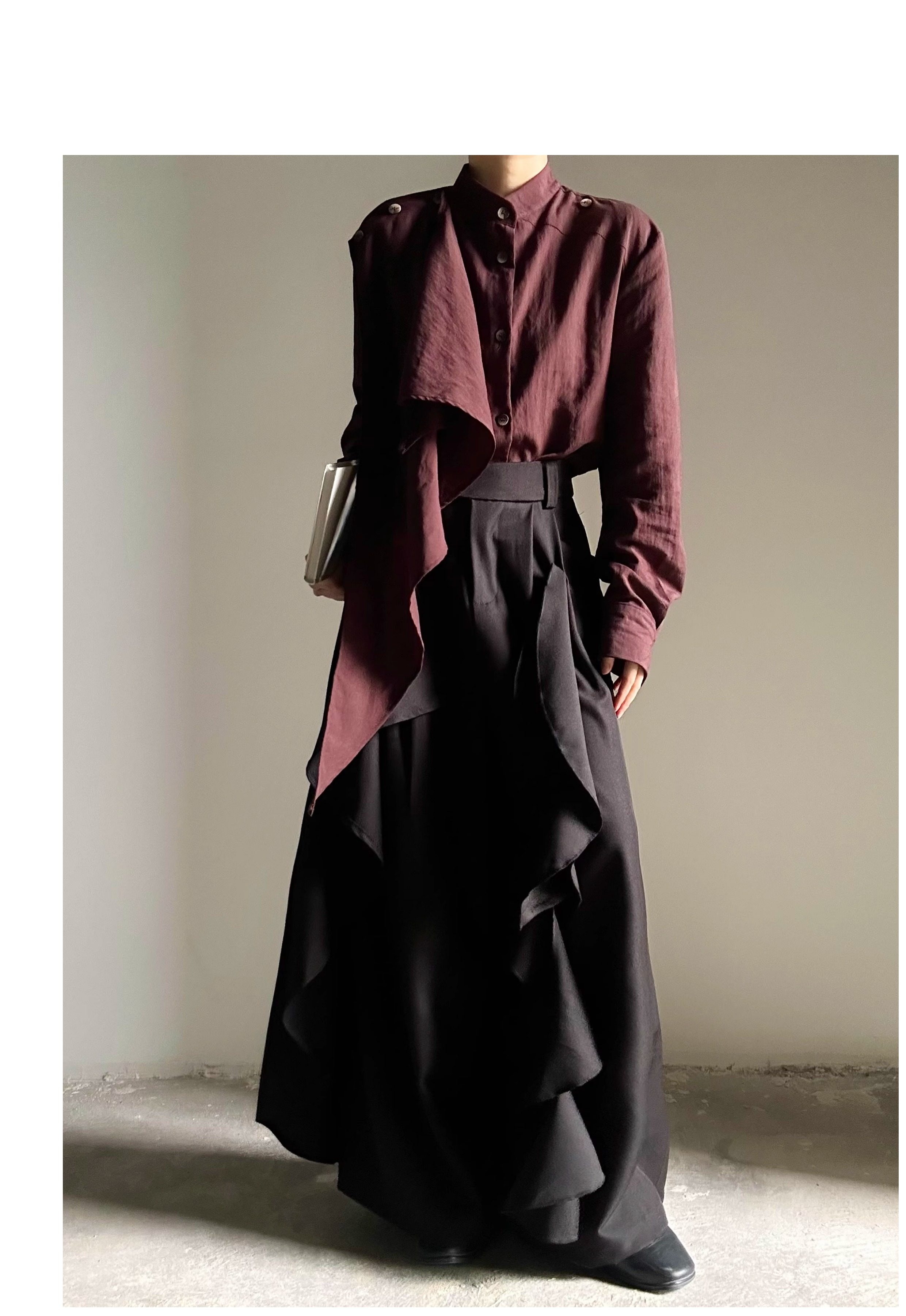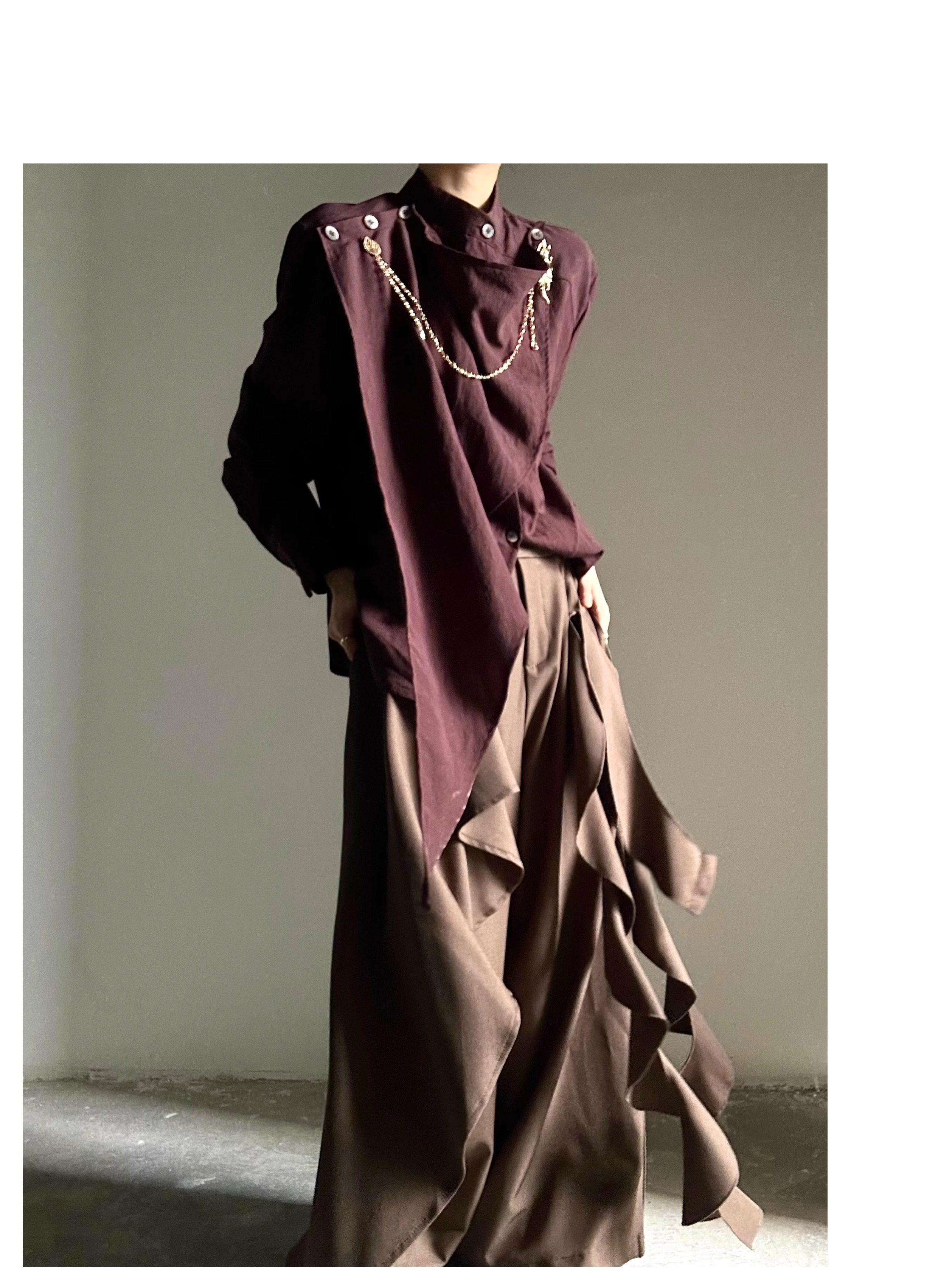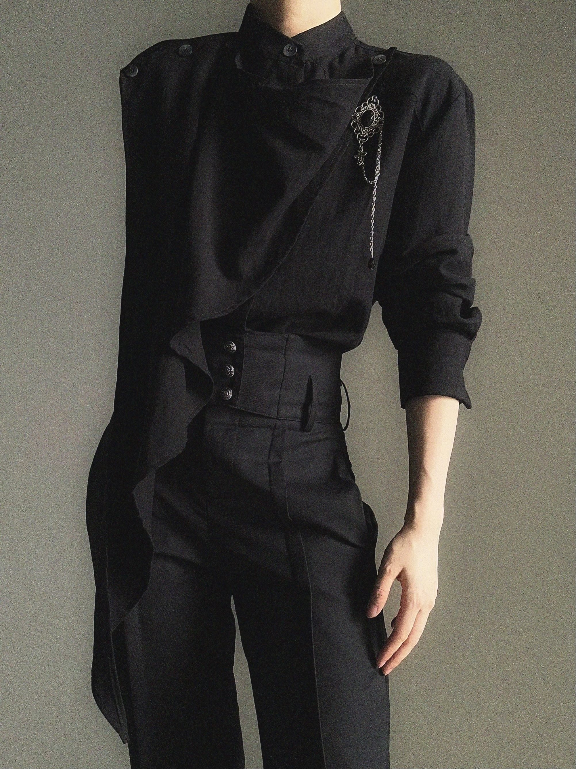 Standing-Collar Asymmetric Drape Long Sleeve Shirt WN23132