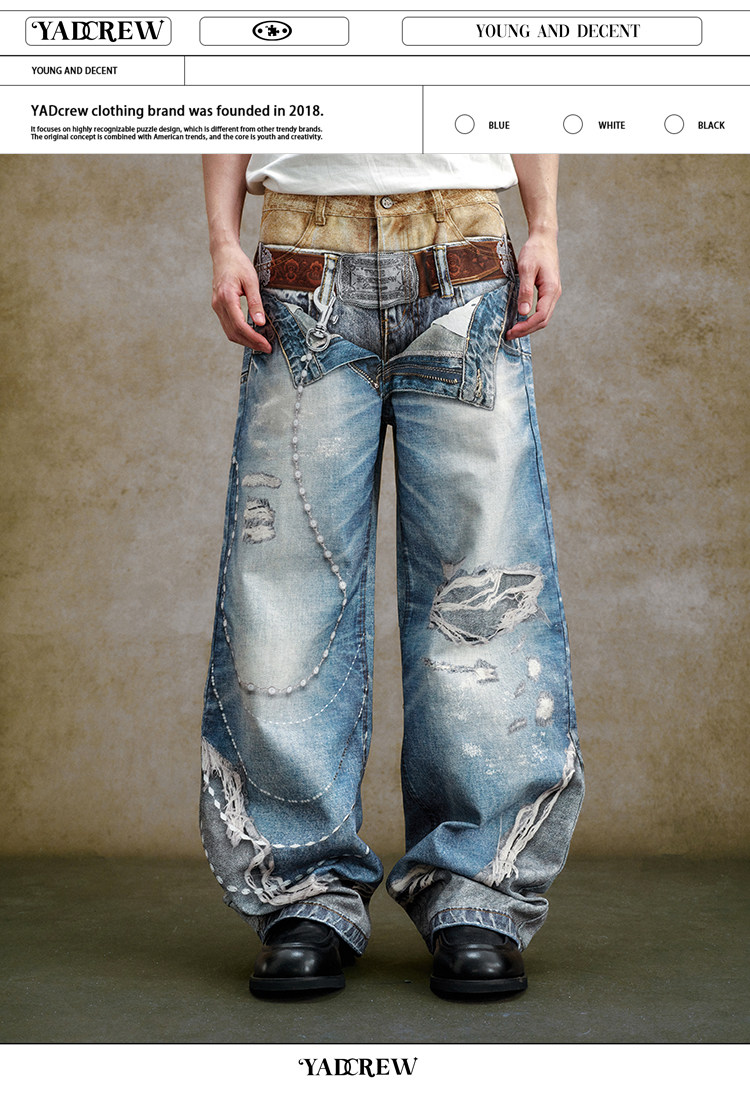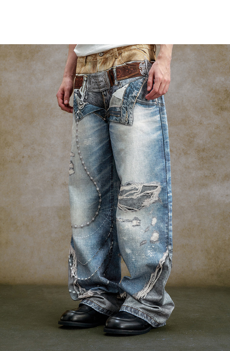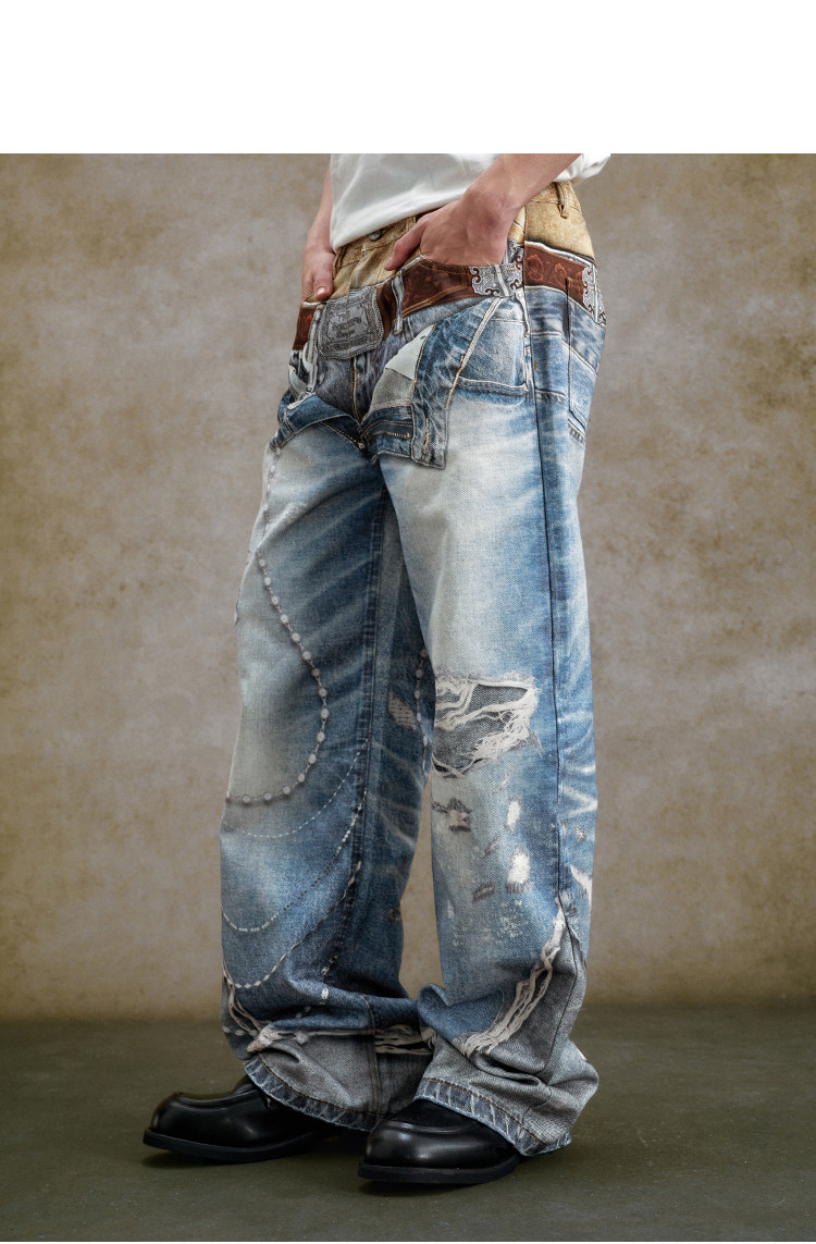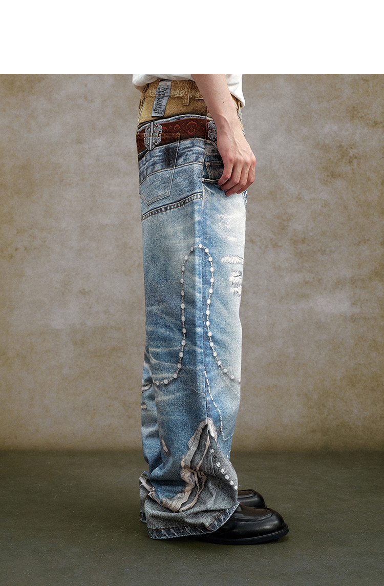 Mix Patchwork Damage Studs Wide Leg Denim Jeans WN23220