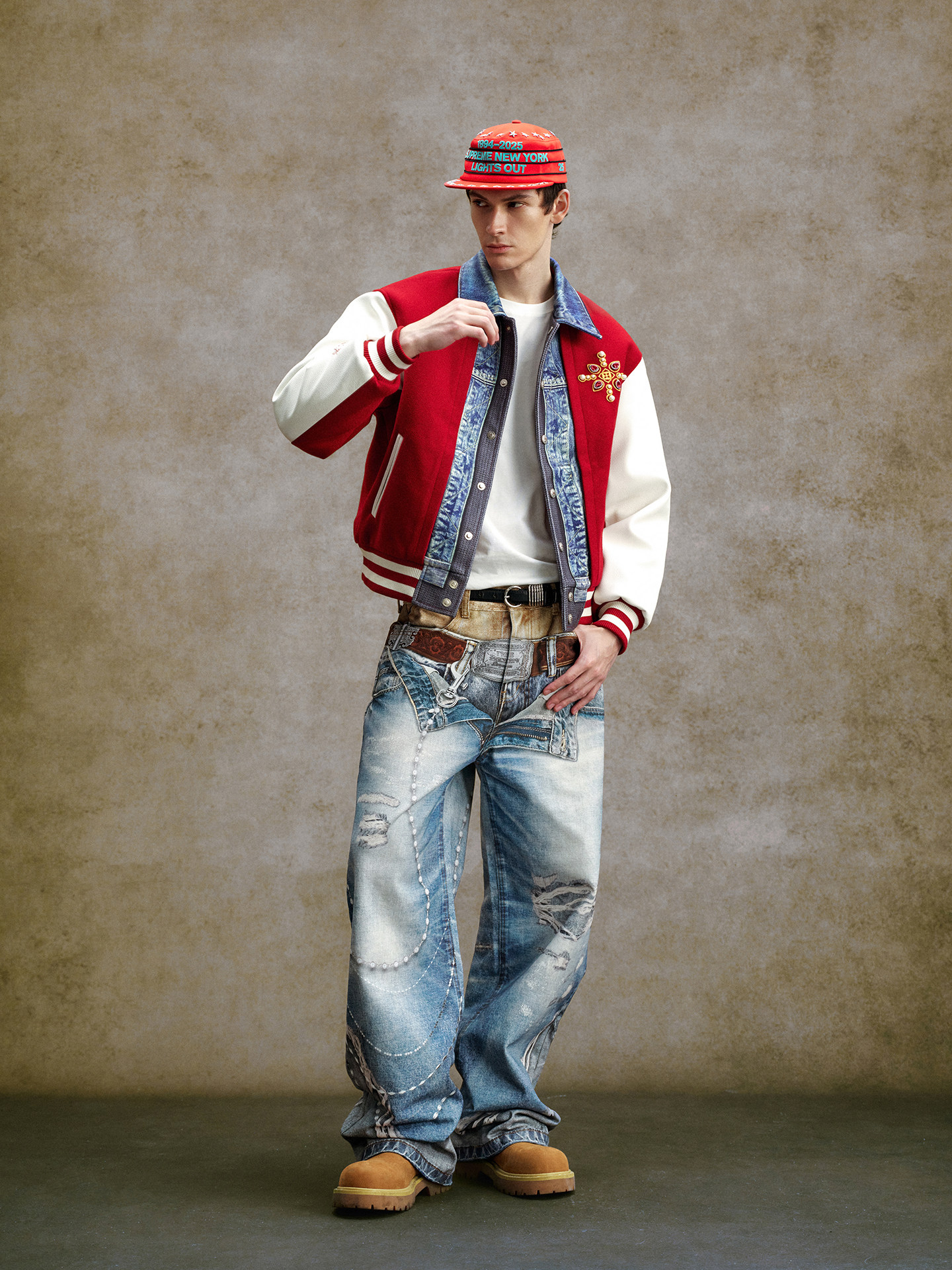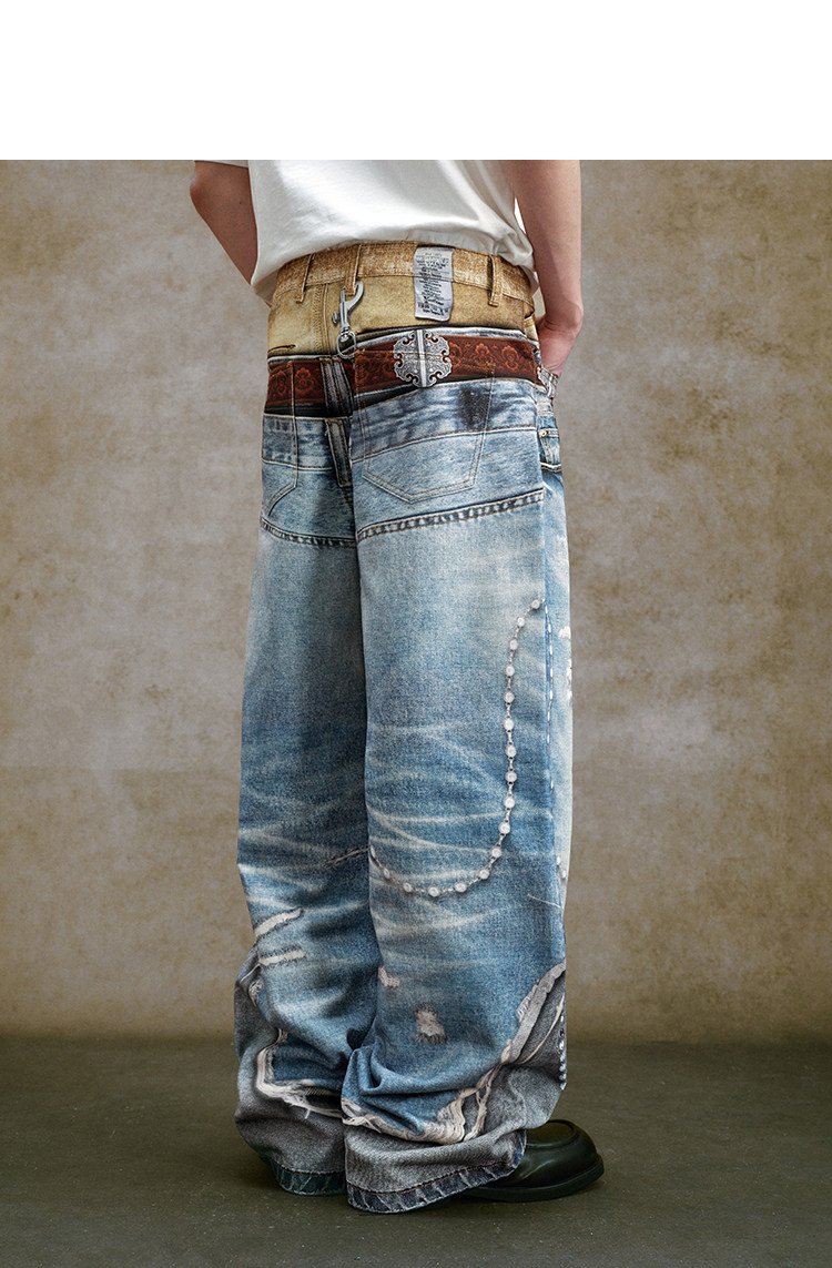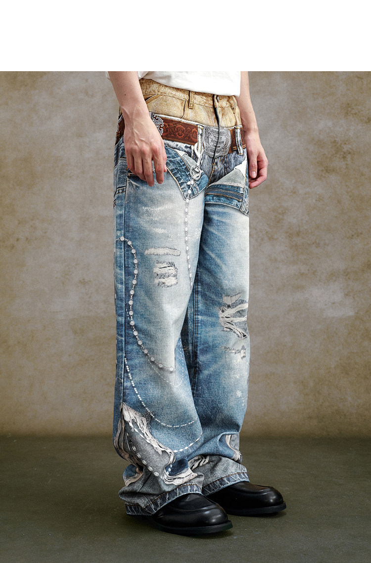 Mix Patchwork Damage Studs Wide Leg Denim Jeans WN23220