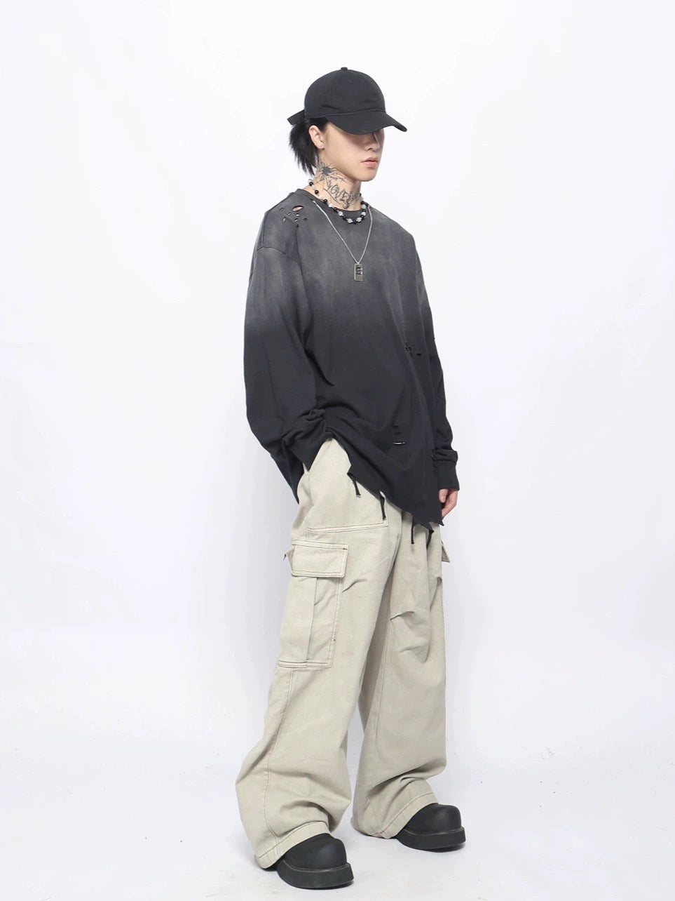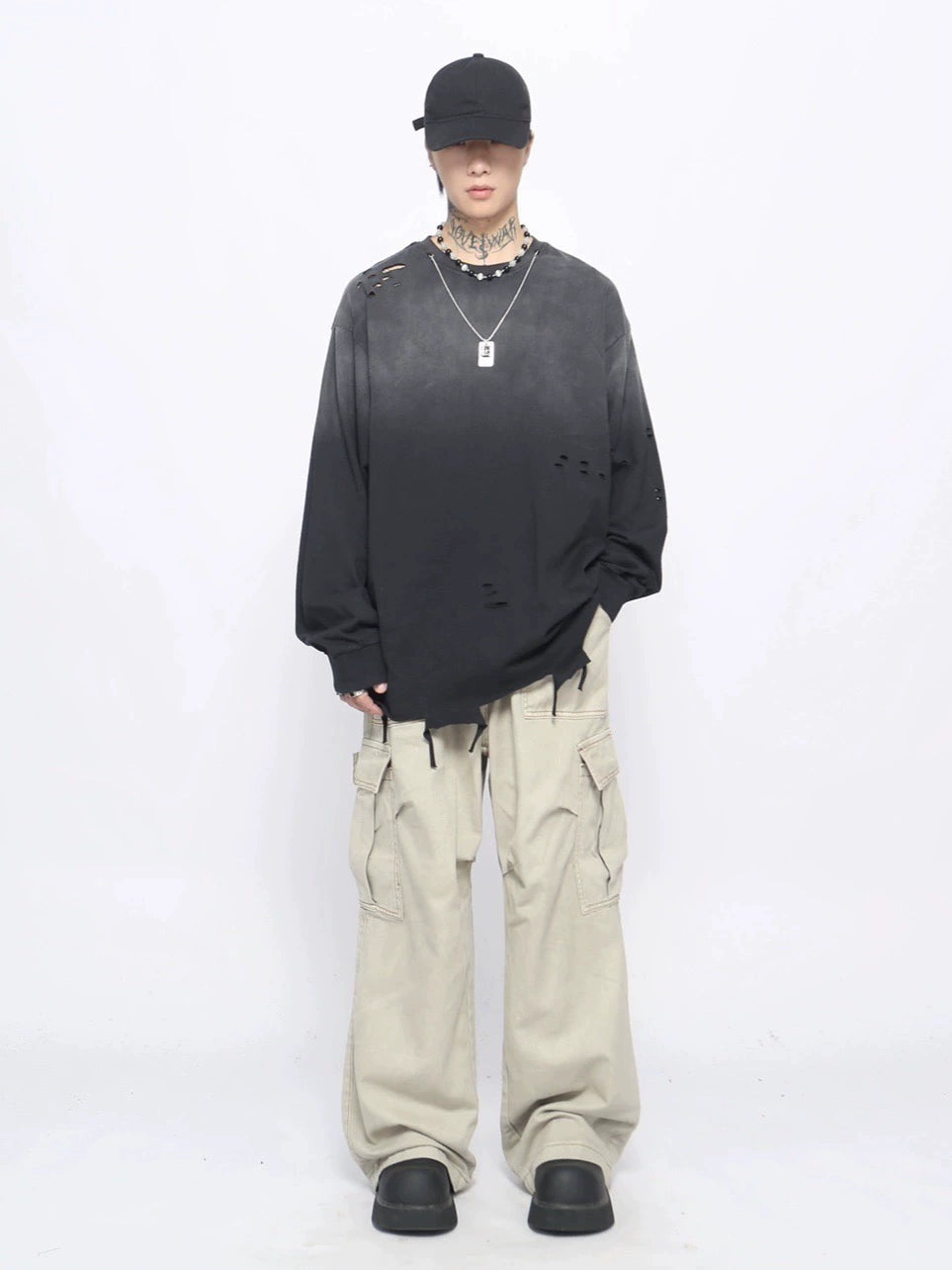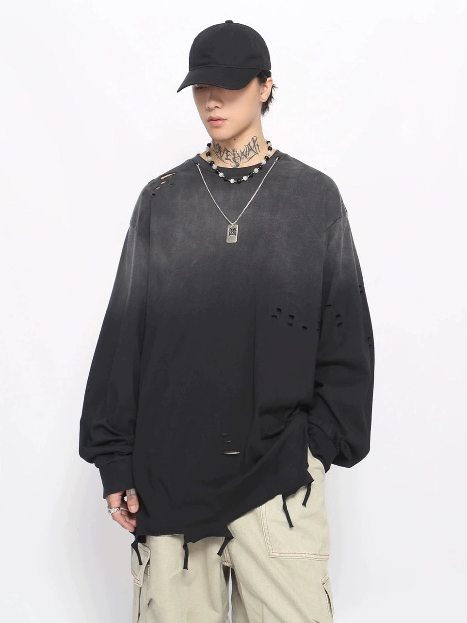 Washed Damage Hem Long Sleeve T-Shirt WN10887