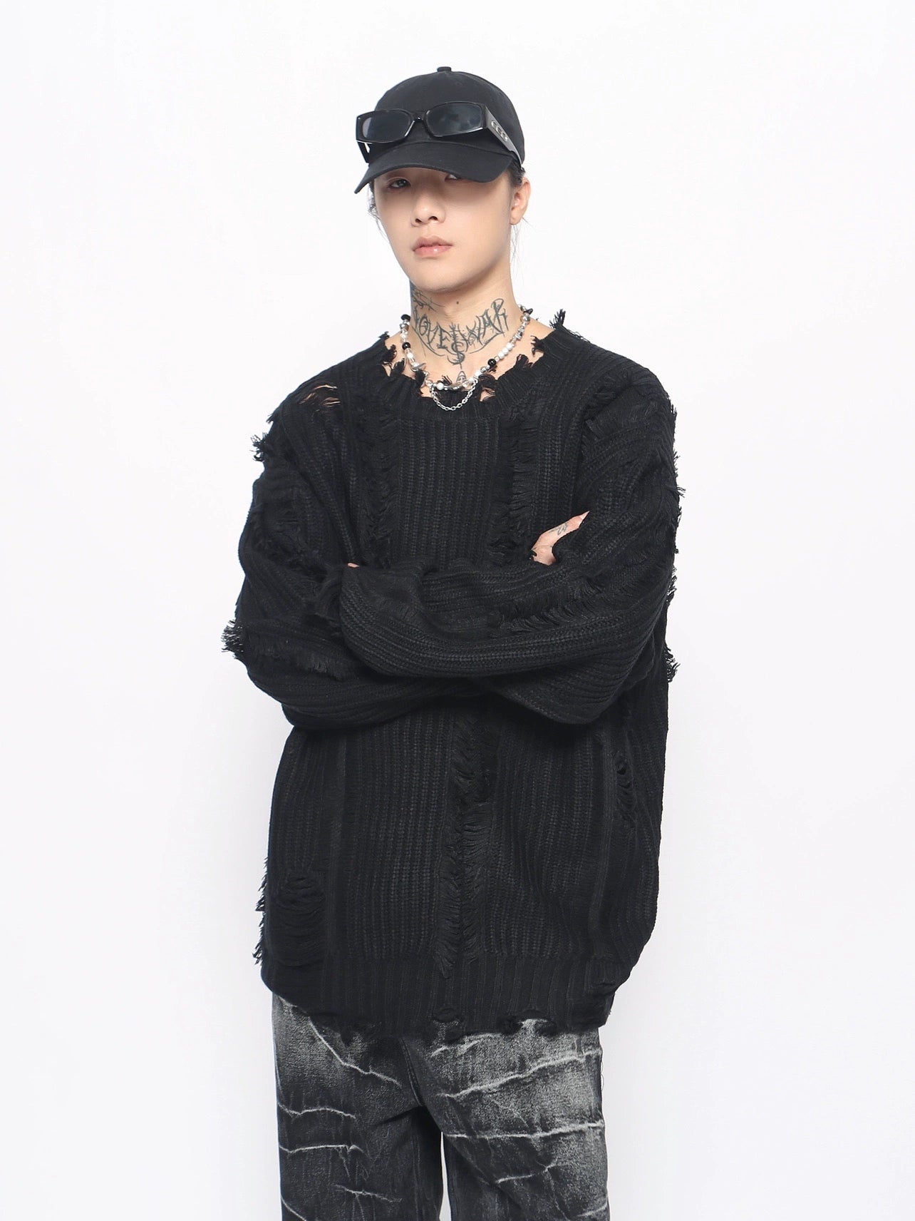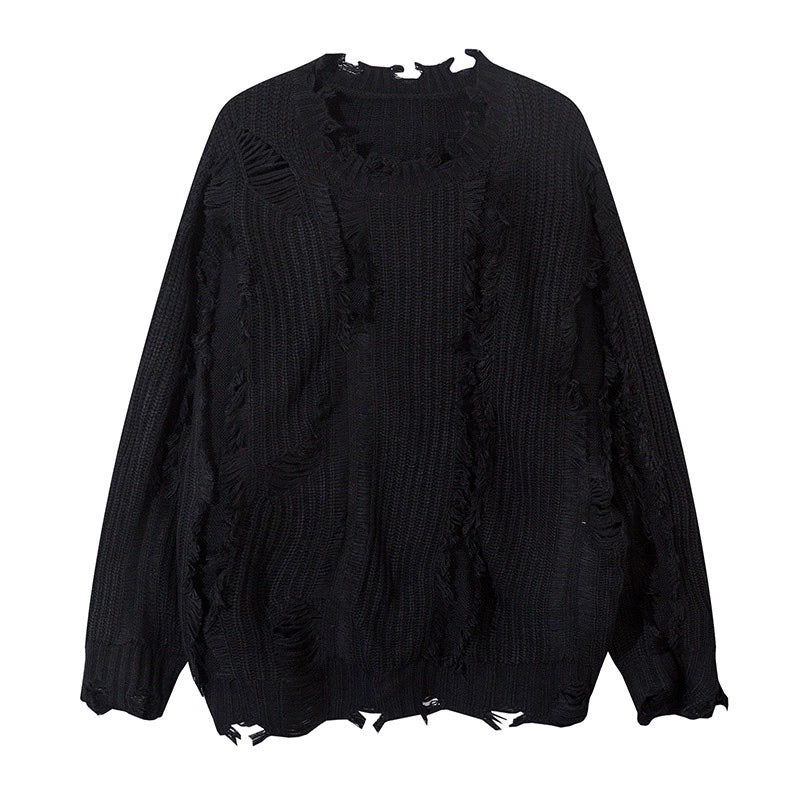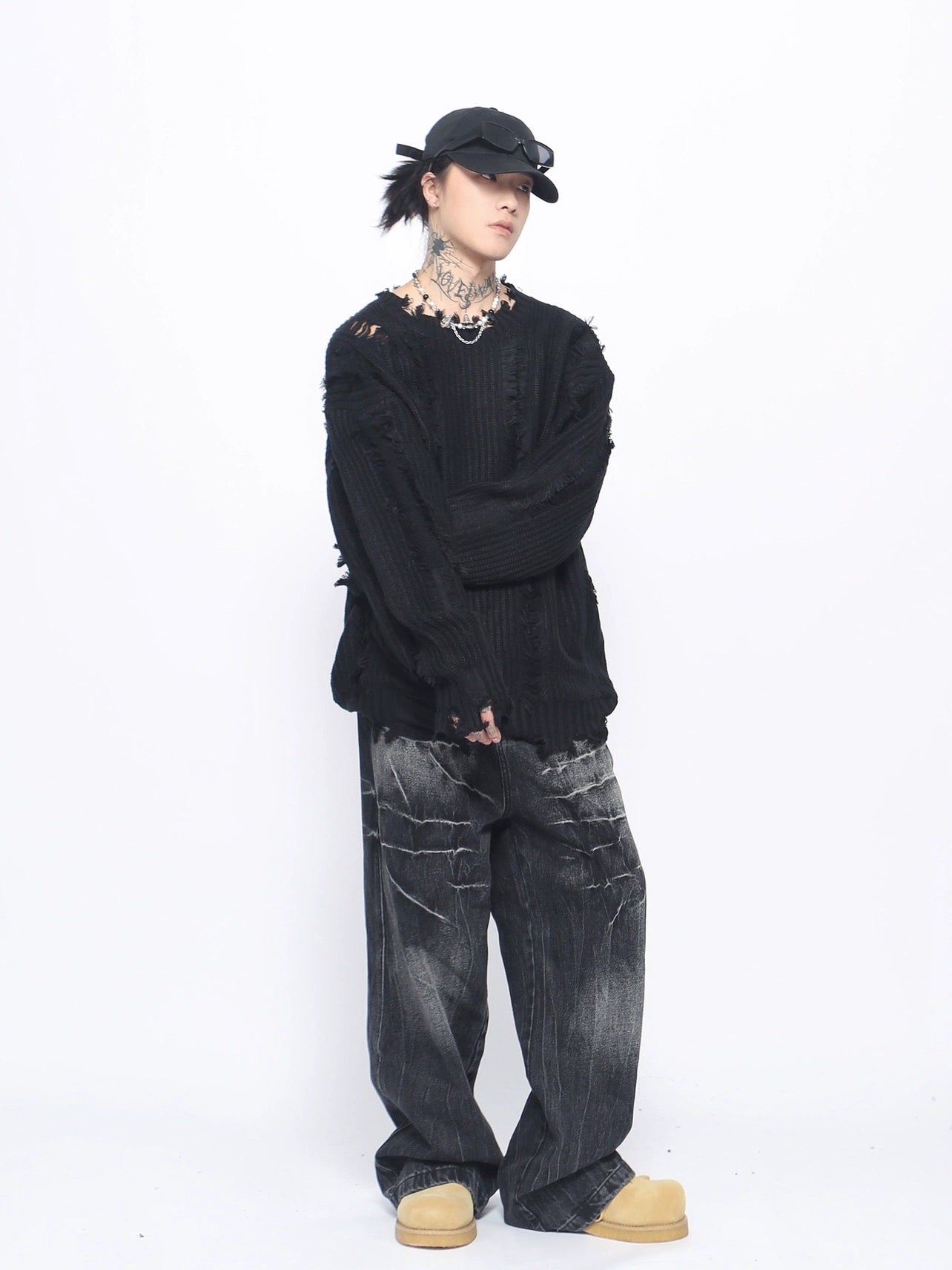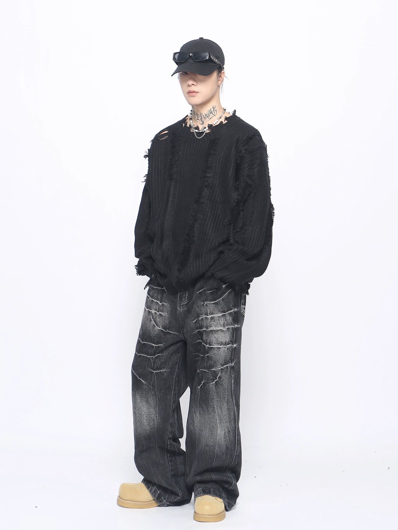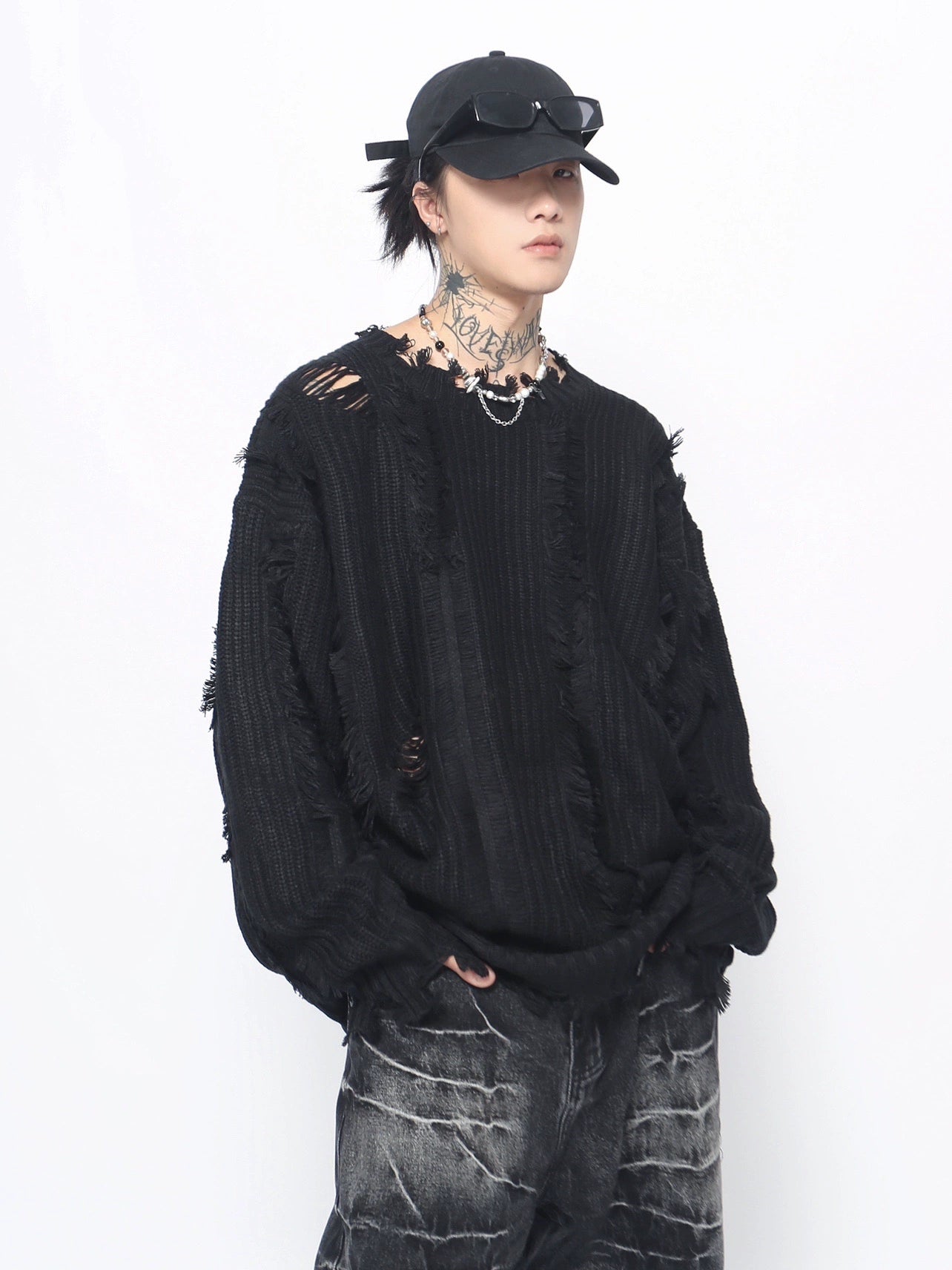 Damage Fringe Detail Asymmetric Oversize Knit Sweater WN10905