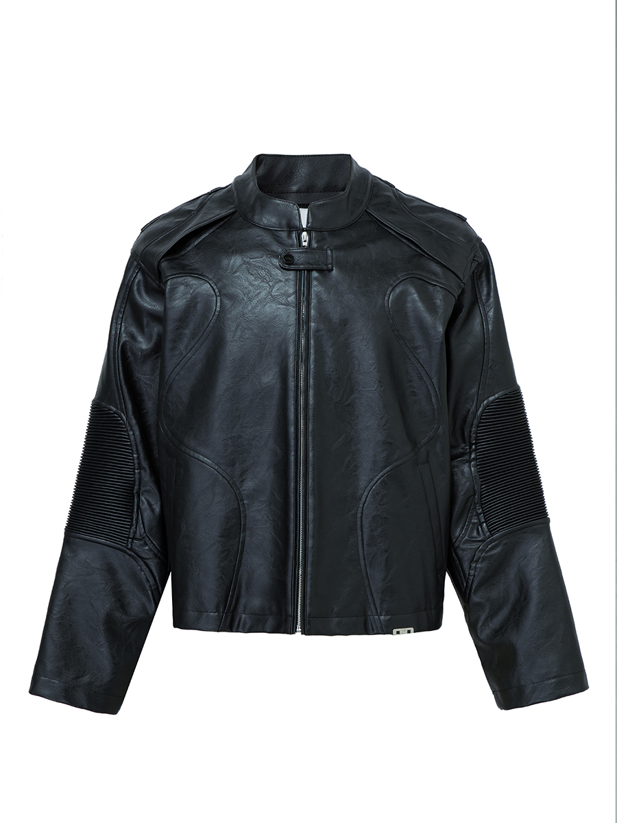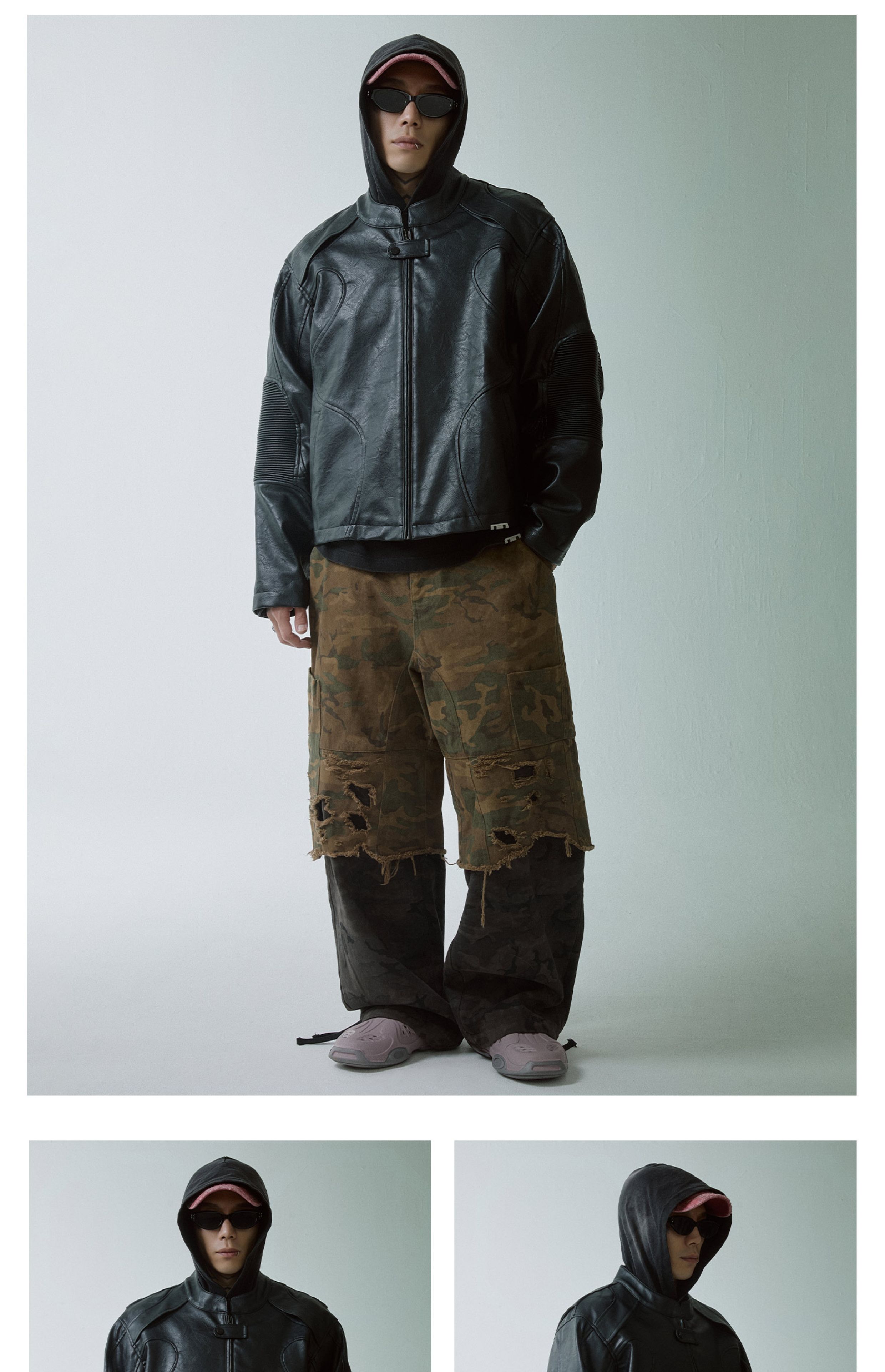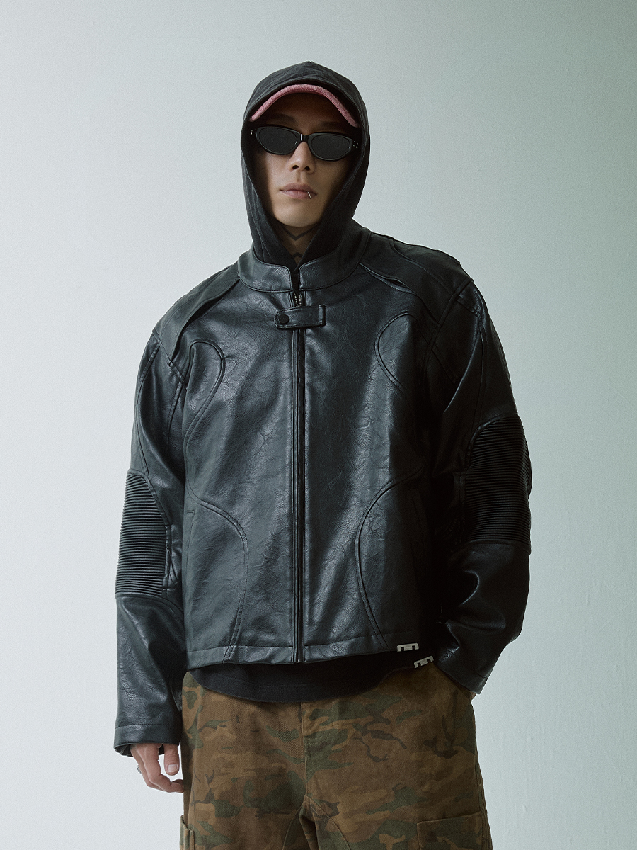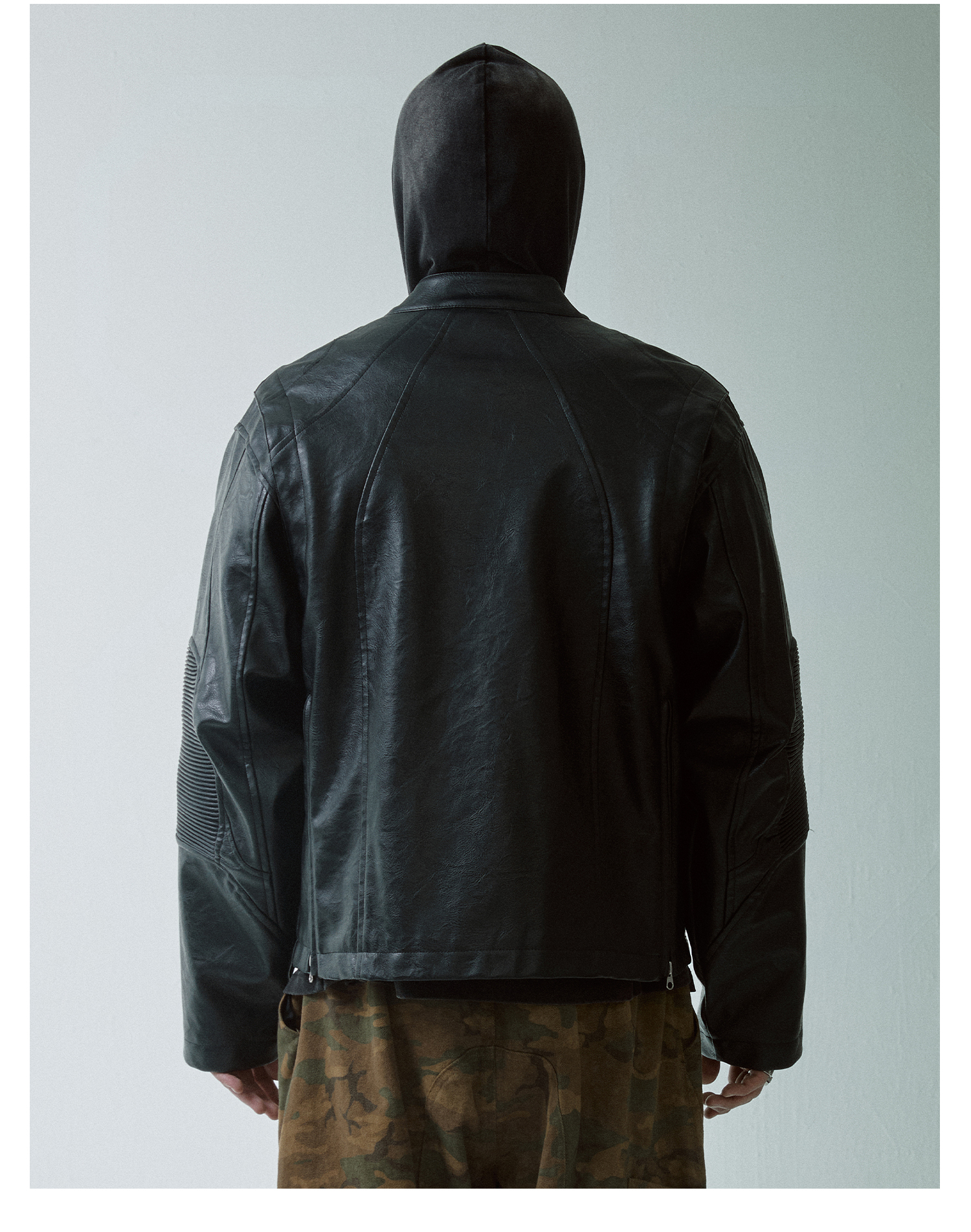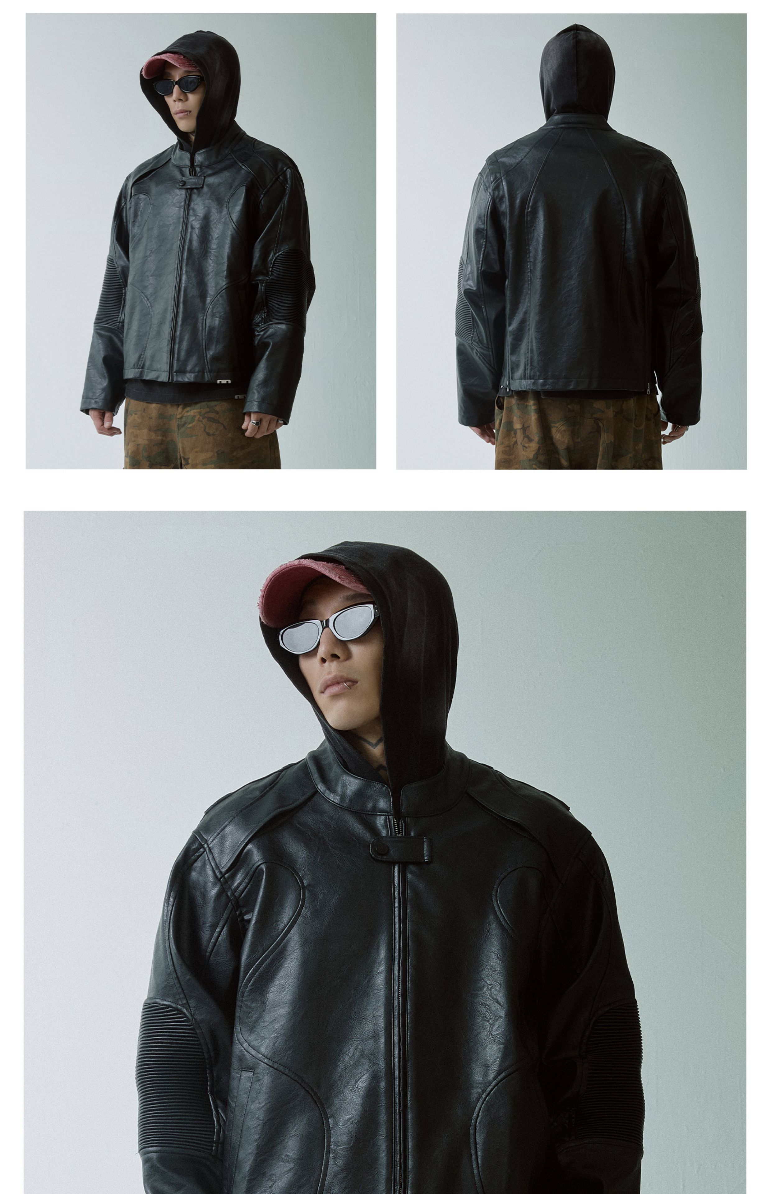 Deconstructed Patchwork Heavyweight High-Neck PU Leather Jacket WN12170